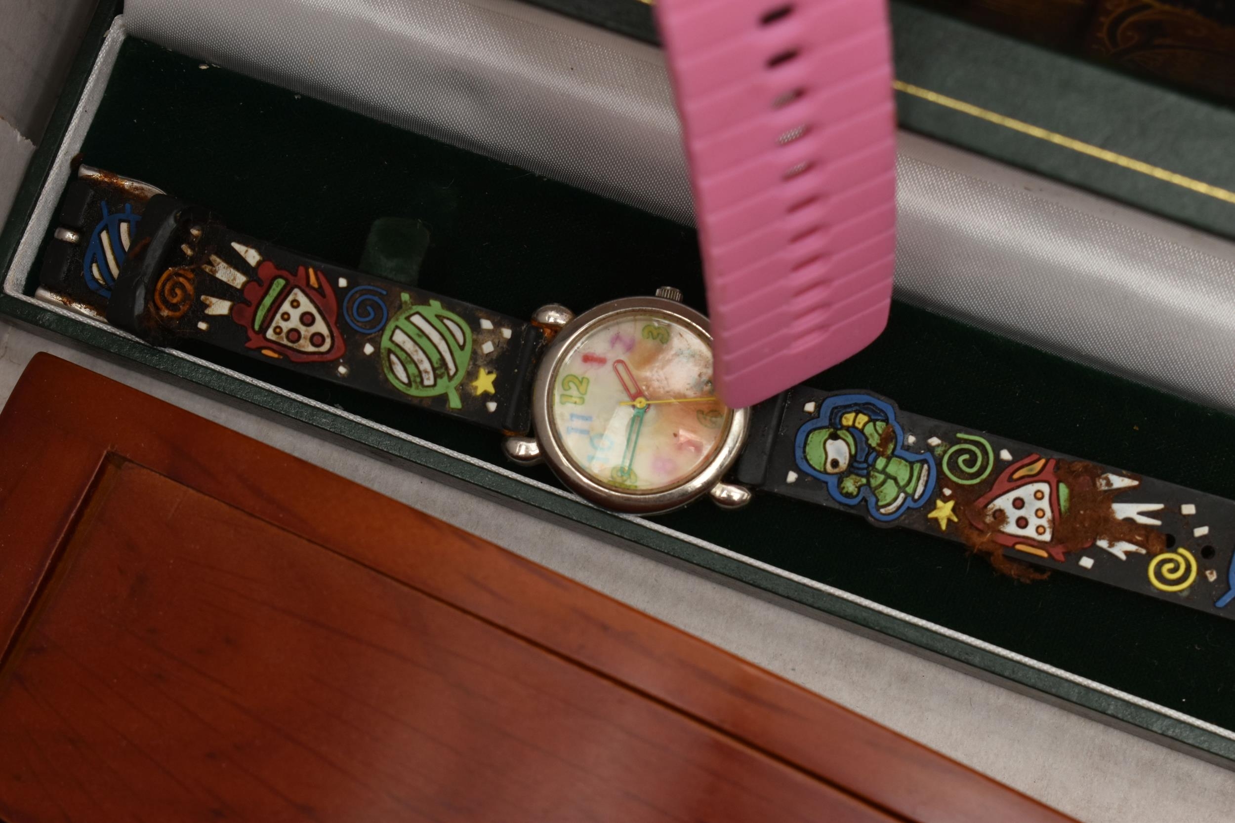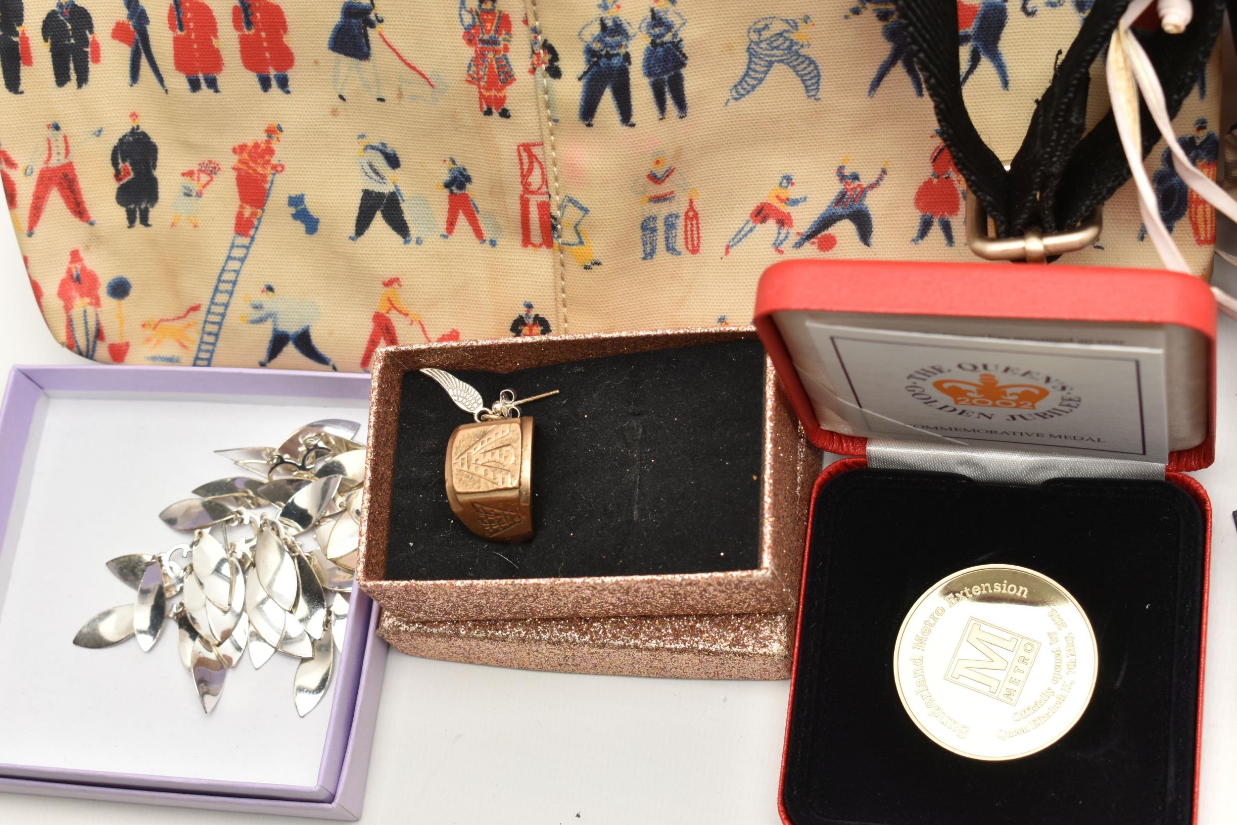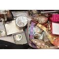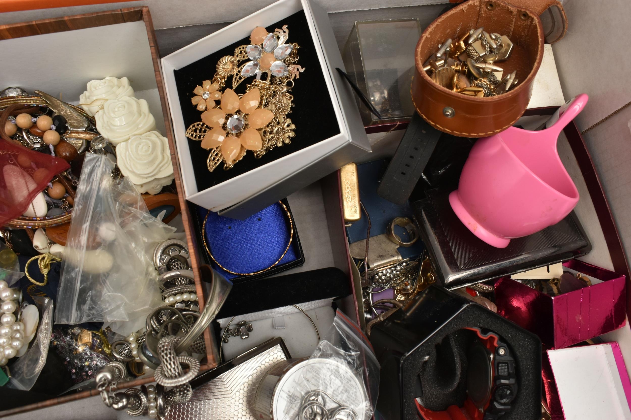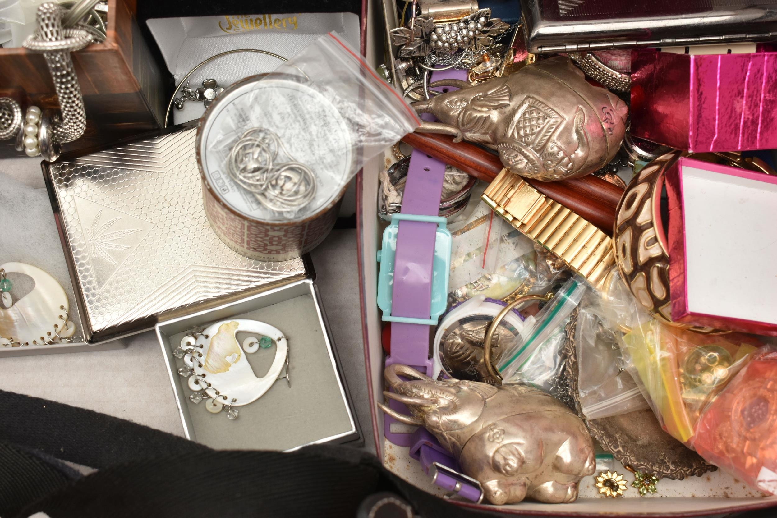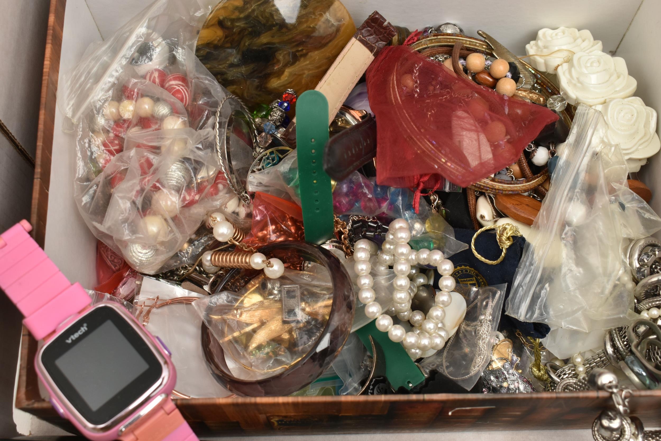 A BOX OF ASSORTED ITEMS, to include a selection of costume jewellery and fashion watches, two fabric Radley bags and other assorted items