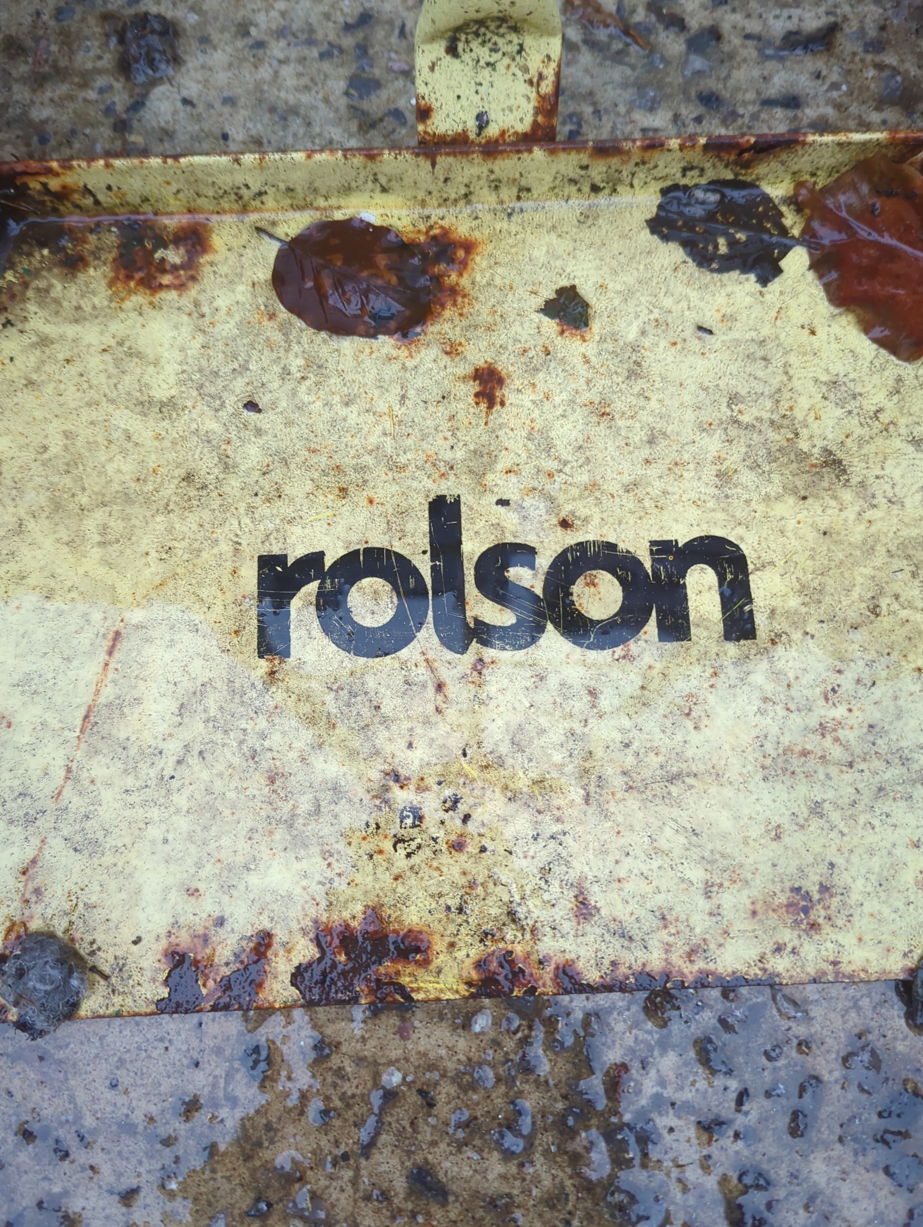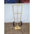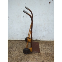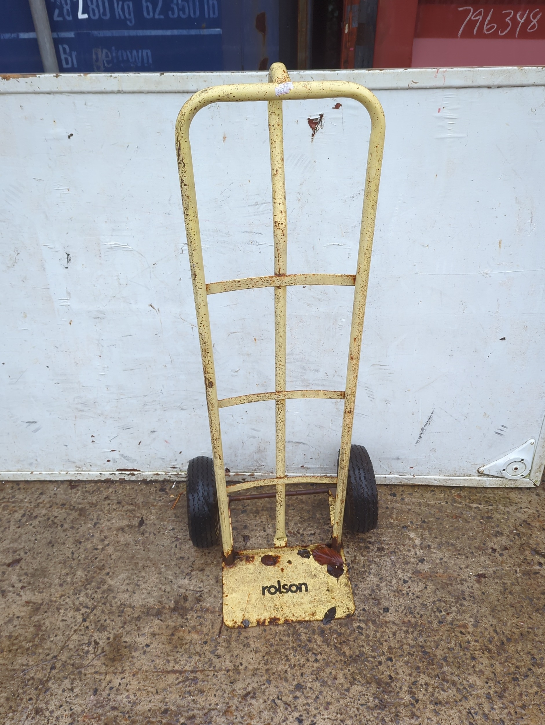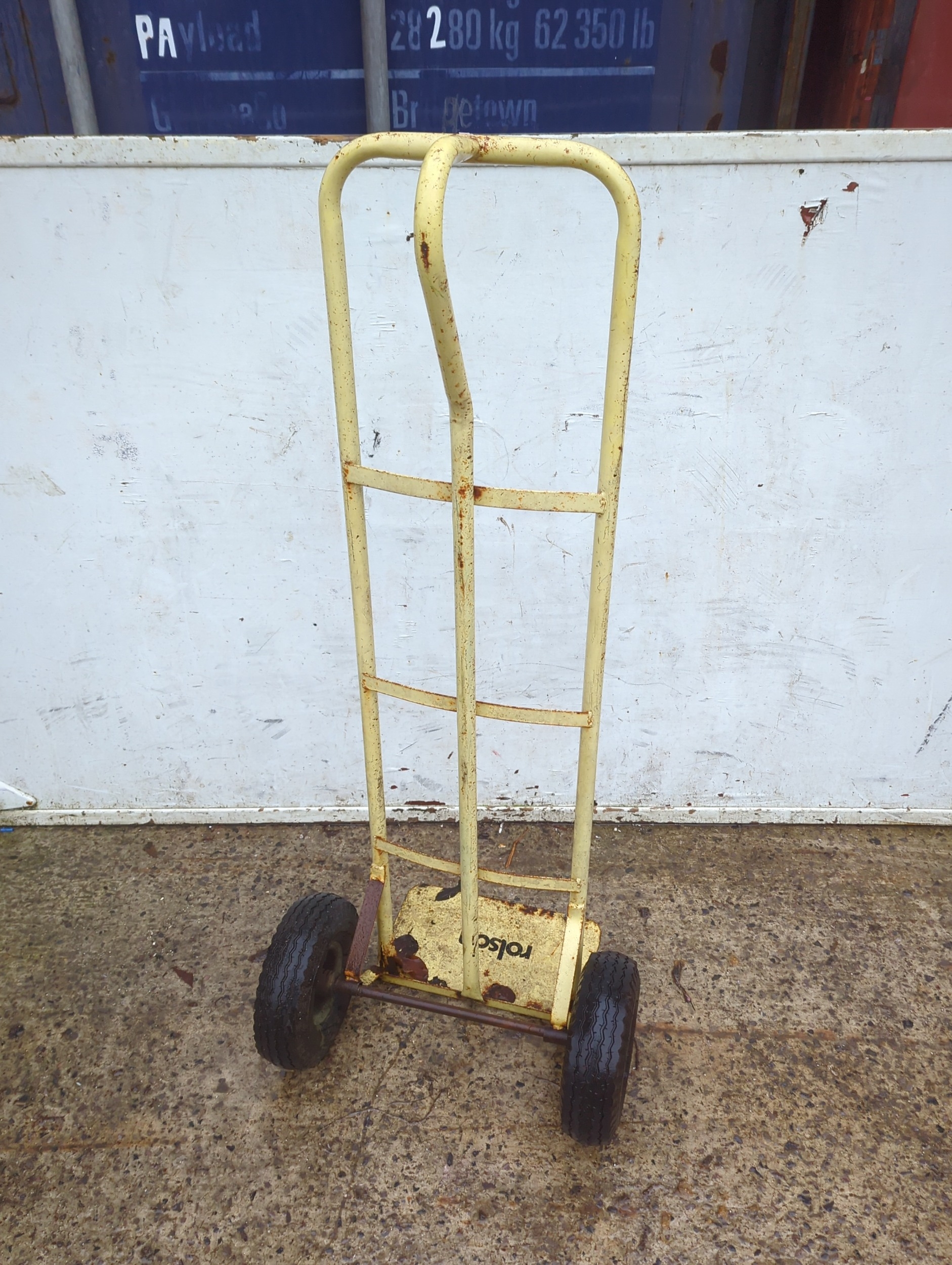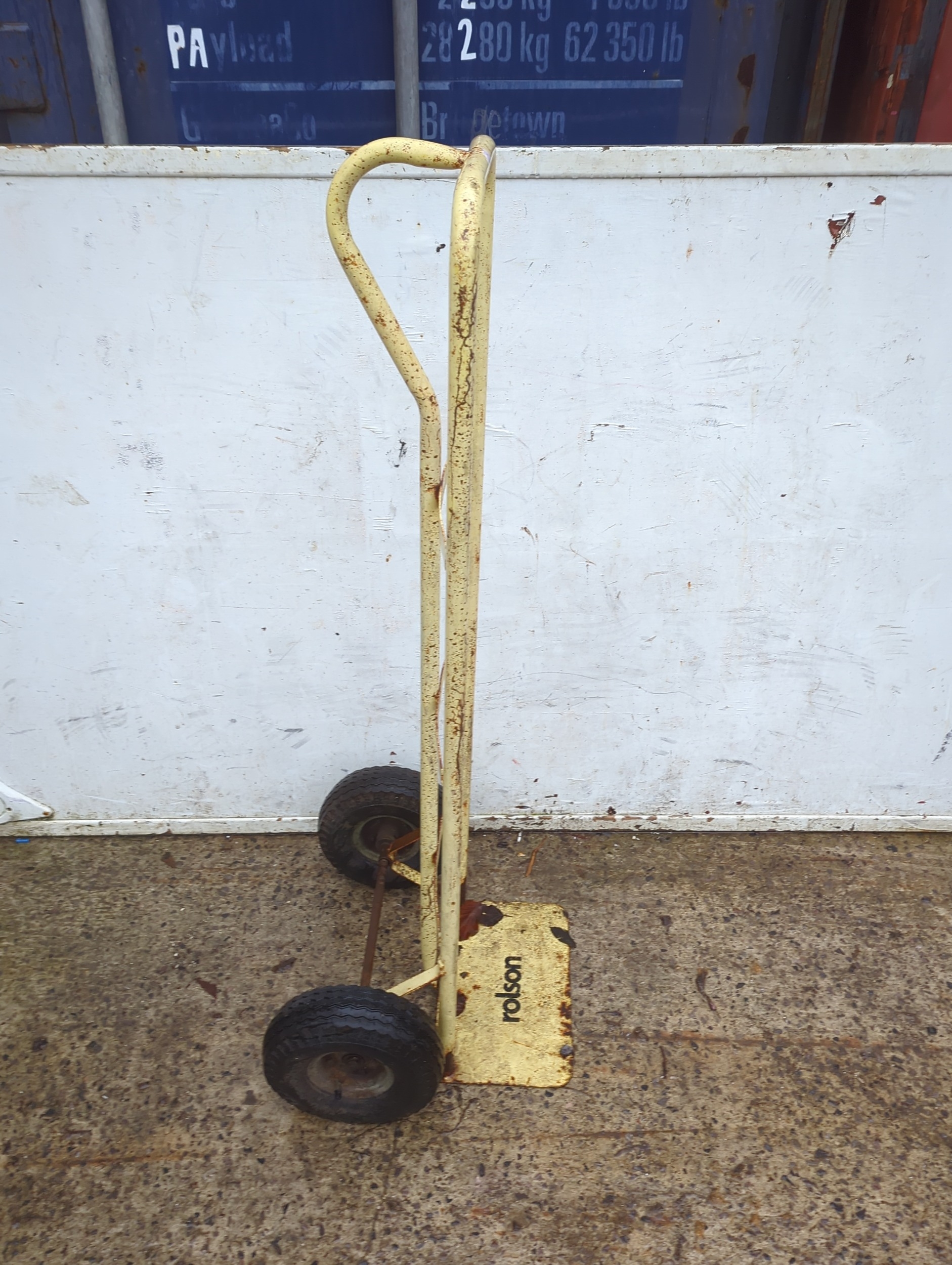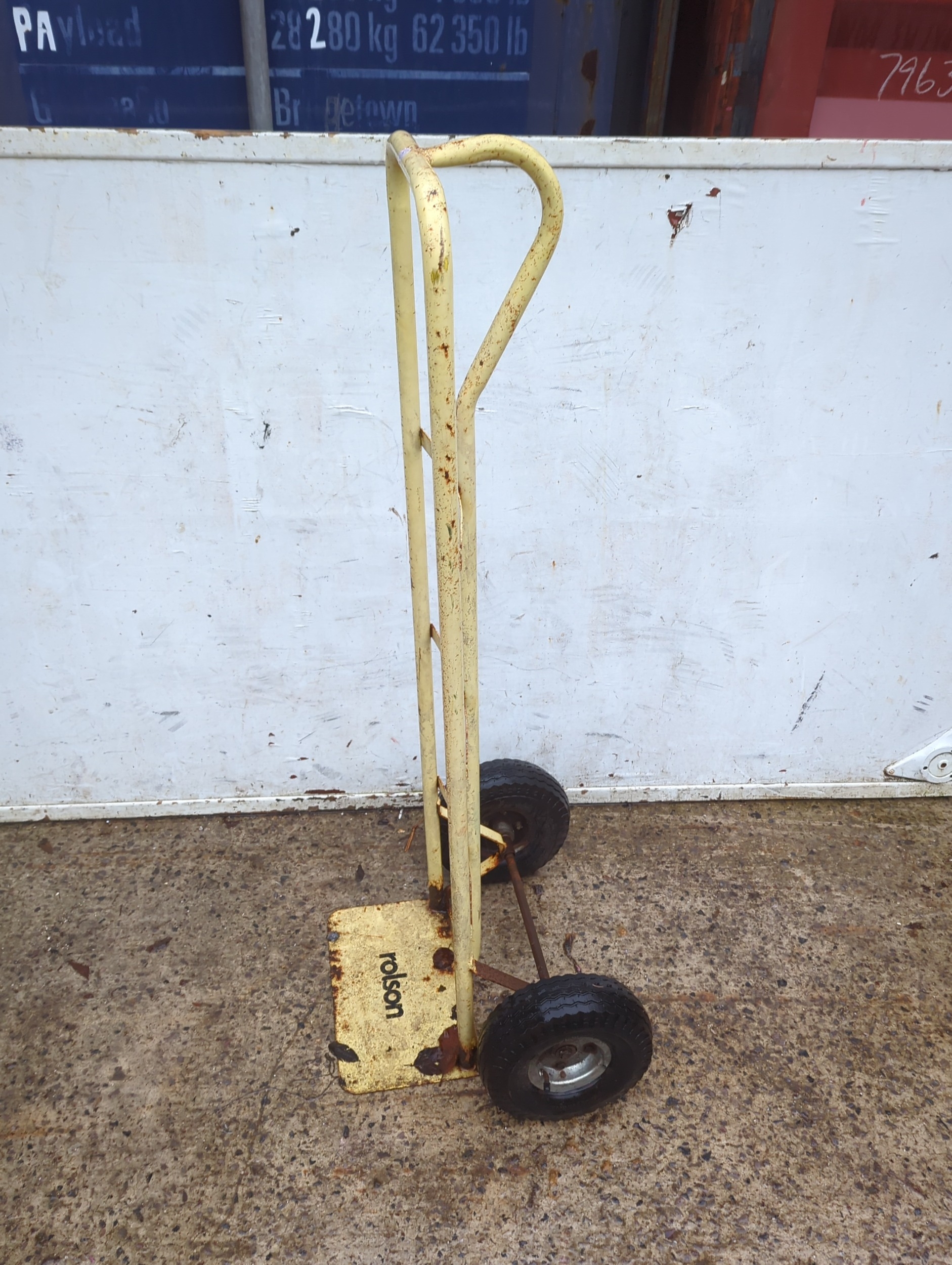 This is a Rolson-branded trolley designed for ease of movement in transporting items. It features a sturdy metal frame with a handle for maneuvering, and two durable wheels for stability. The trolley is painted in a faded yellow colour, providing a utilitarian appearance. Its compact design makes it suitable for a variety of environments. The metal construction suggests durability for heavy-duty use.