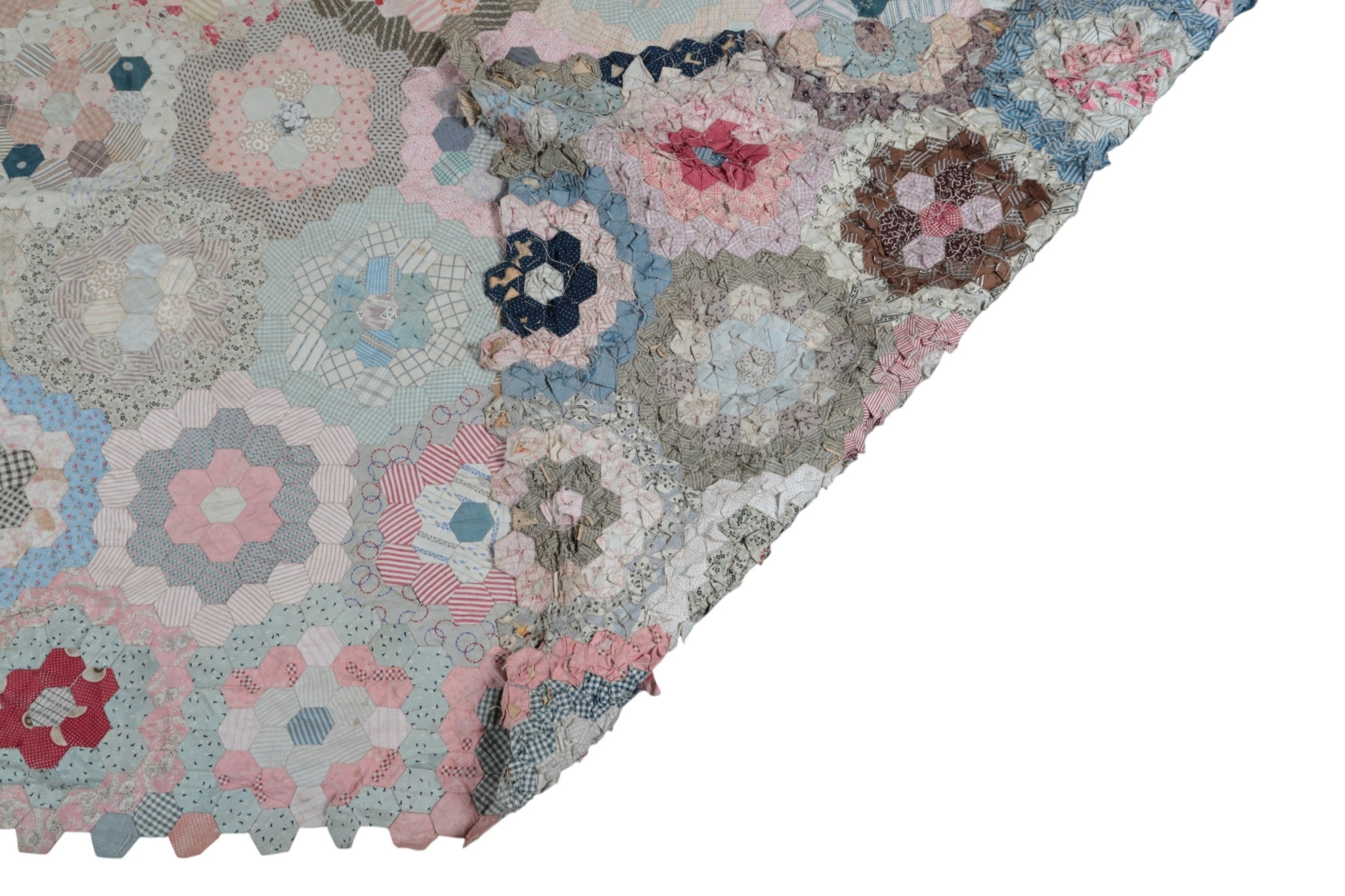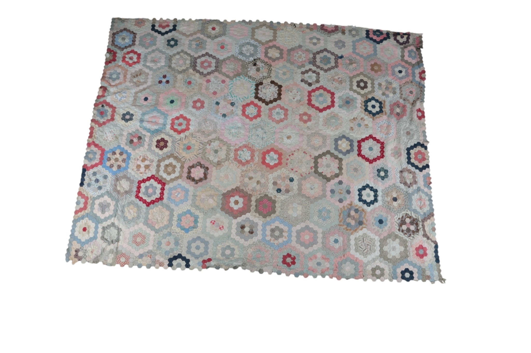 A large 19th Century "Grandmothers Flower Garden" patchwork cotton bed cover, sewn with hexagonal patches of fine printed cottons of the day to form flower shapes, 288cm x 244cm.