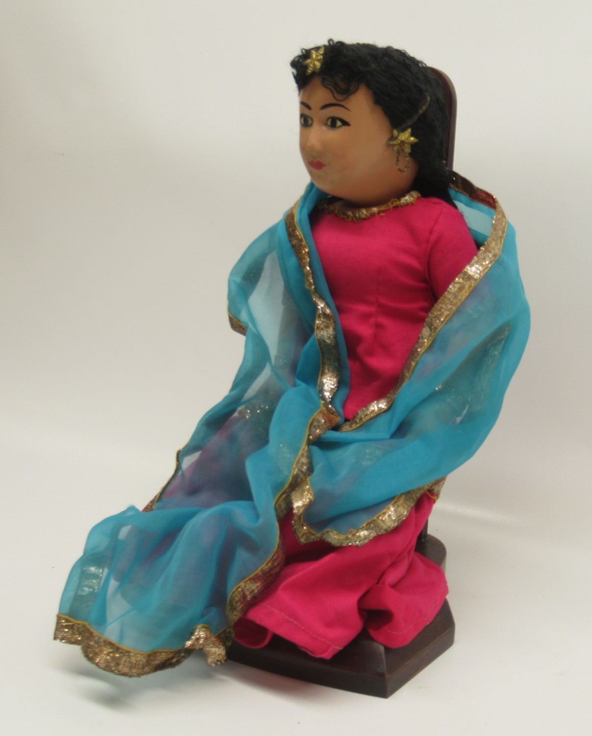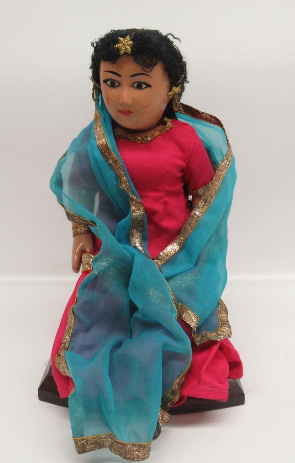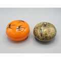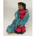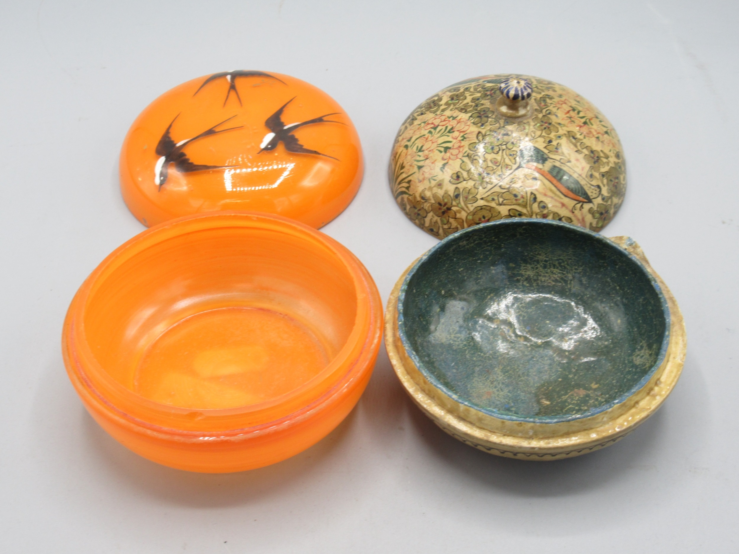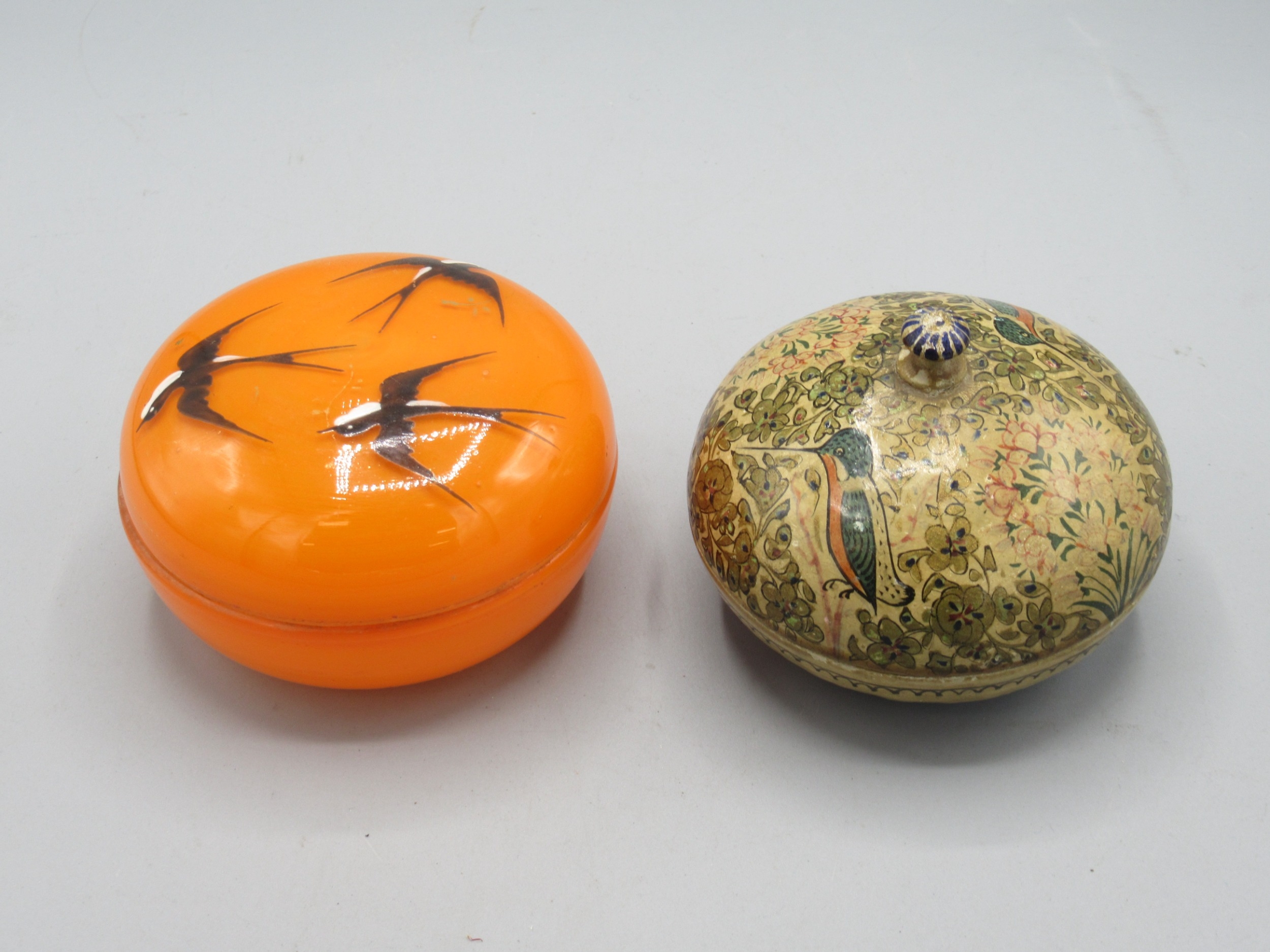 20th Century Indo-Persian doll, H30cm in original box and Indo-Persian papier Mache lidded dressing table pot, decorated with kingfishers, D10cm; mid 20th Century orange tinted dressing table jar with enamel decorated lid of three swallows, D11cm