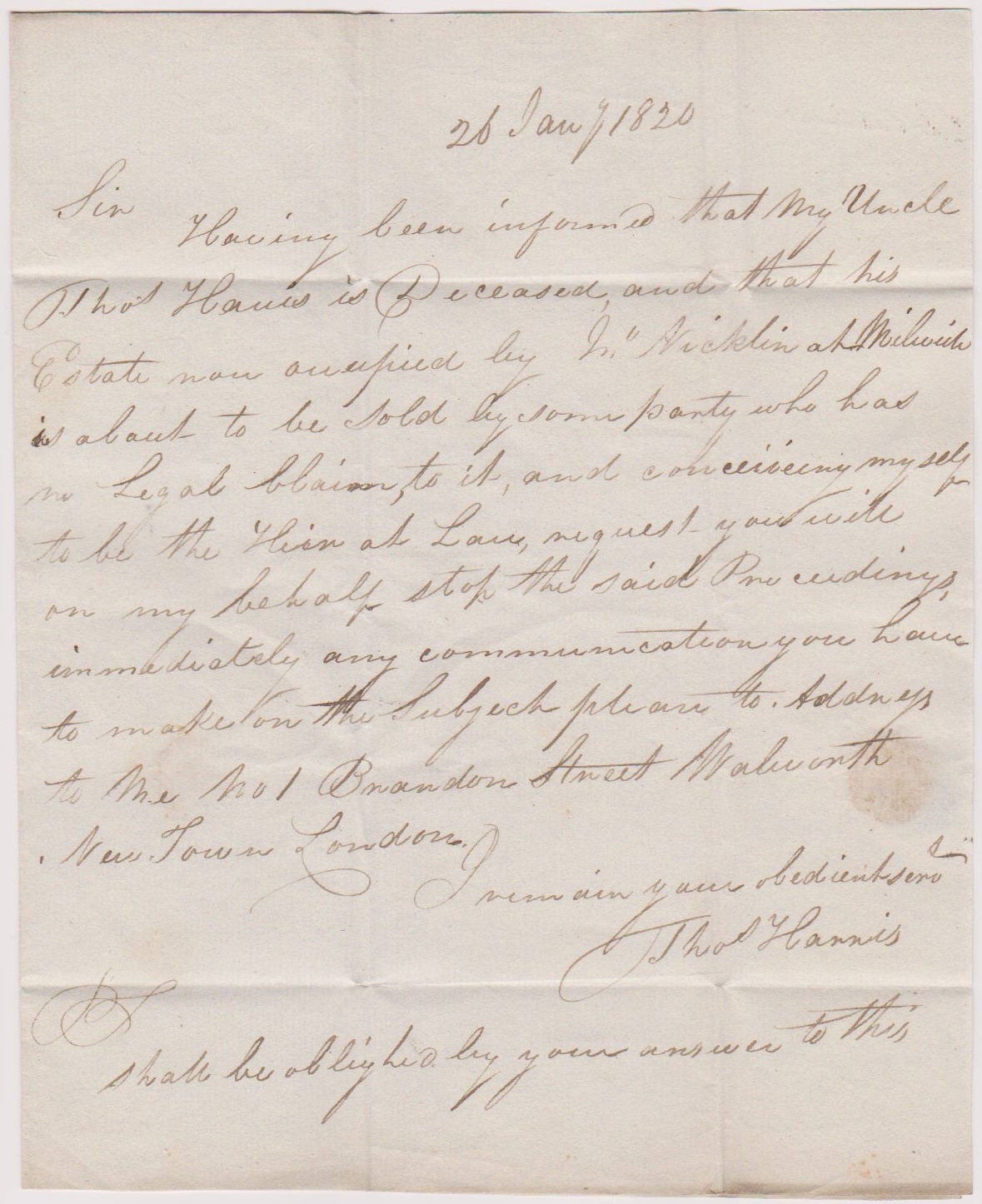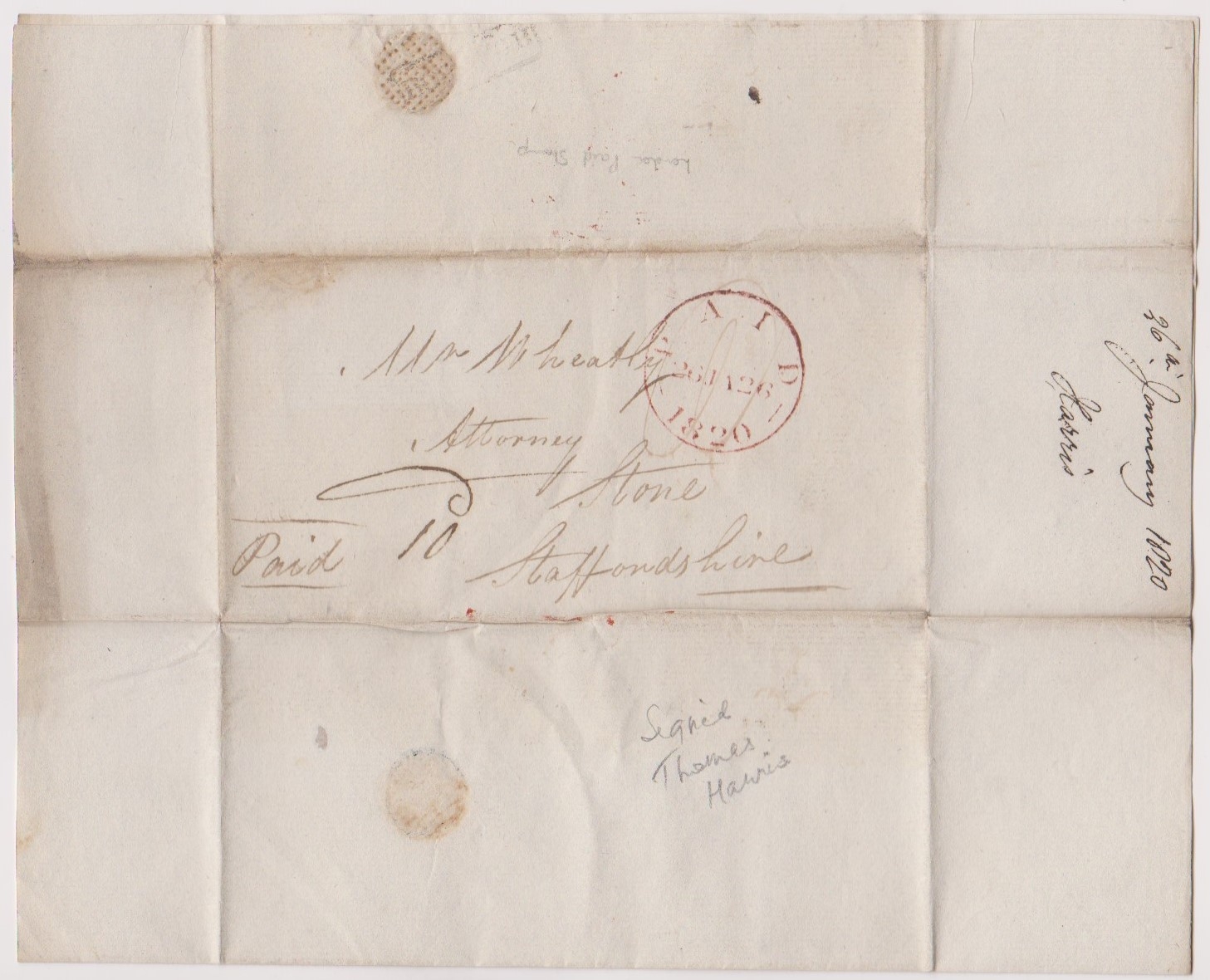 Great Britain 1820-EL dated 26th Jan 1820-posted to Stone Staffs-manuscript paid and 10 large red sing circle paid/26JA26/1820 cancel