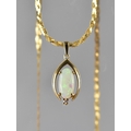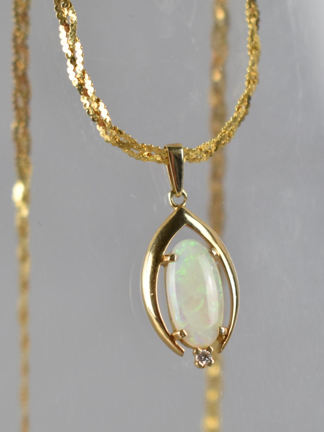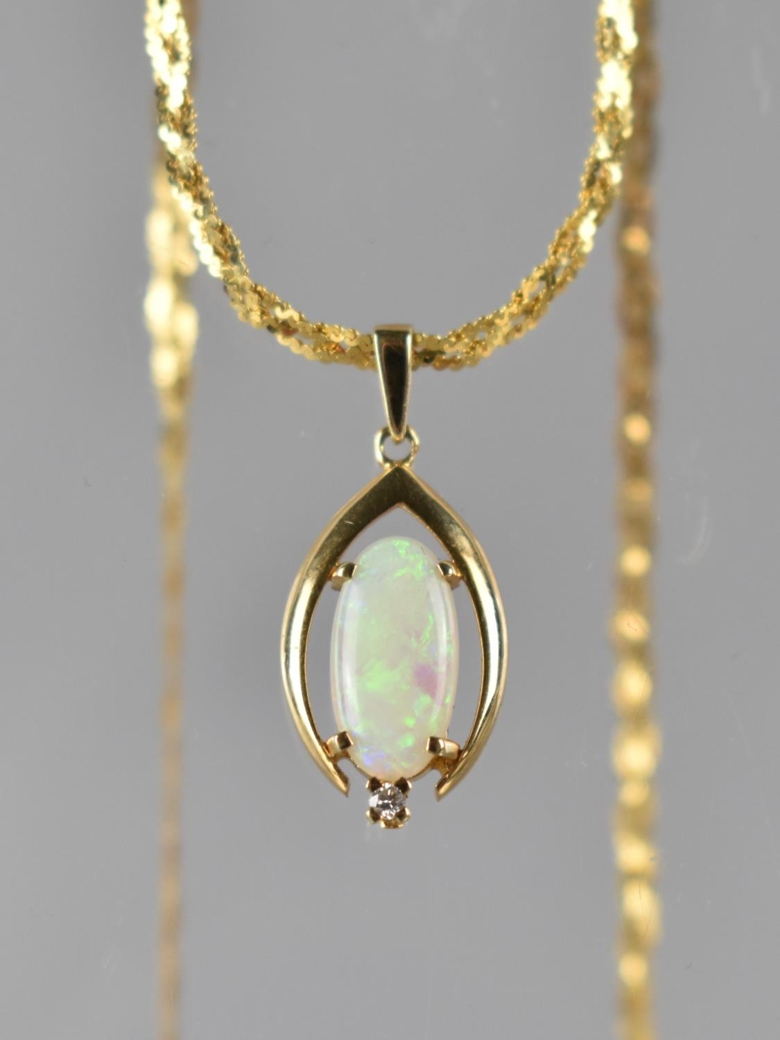A 14ct Gold Mounted Opal and Diamond Pendant, Oval Opal Cabochon 12mm by 6mm in Four Claws with Small Round Brilliant Cut Diamond to Base, Stone Measuring 1.7mm Diameter Mounted in Stylised Wishbone Frame, Suspended on a Plaited 14ct Gold Chain, Total Weight 4.6gms