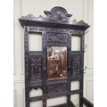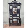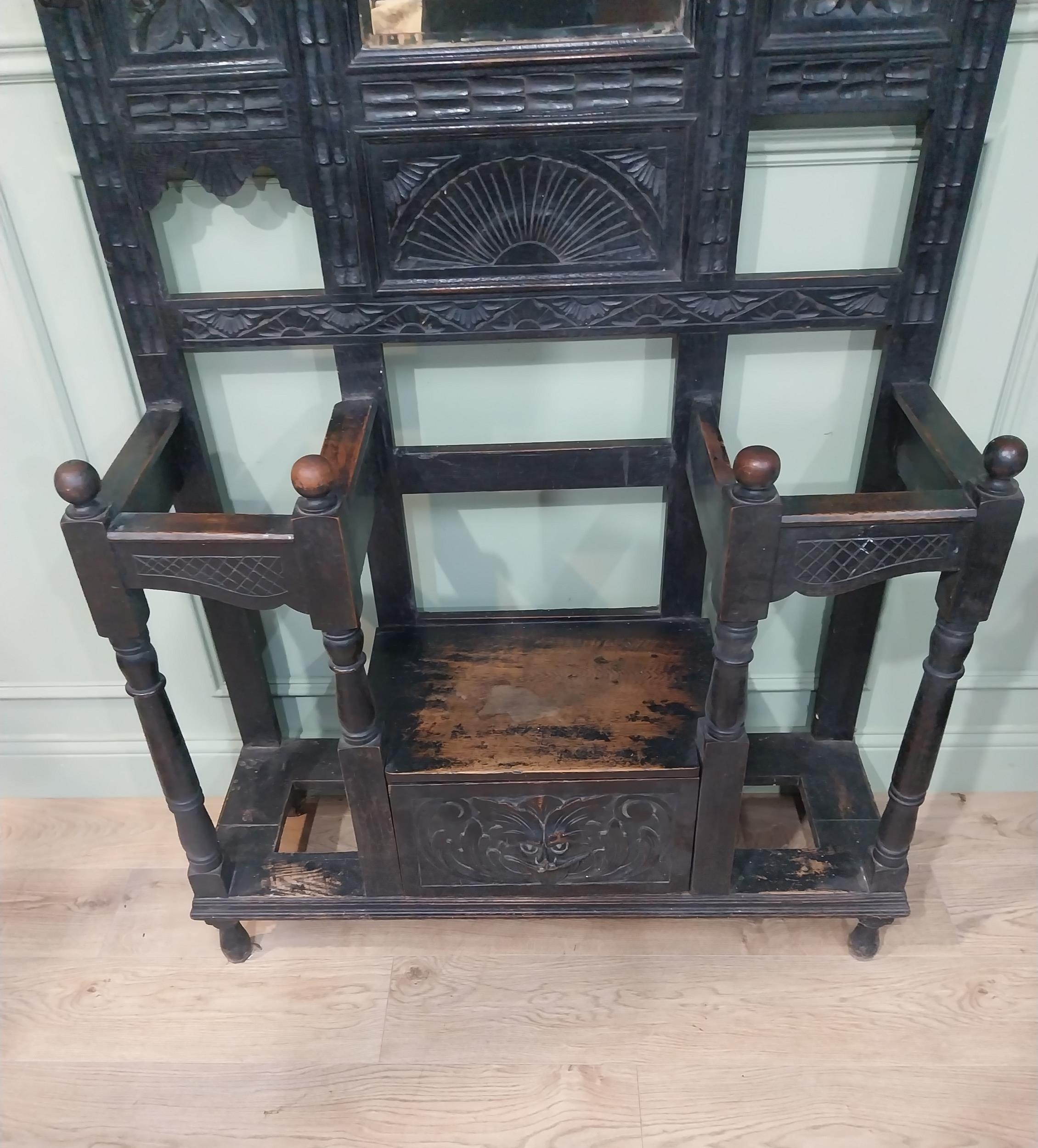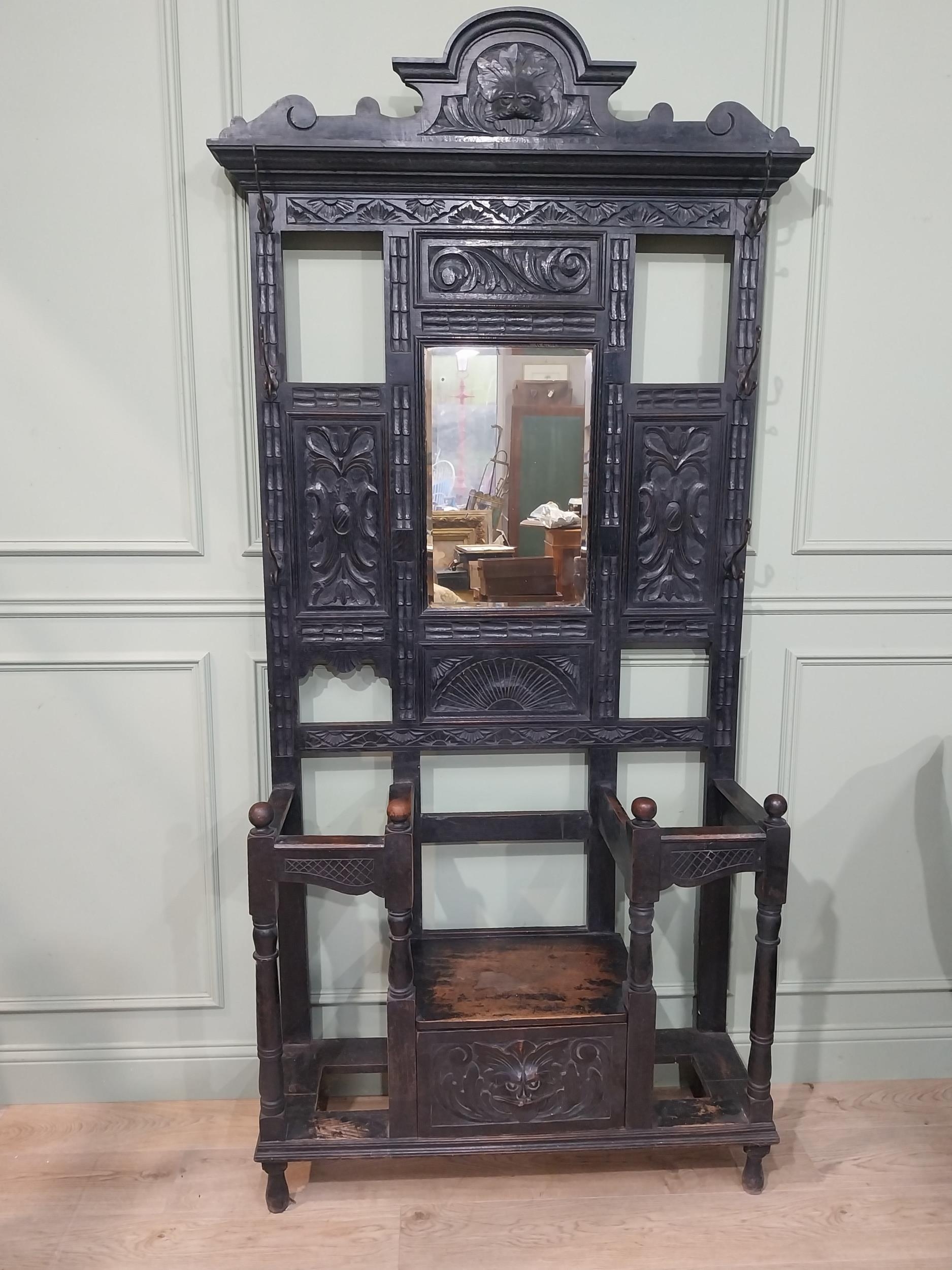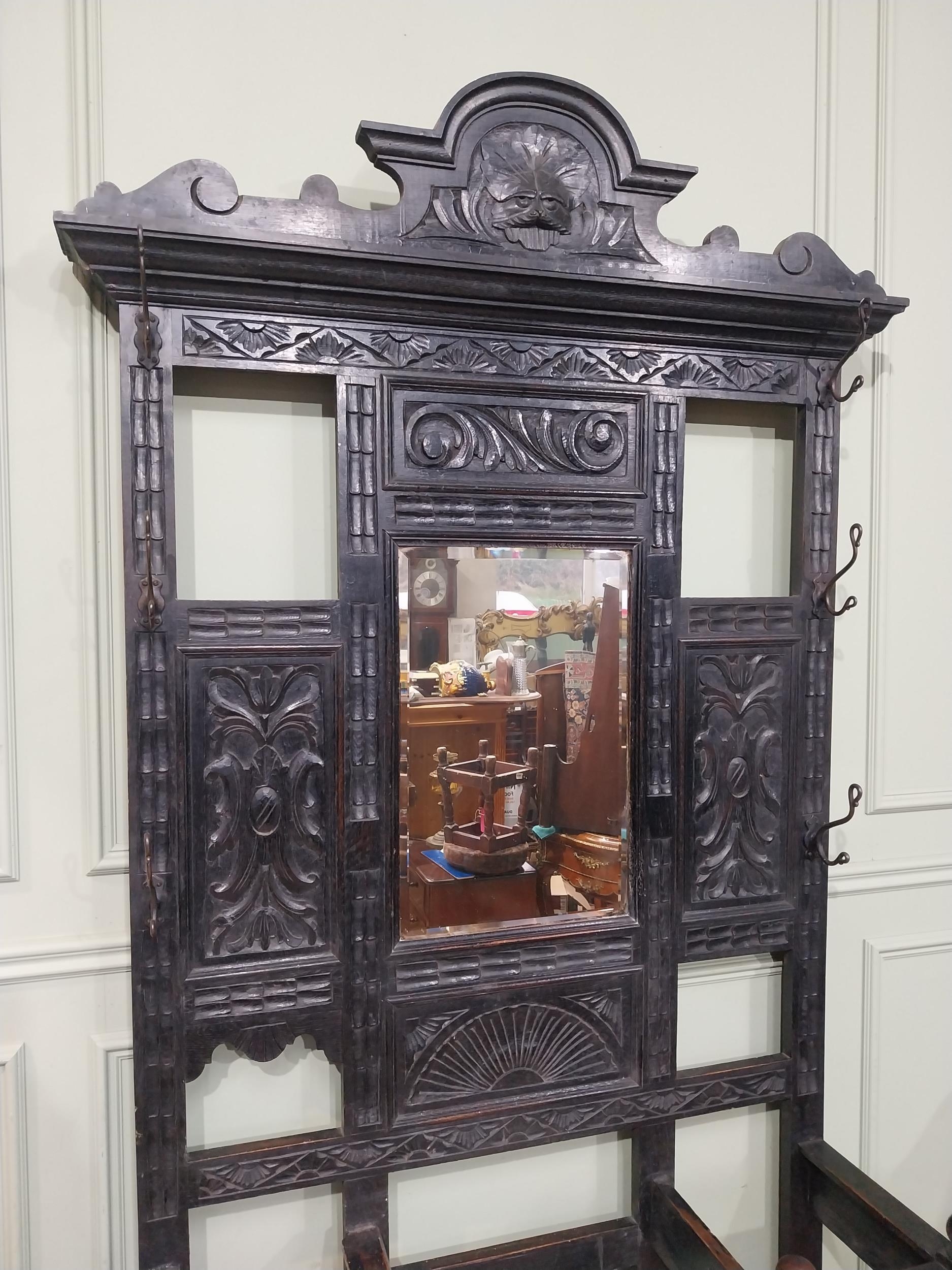 Victorian carved oak hall stand with monk's bench seat. {239 cm H x 106 cm W x 40 cm D}.