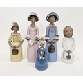 Five Elbogen (Sweden) stoneware figures of ladies, in sizes, all inscribed in black Elbogen/Handmade, painted incised painted initials comprising two tall figures, one holding a basket the other a bunch of flowers, two medium sized with baskets and a smaller pierced example wearing blue dress, 31cm high max (taller figure cracked and repaired through the neck) (5)