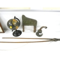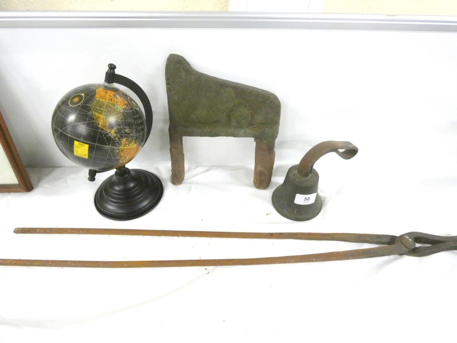 Antique boot scraper, hand bell, blacksmith's tongs and a globe.