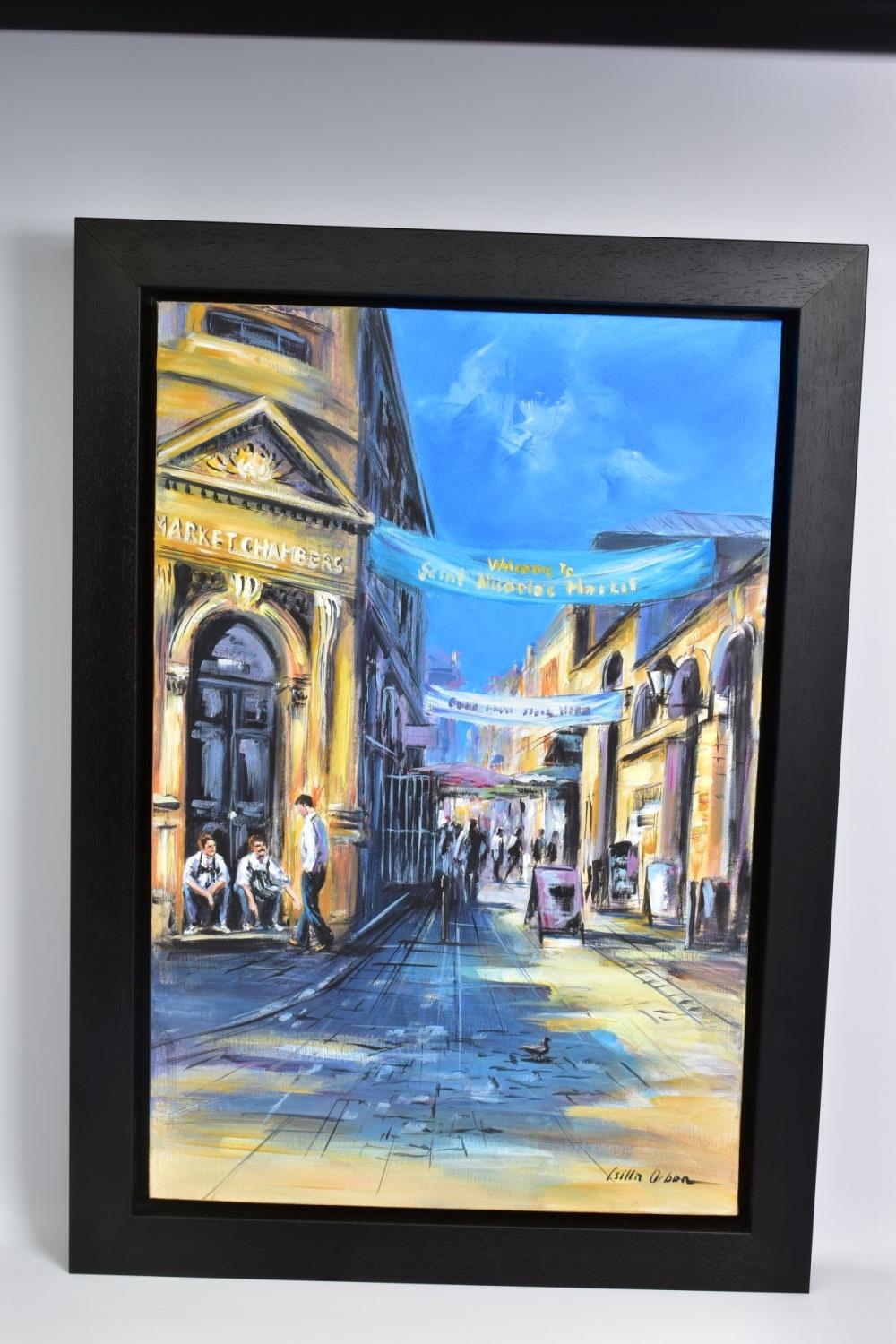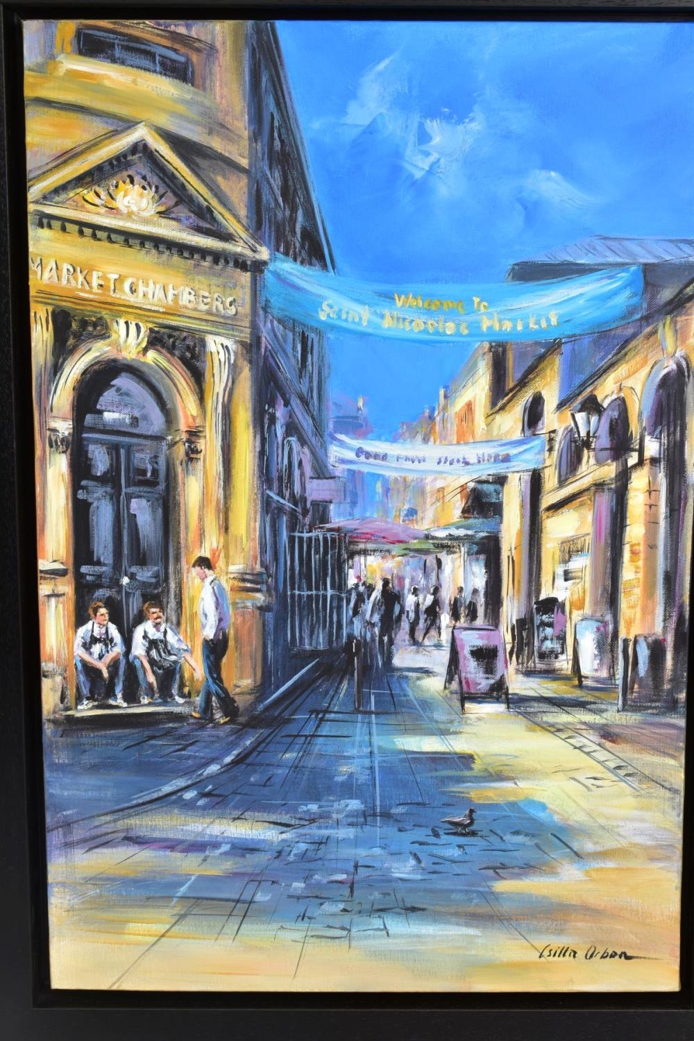 CSILLA ORBAN (HUNGARY 1961) 'BRISTOL III', early evening in Bristol Old Town, signed bottom right, oil on canvas, framed, approximate sizes: image 76cm x 50cm, frame 89cm x 64cm (condition: painting in good condition, small dent to top right corner of frame) (A)