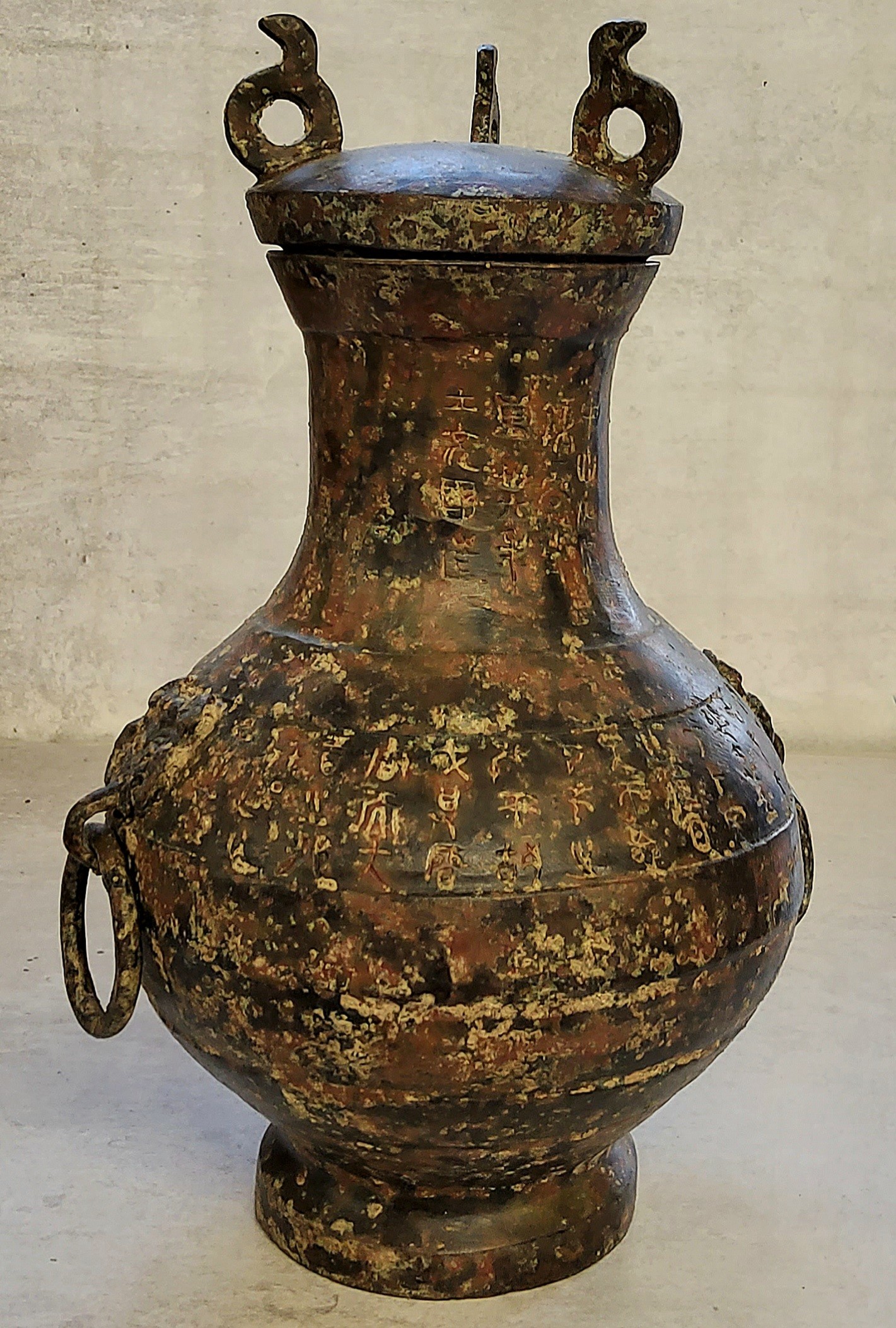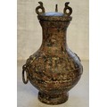 Chinese bronze archaic style temple vase with loop handles, the body engraved throughout with script and character markings, 28cm high
