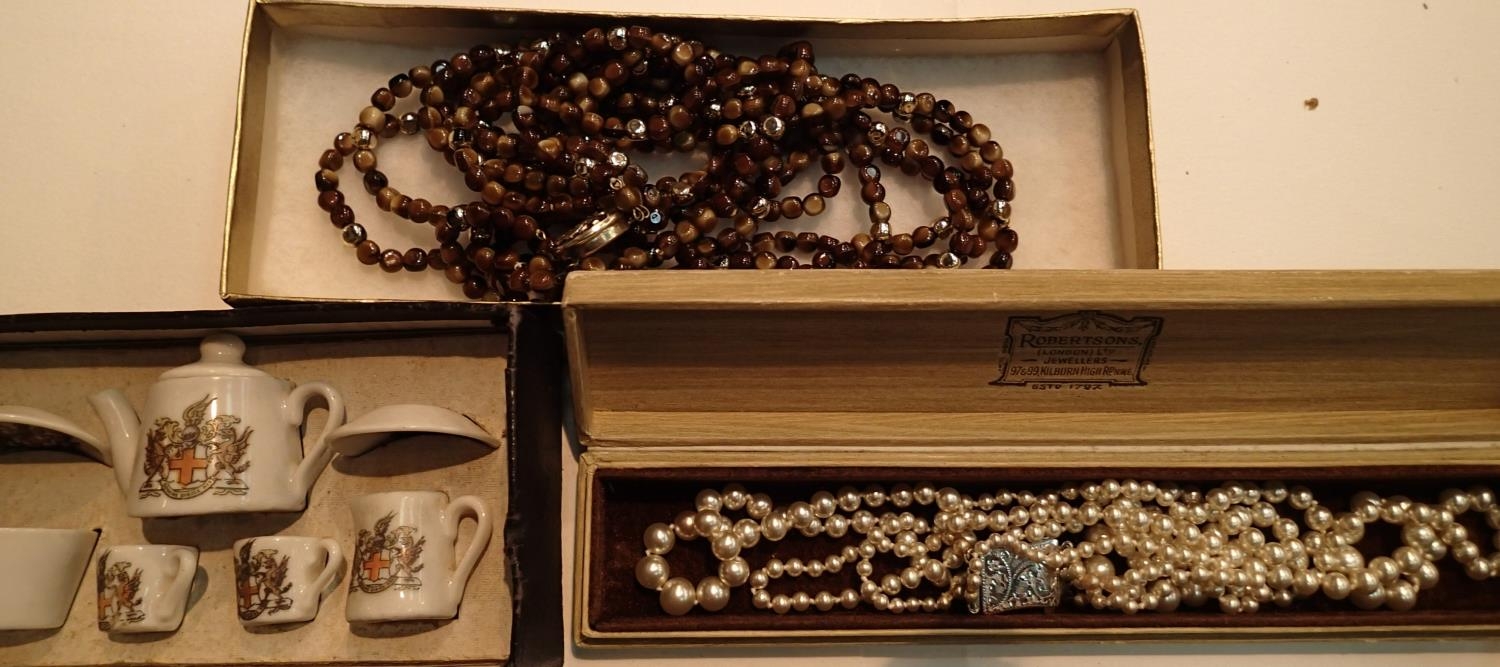 A miniature crested porcelain tea set and costume jewellery. P&P Group 1 (£14+VAT for the first lot and £1+VAT for subsequent lots)