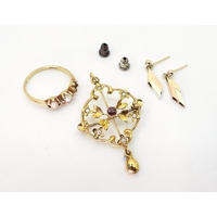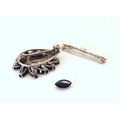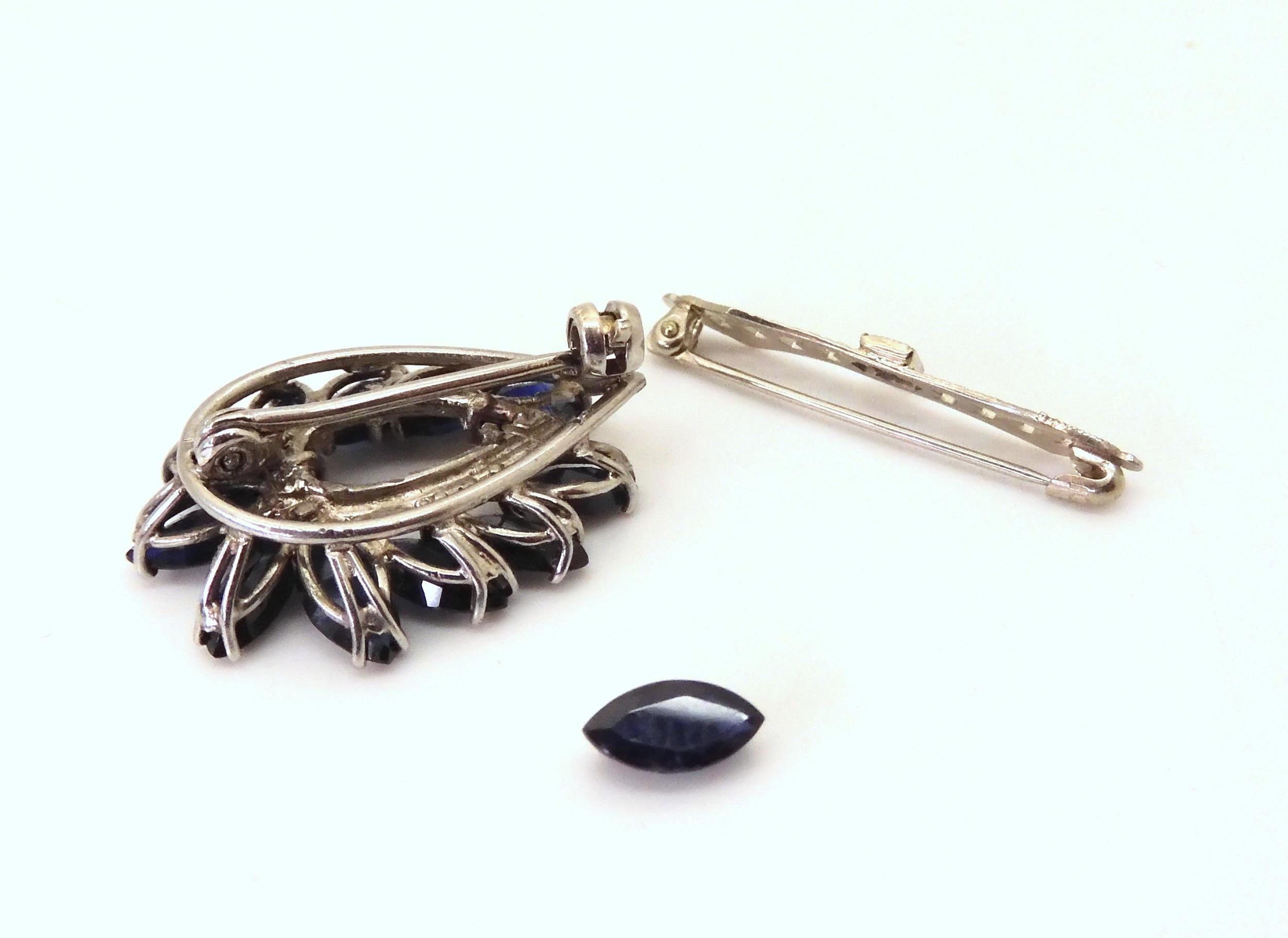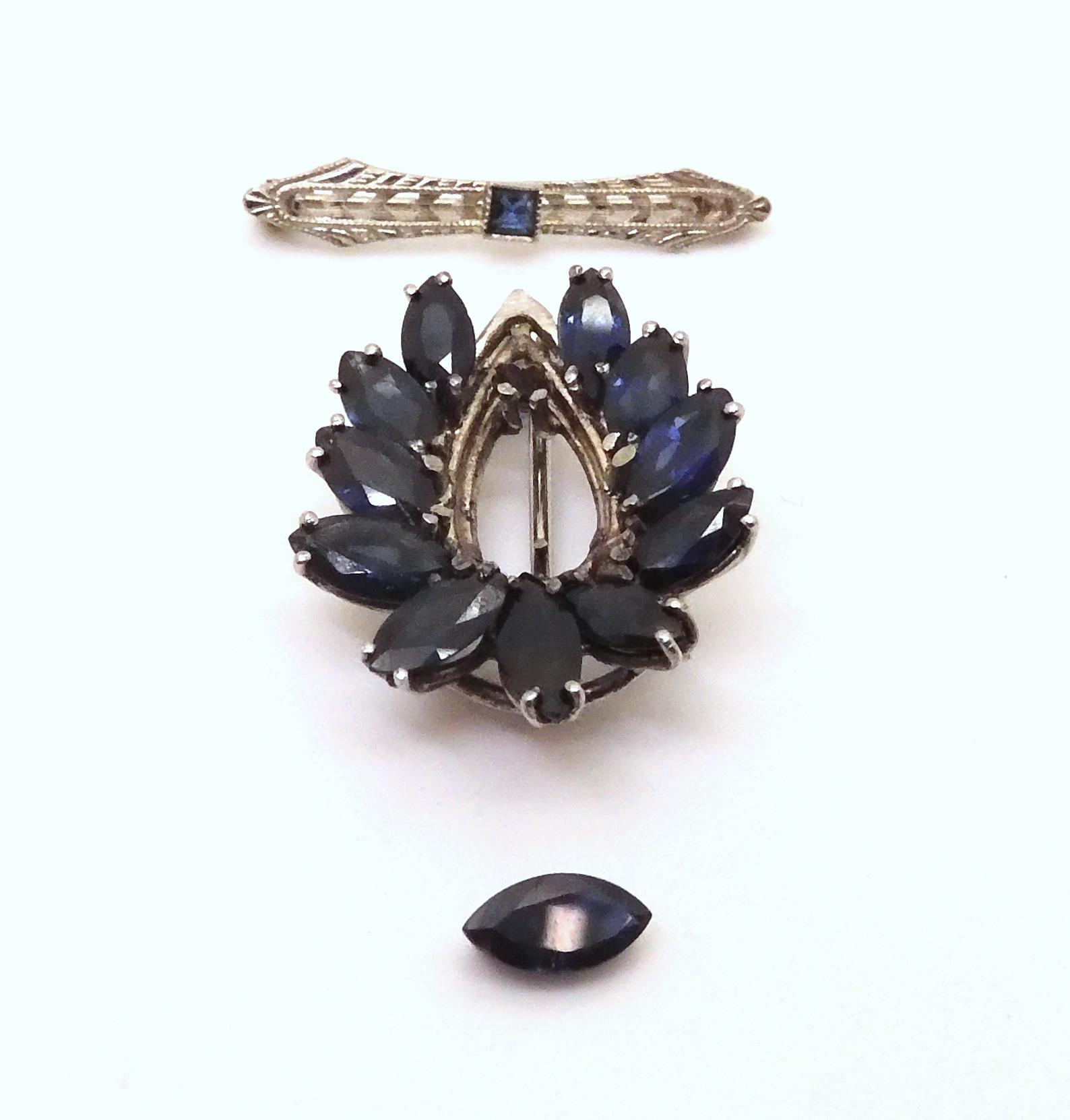 A 10k blue gem brooch, weight 0.6gms, together with a (af) sapphire brooch mounted in white metal, weight 5.3gms