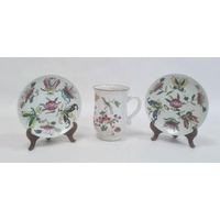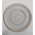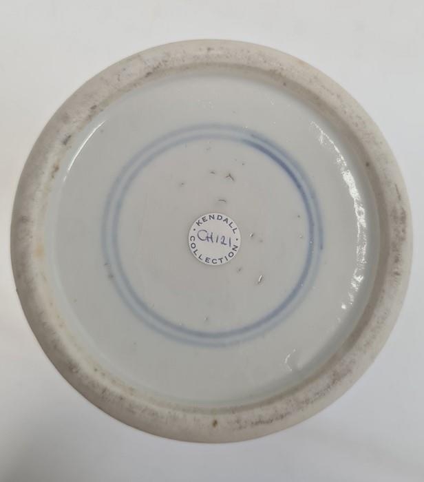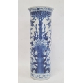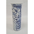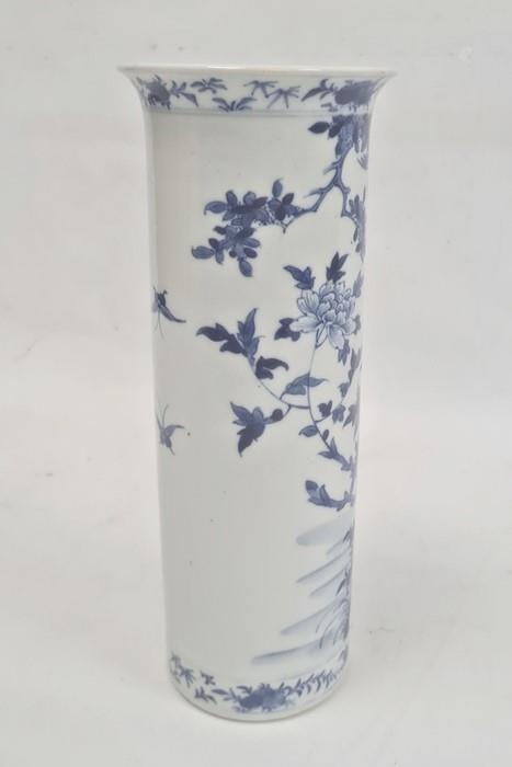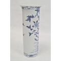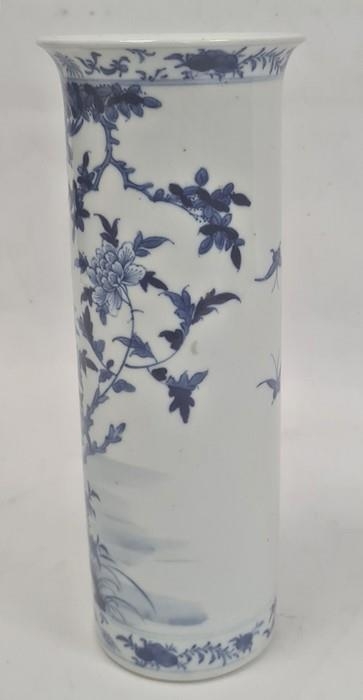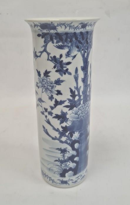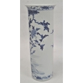 Chinese blue and white vase of cylindrical form decorated with a tree surrounded by flowers, birds and insects, bearing a paper label for the Kendall Collection, 30cm high