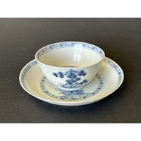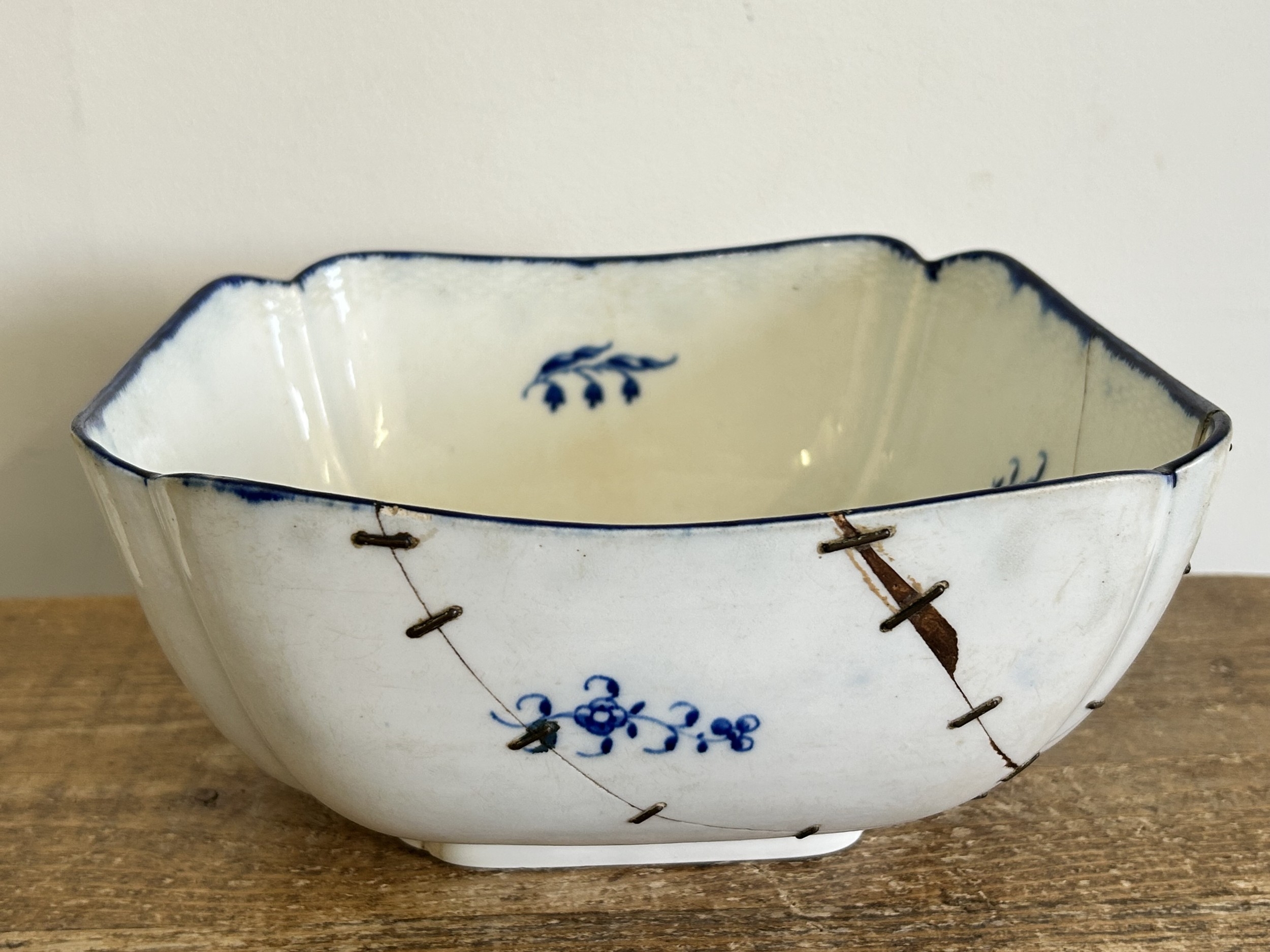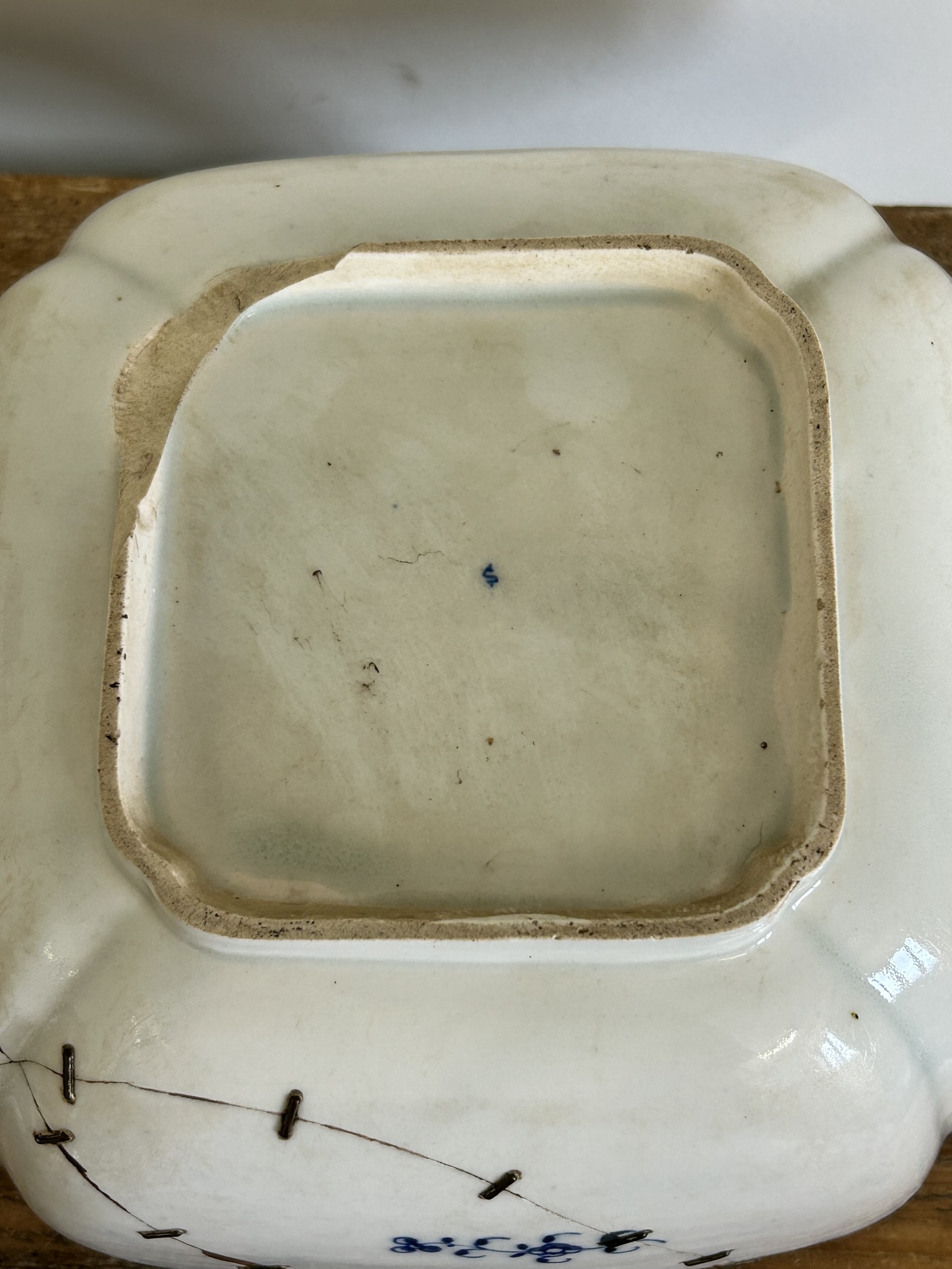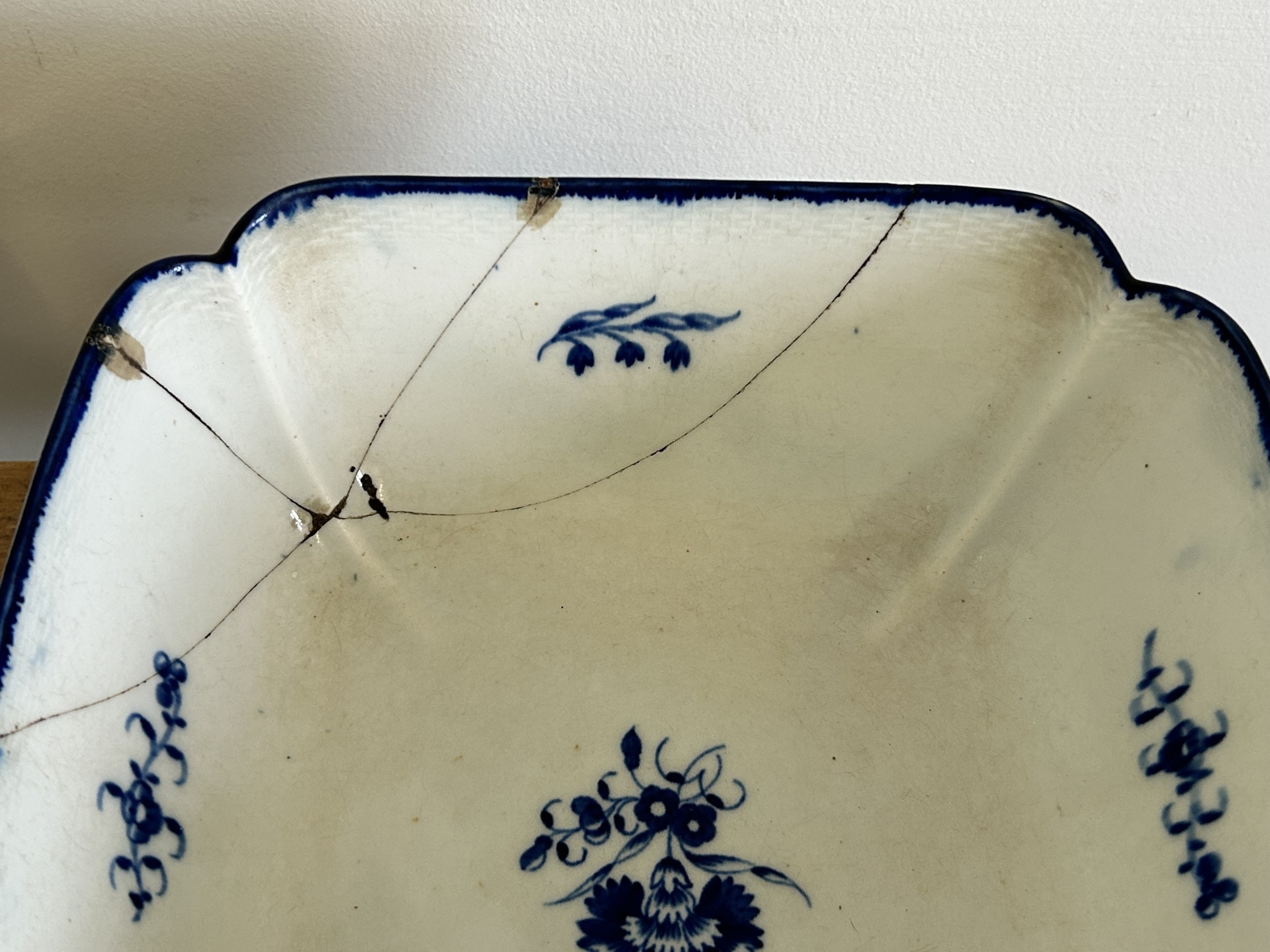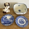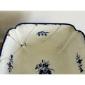 A late 18th Century Caughley large square lobed dessert dish with blue printed Salopian mark to base, 9 1/4" square (an academic piece as it is broken and stapled) plus two blue and white plates (both as found) and a Staffordshire dog