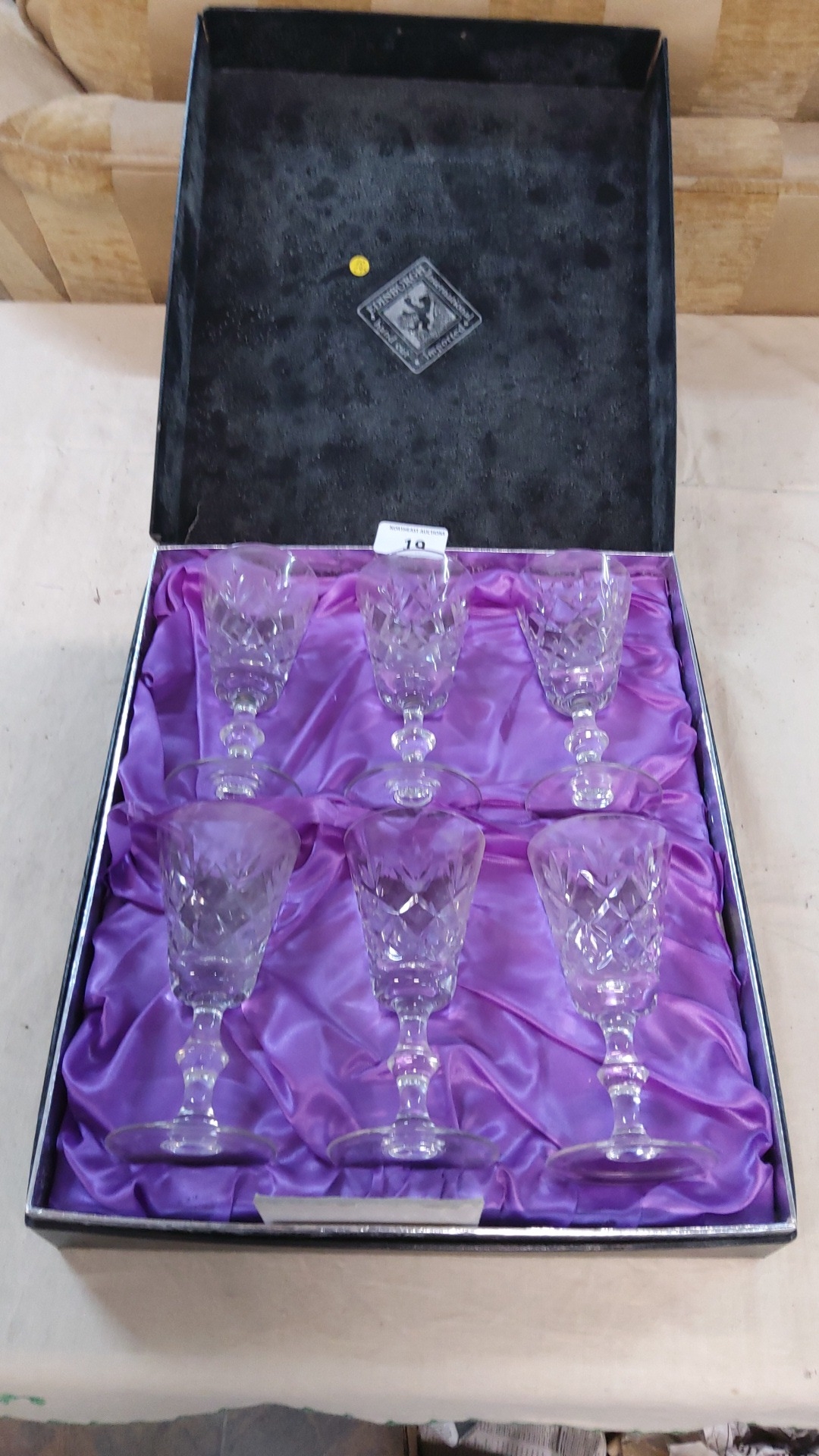 Set of 6 hand-cut crystal cordial glasses by Edinburgh International, diamond-cut bowls on waisted knopped stems, in original satin-lined presentation box.