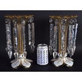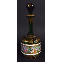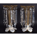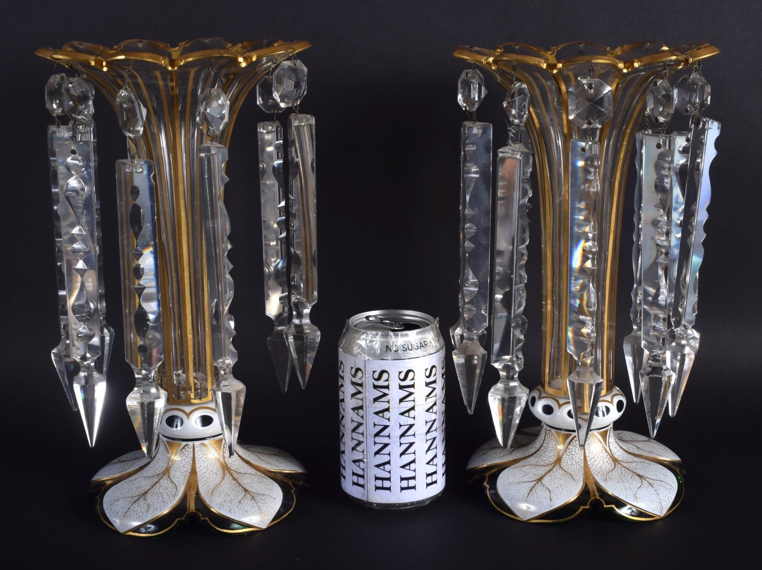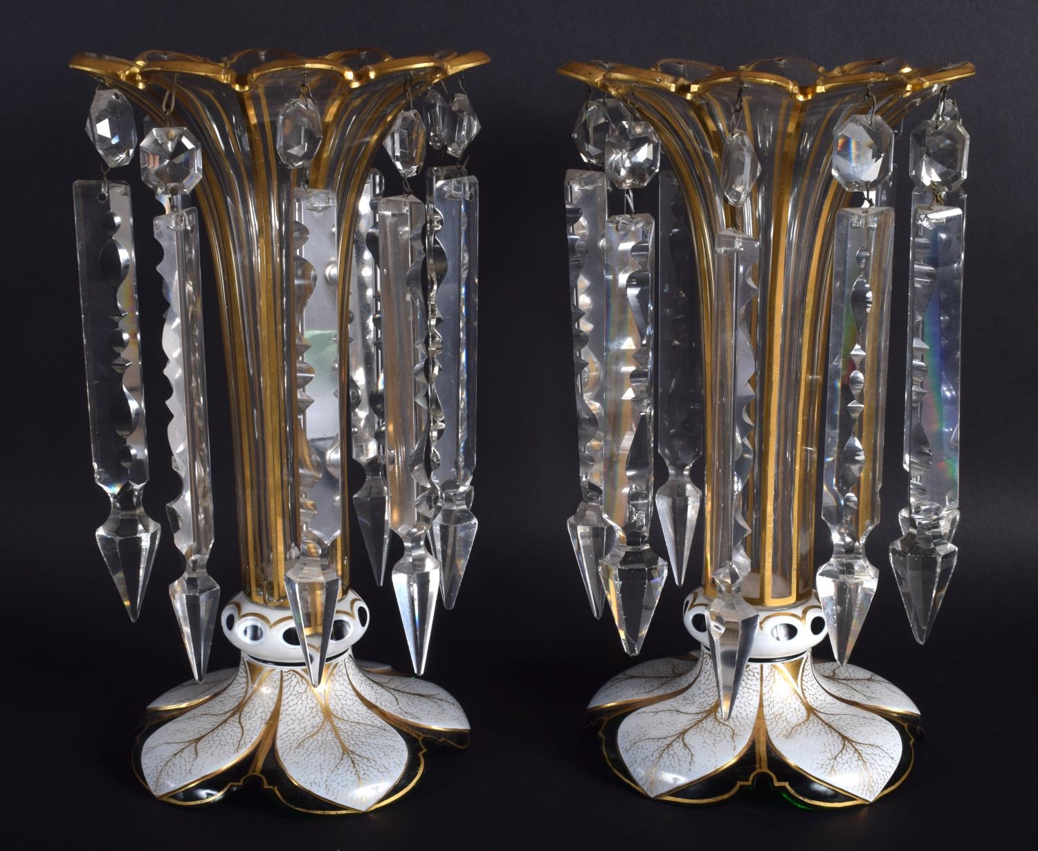 A LARGE PAIR OF 19TH CENTURY BOHEMIAN ENAMELLED GLASS TABLE LUSTRES decorated with leaves. 29 cm x 12 cm.