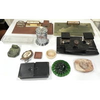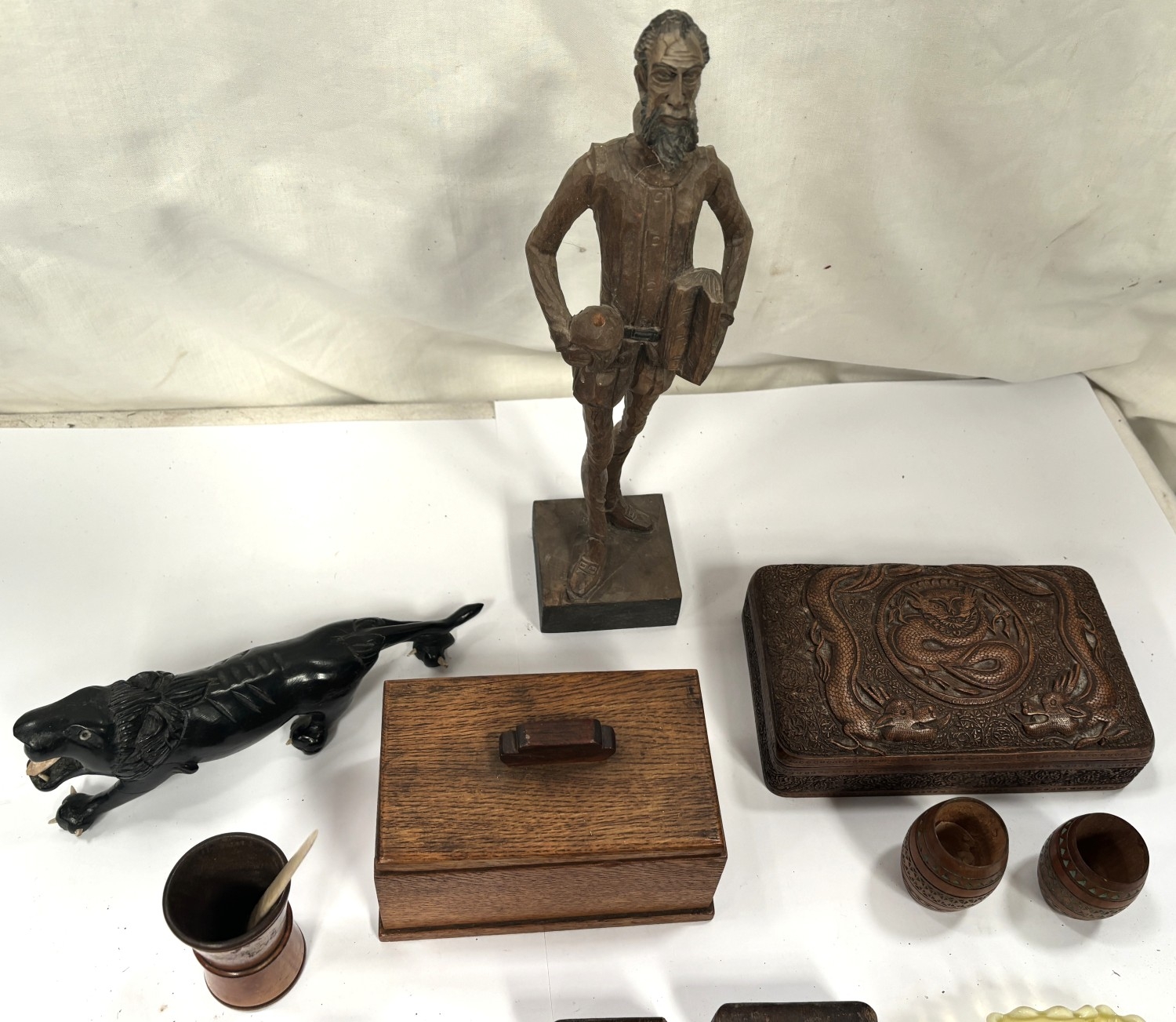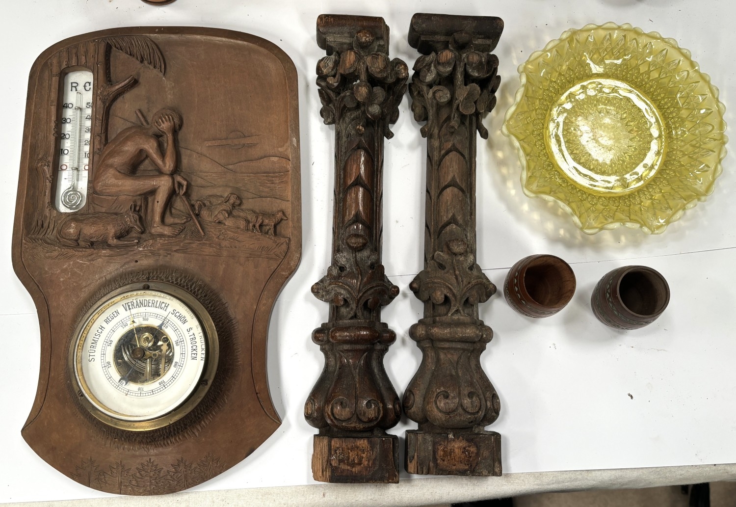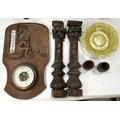 A Chinese carved wooden box, an Arts and Crafts barometer and a selection of carved treen items