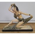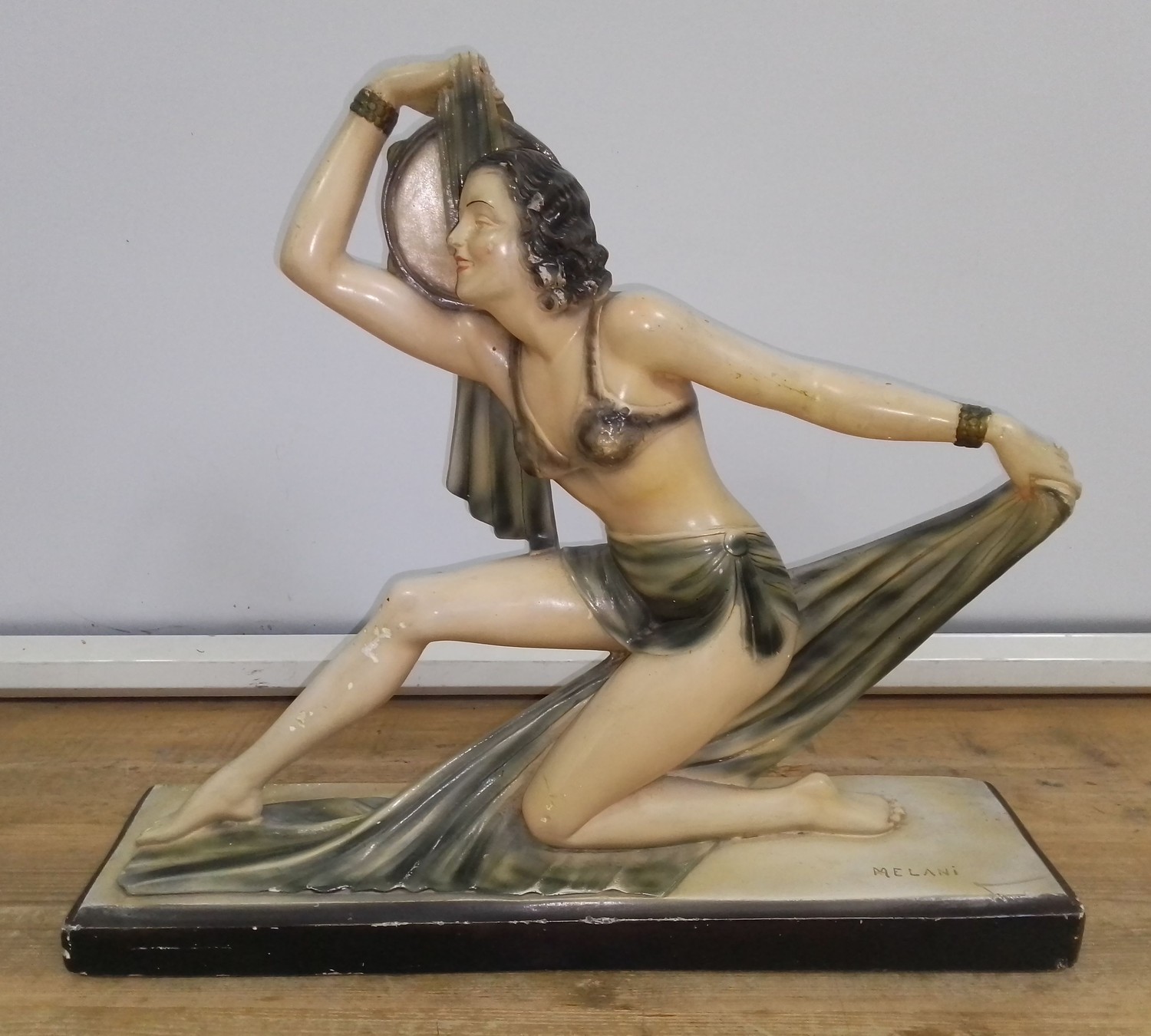 A large Art Deco plaster model depicting a semi-nude female dancer, after Salvatore Melani, bearing signature, length 61.5cm.