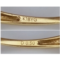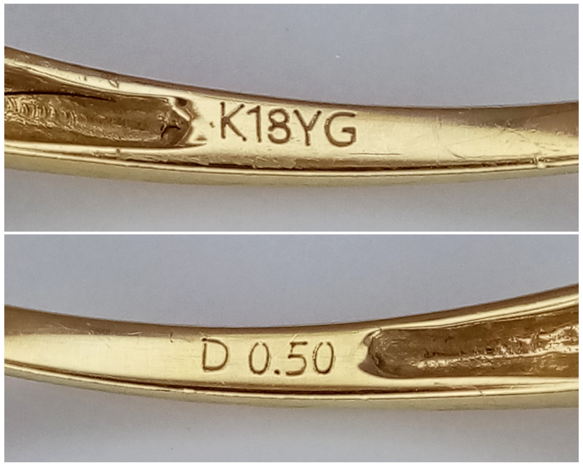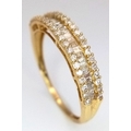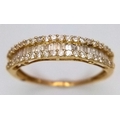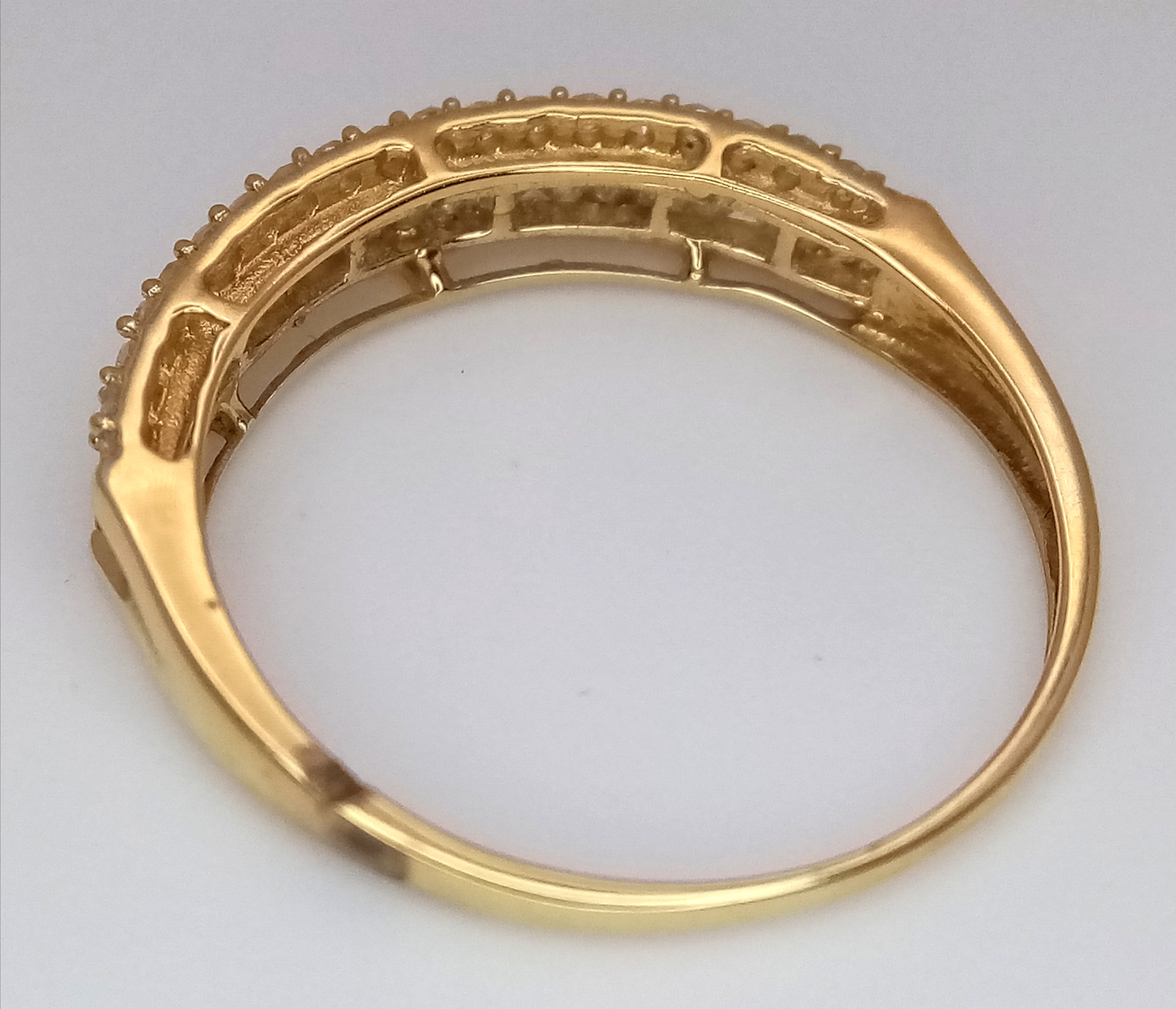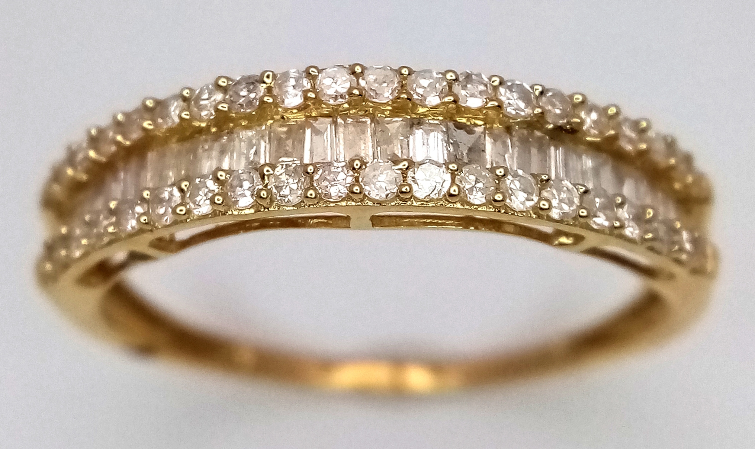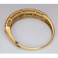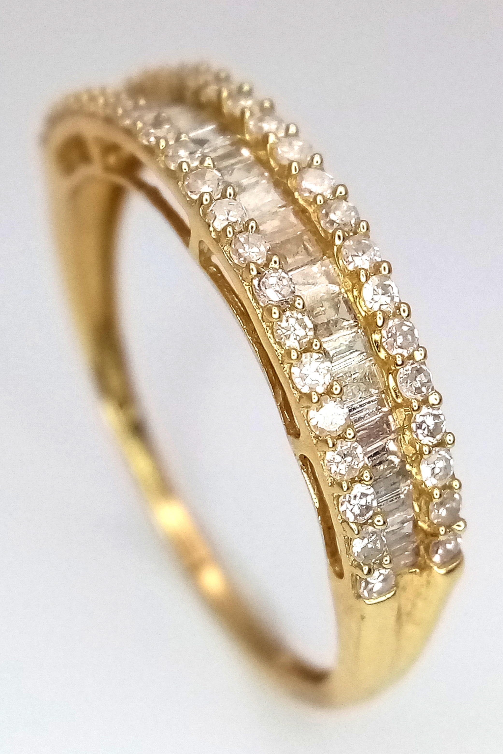 An 18K Yellow Gold and Diamond Ring. Centre baguette cut row with round cut rows either side. Size P 1/2. 1.8g.