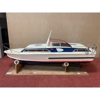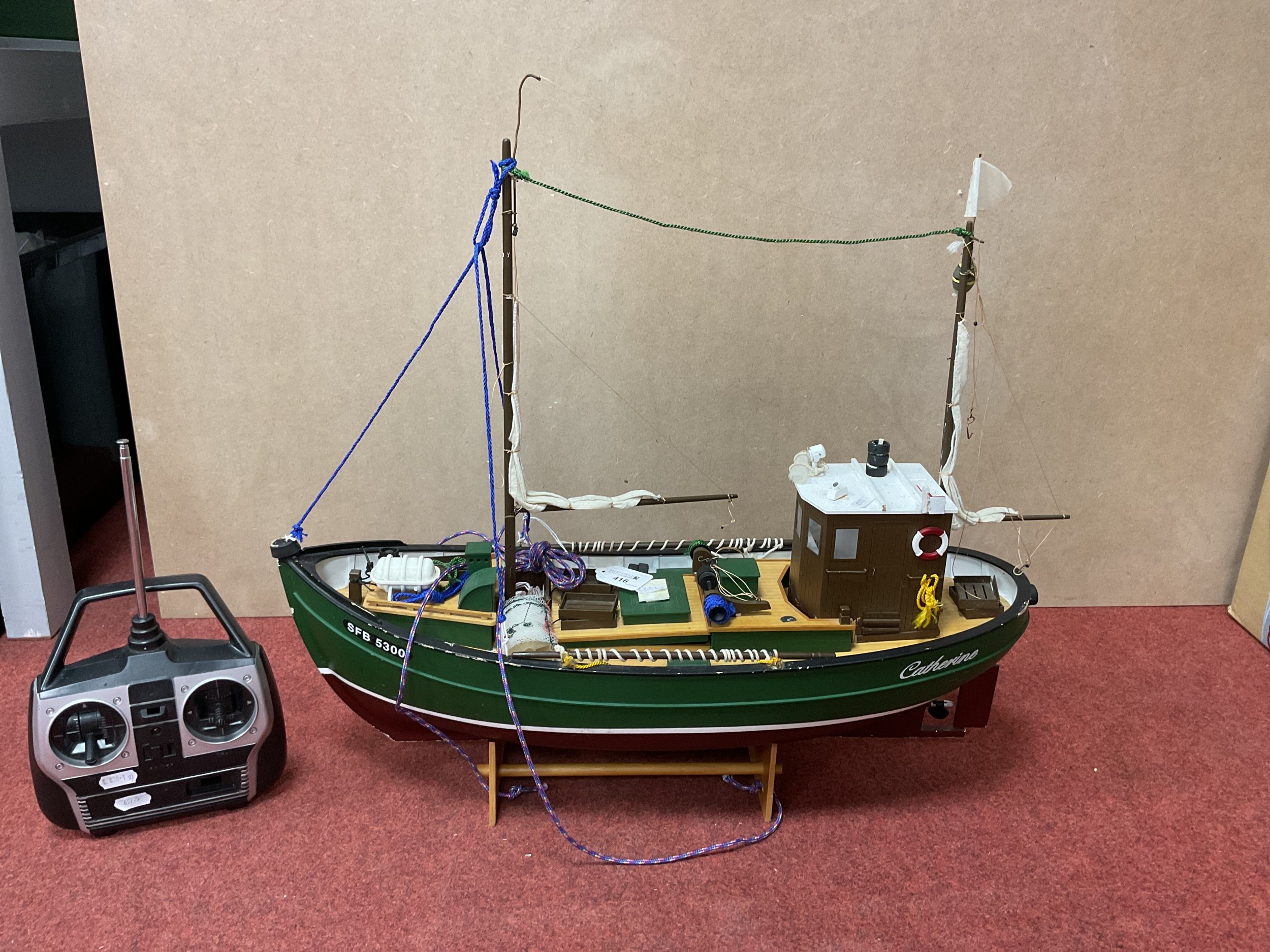 A Battery Operated 'Ready To Run' Radio Controlled Model of a Fishing/Lobster Boat by Thunder Tiger. 'Catherine' SFB 5300. Features include Motor, 3 Channel Digital Reciver, S1903 RC. Length approx 24". Small parts may be missing and/or damage. Together with RC Controller and wooden display plinth.