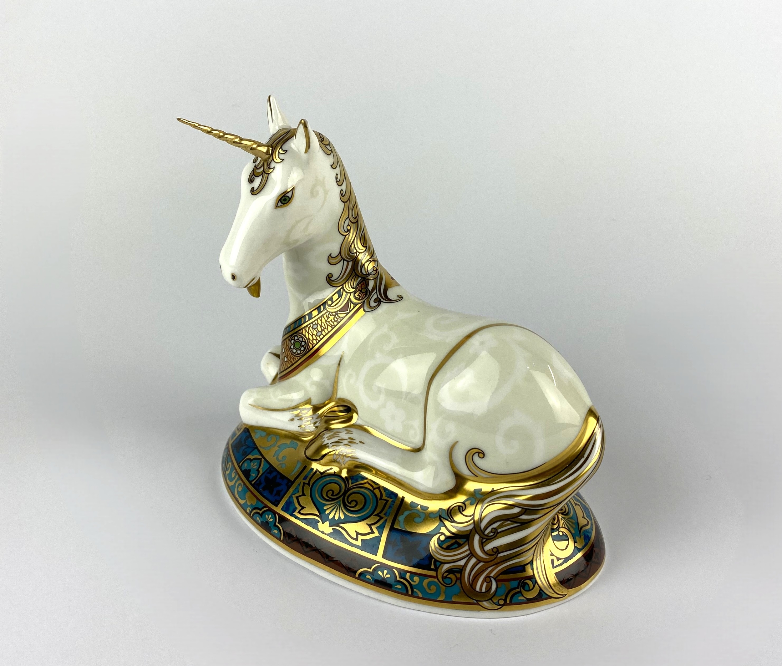 A Royal Crown Derby limited edition 'Unicorn' paperweight, designed to celebrate the New Millennium,, numbered 536/ 2000, with certificate, signed to base 'Louise Adams, 23.7.1999', gold stopper and red mark, height 14cm