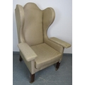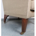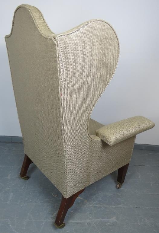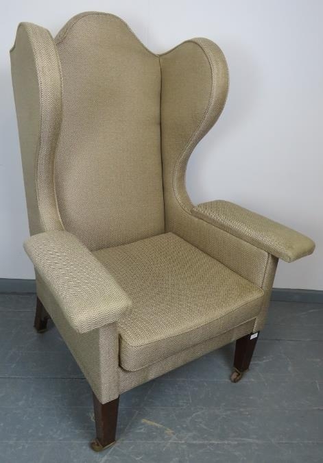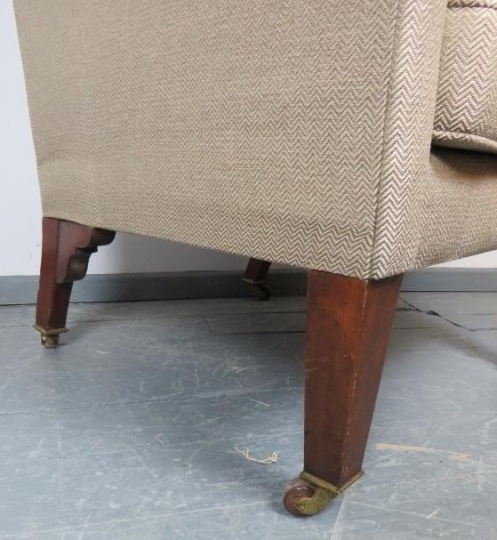 A large Edwardian wingback armchair in the Georgian taste, on tapering square mahogany supports with brass caps and ceramic castors.