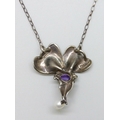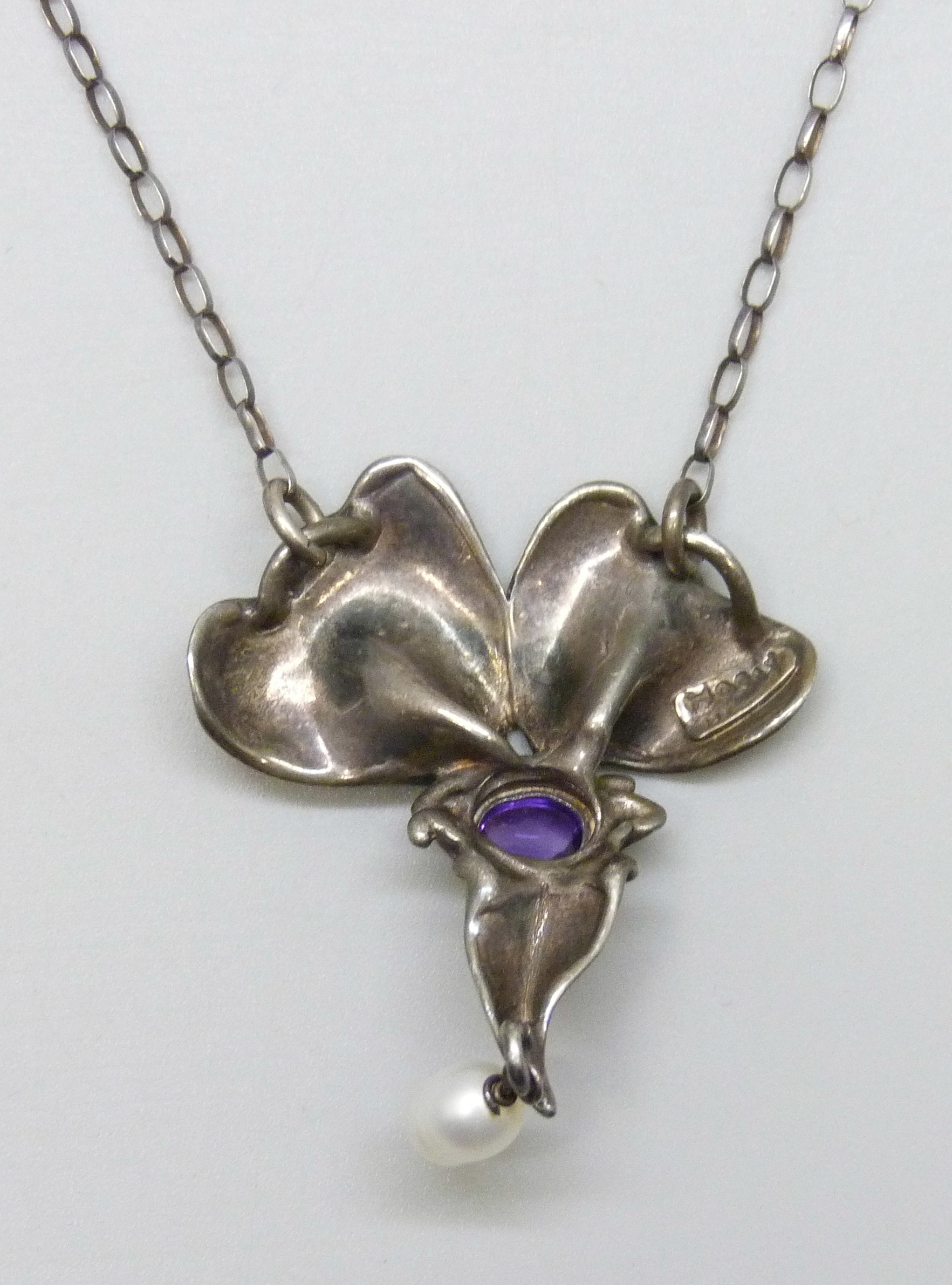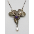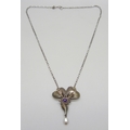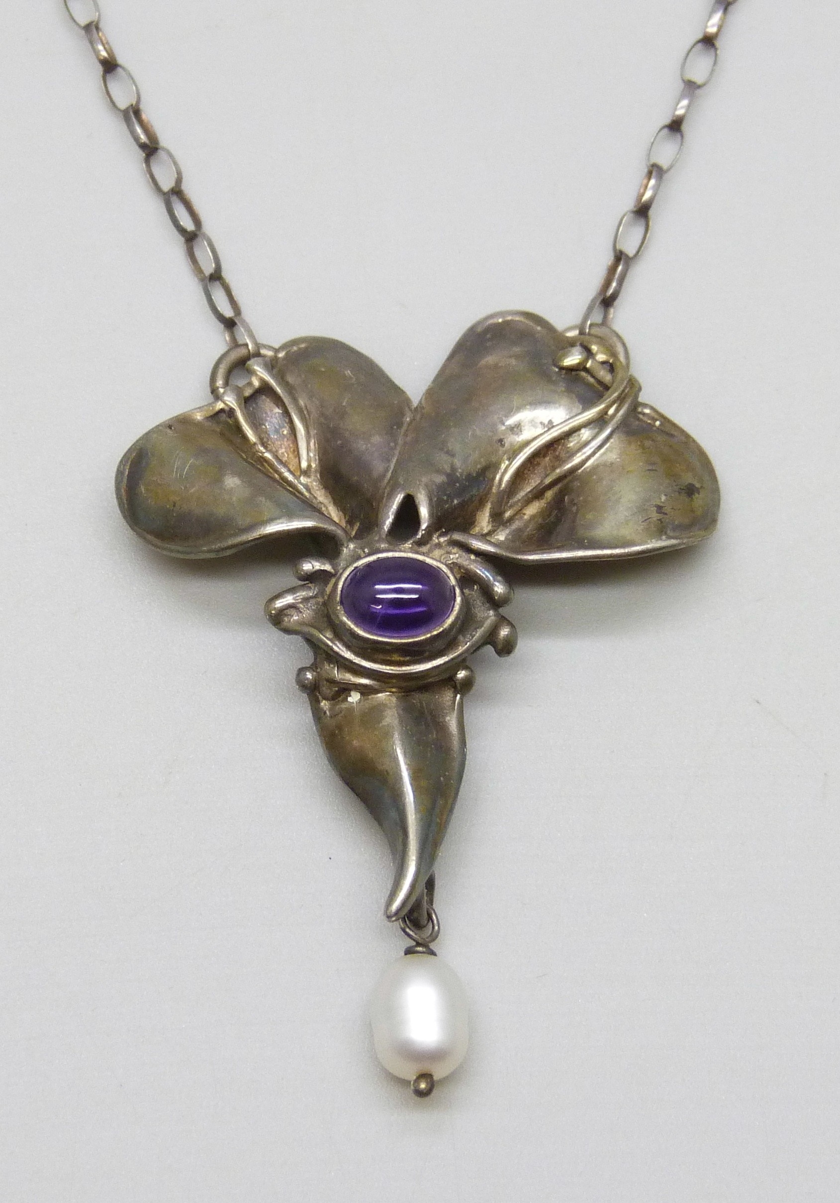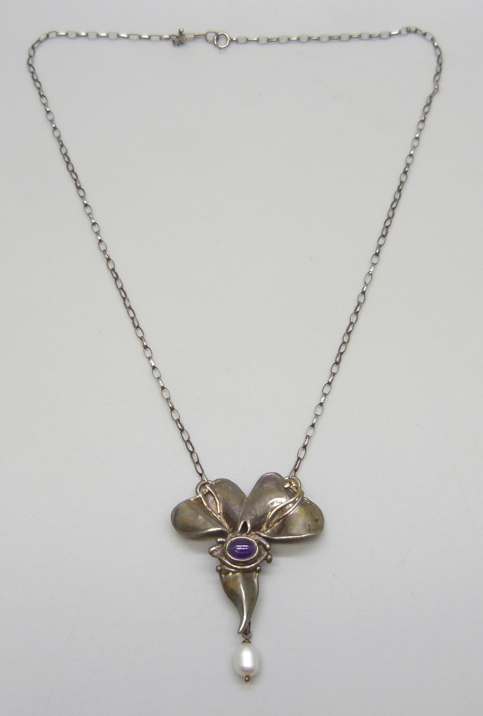 A silver, amethyst and pearl Art Nouveau style necklace, 9g, 44cm