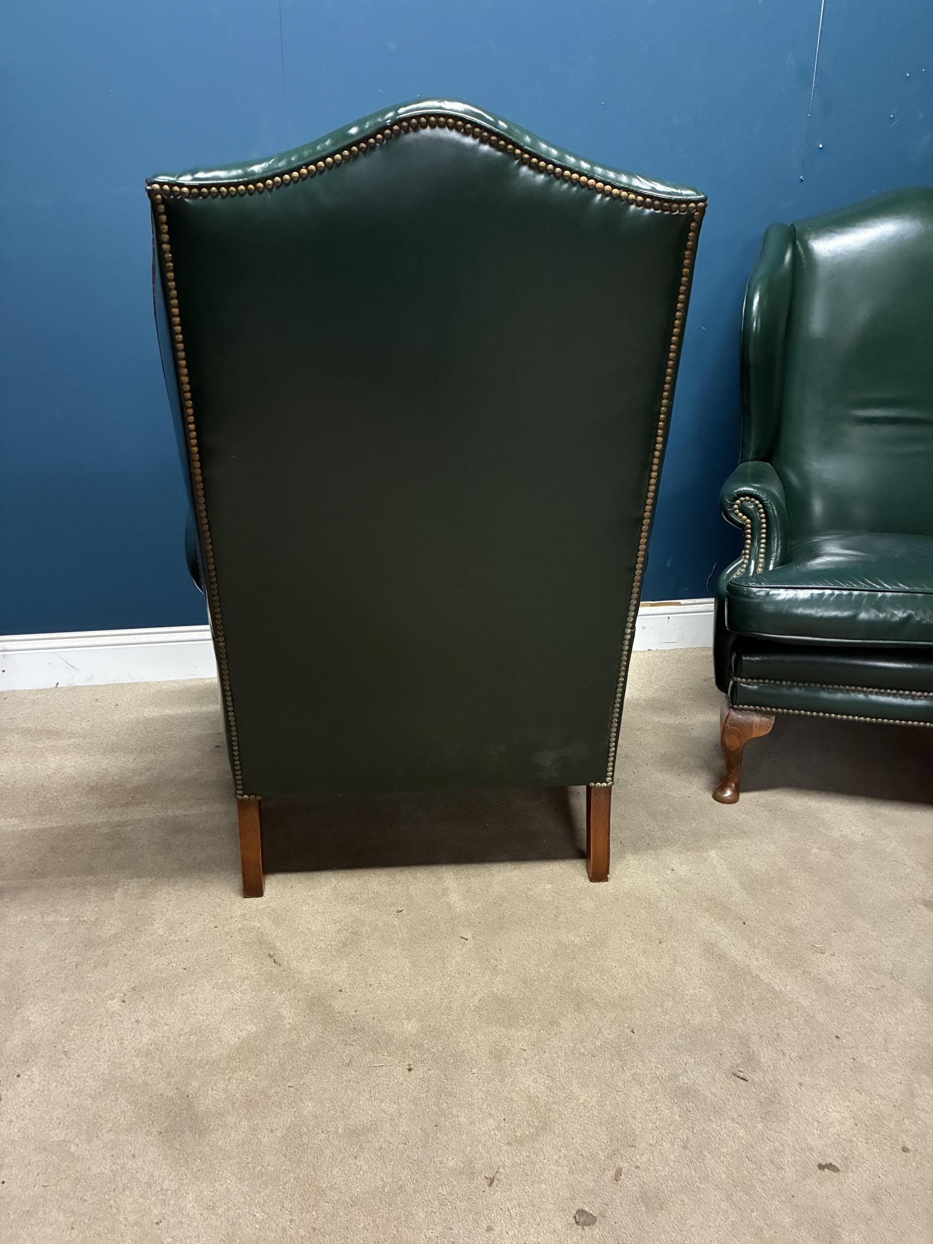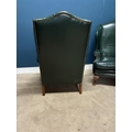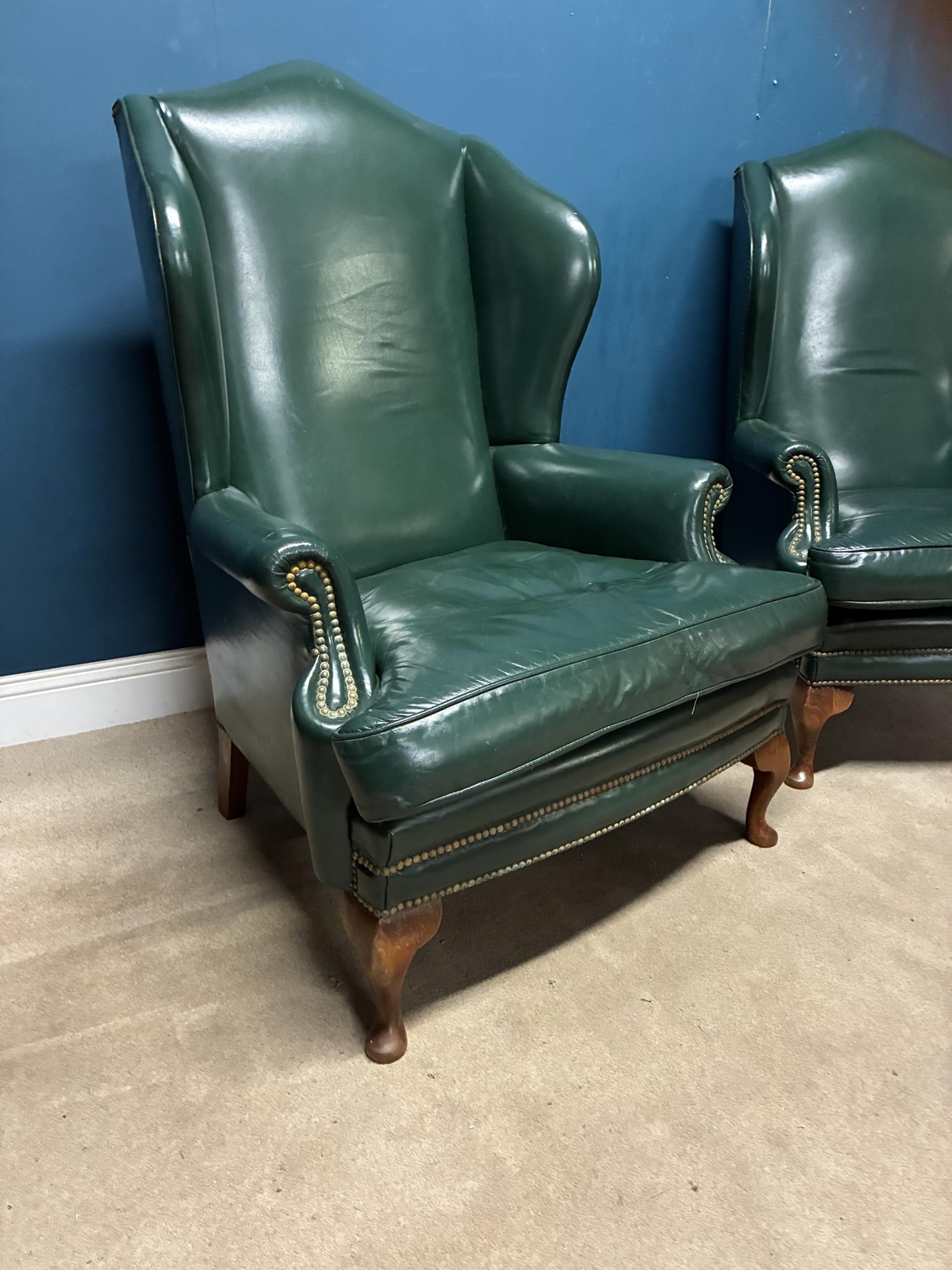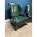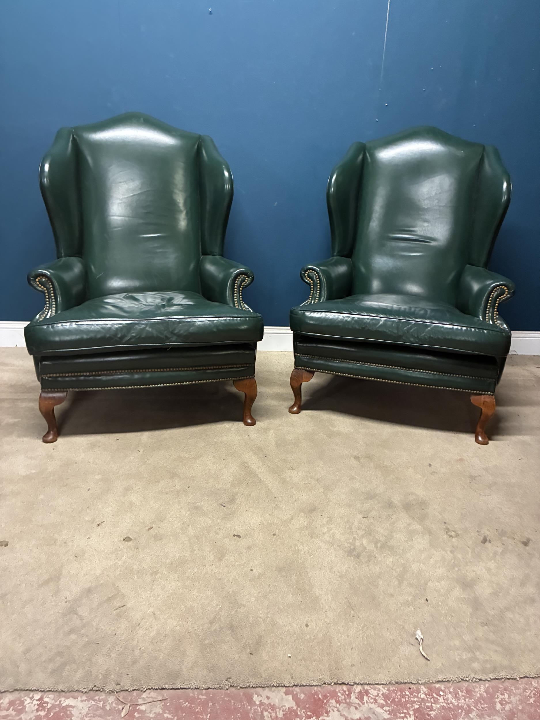 Pair of exceptional quality leather upholstered library chairs raised on Queen Ann legs {118cm H x 90cm W x 87cm D}
