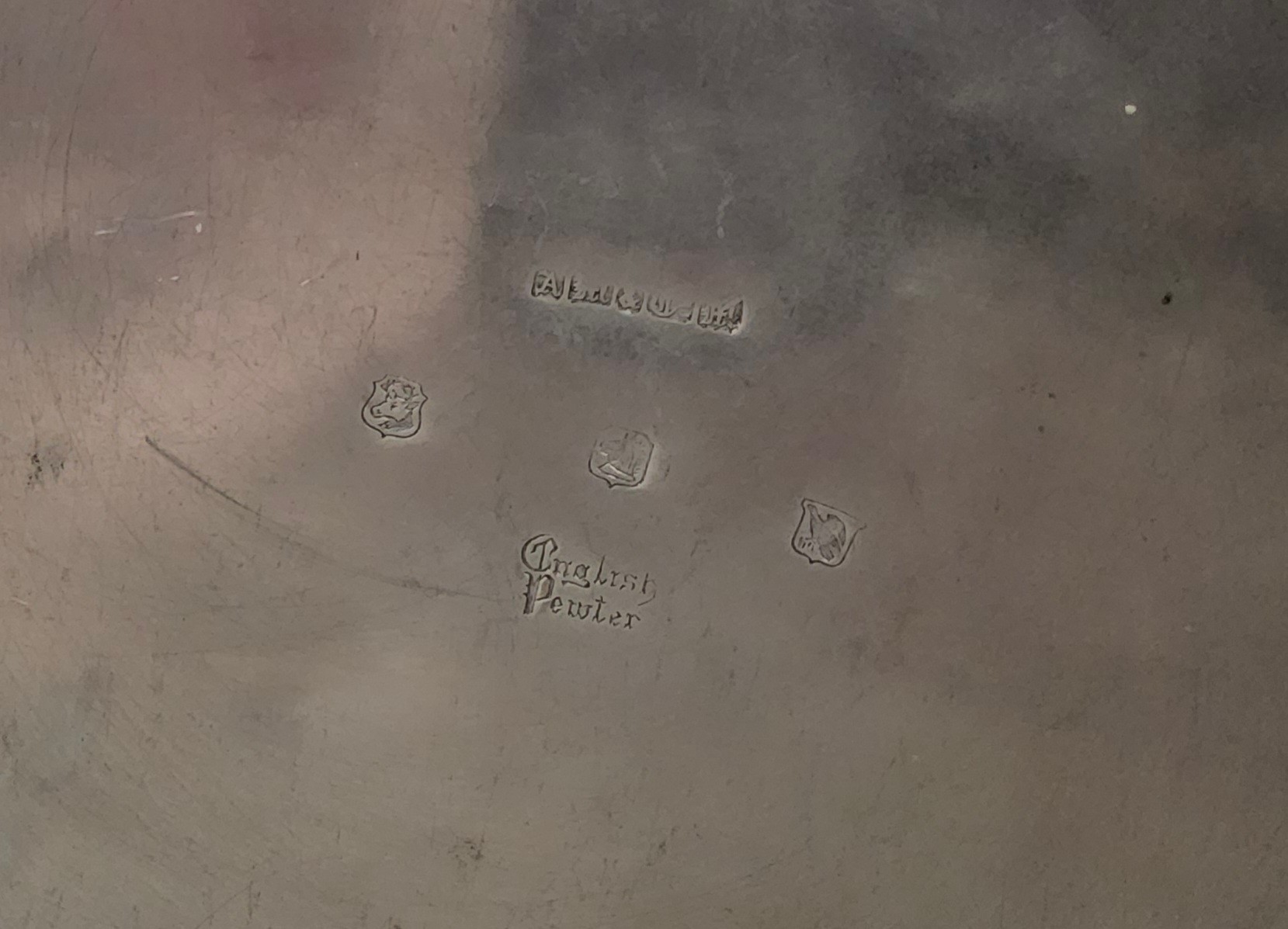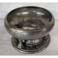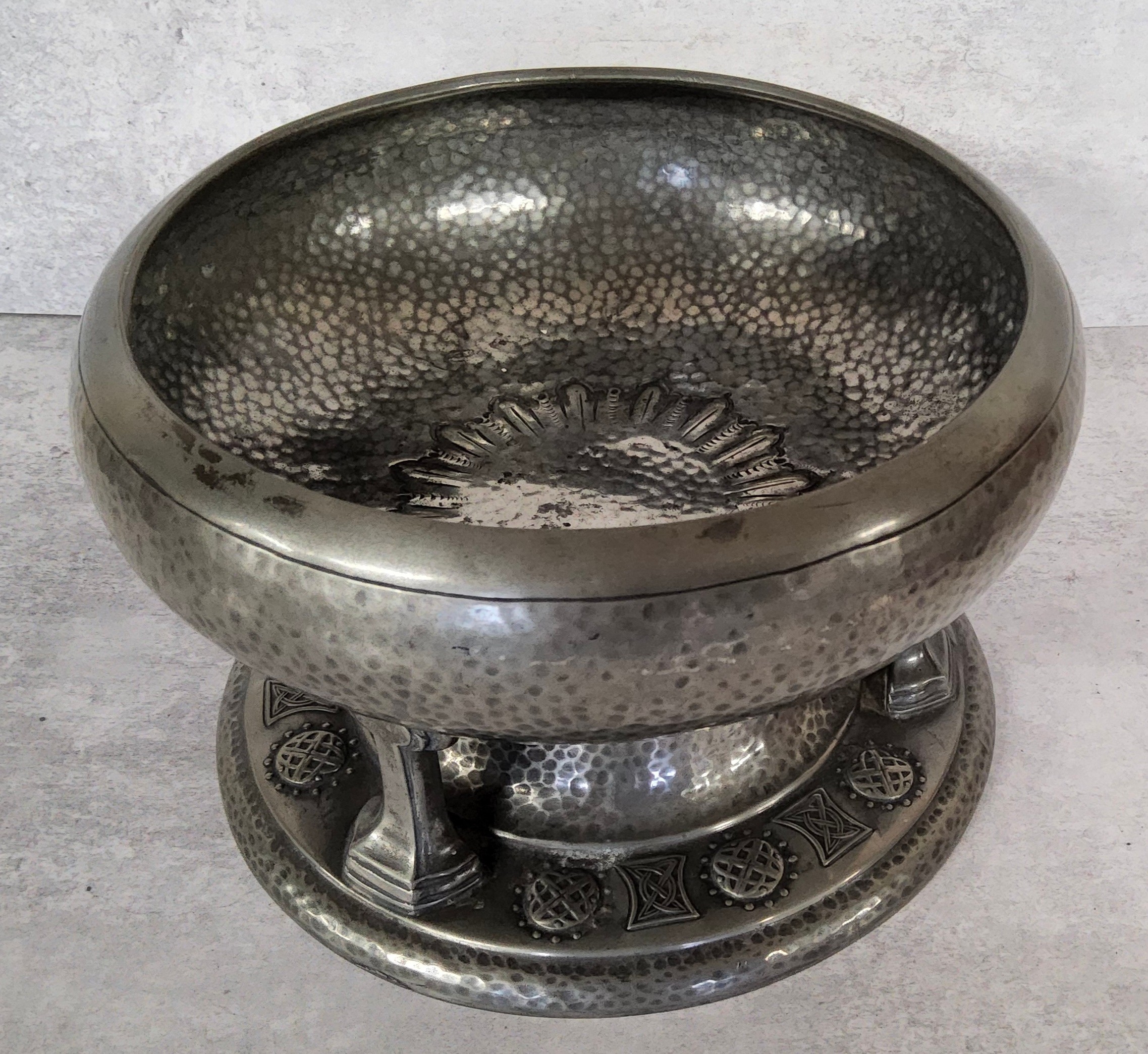An unusual Celtic style pewter pedestal bowl, the base embossed in relief with Celtic symbols, the bowl supported with three Celtic columns, hammered finish, stamped CM & AM, a stag's, head, a horse's head and an eagle all in shields and English Pewter 22cm dia. 13cms high