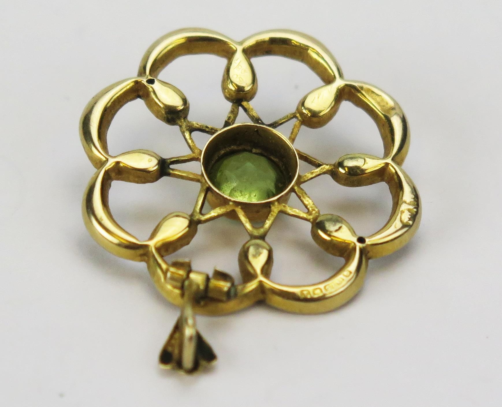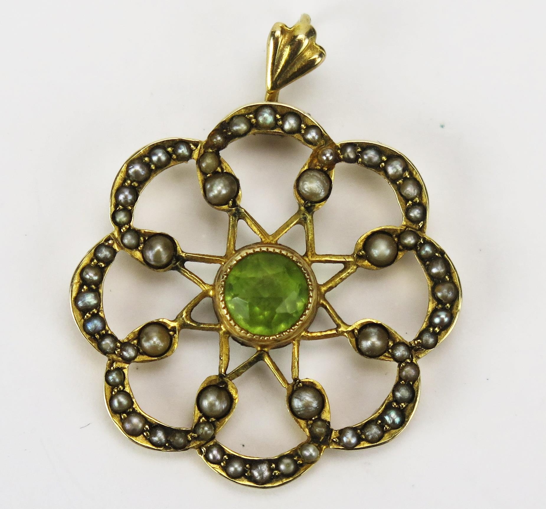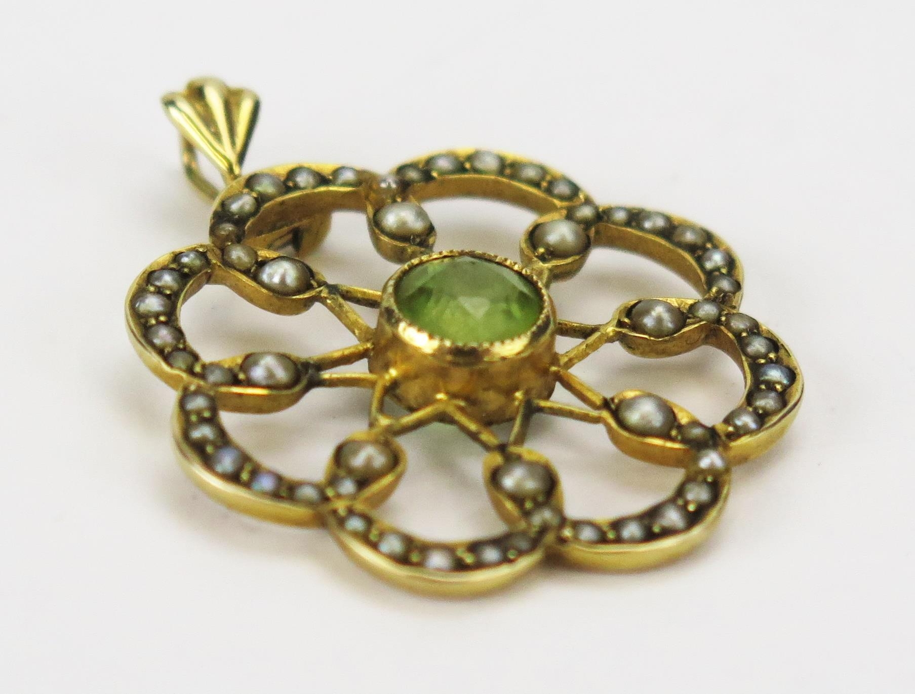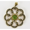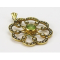 A 9ct Gold, Peridot and Seed Pearl Pendant, 32.1mm drop, Birmingham 1943, 2.64g