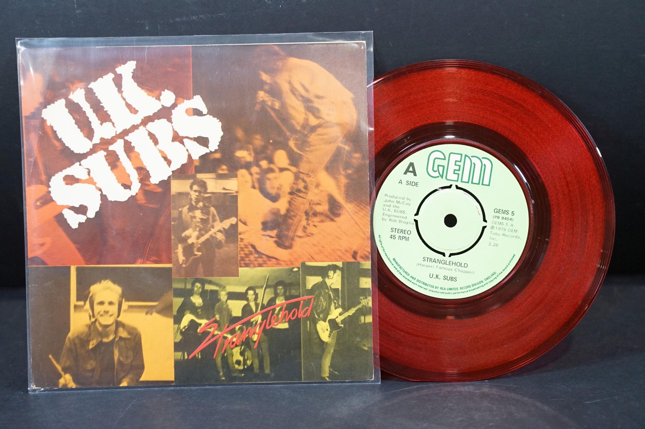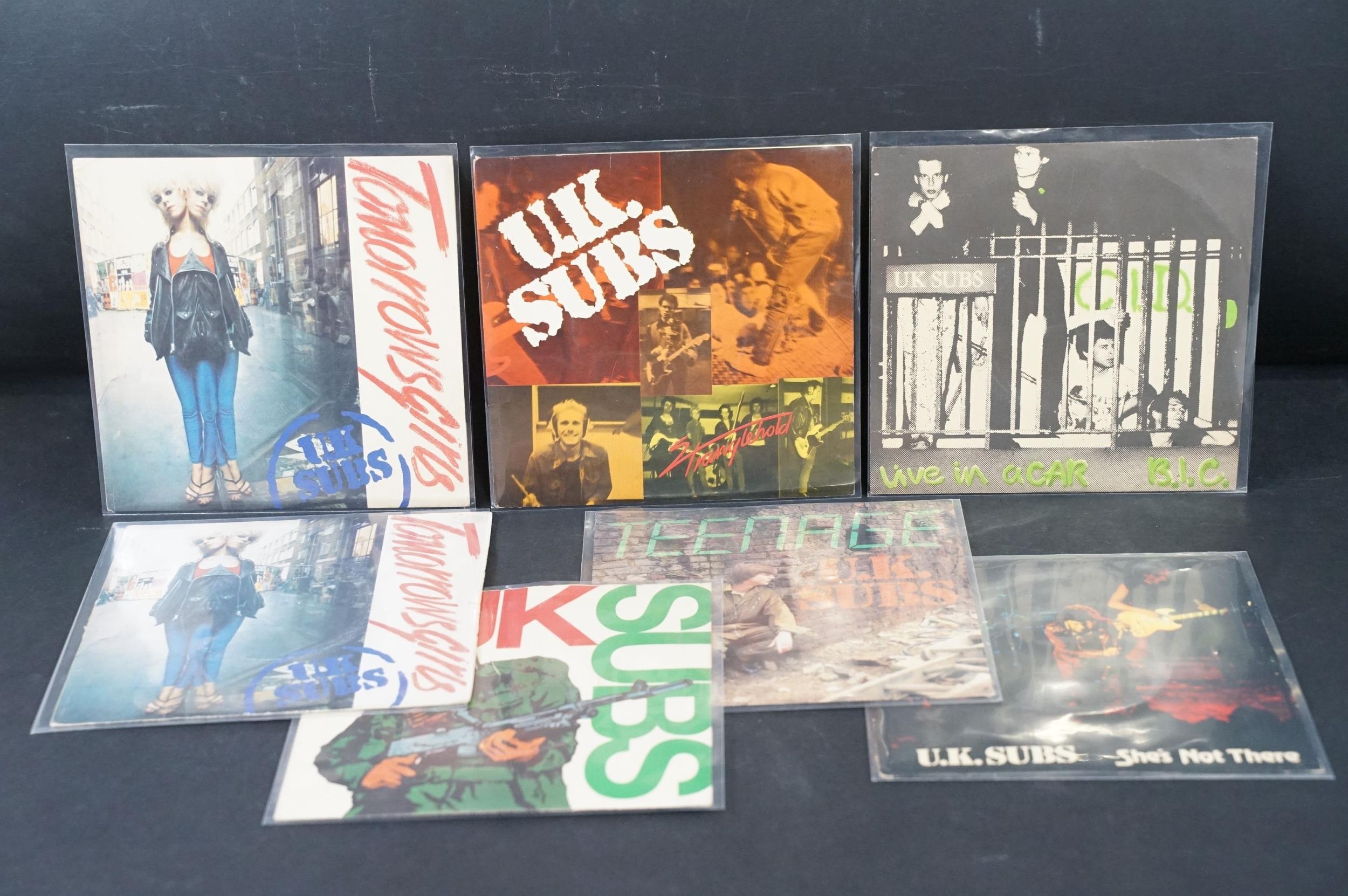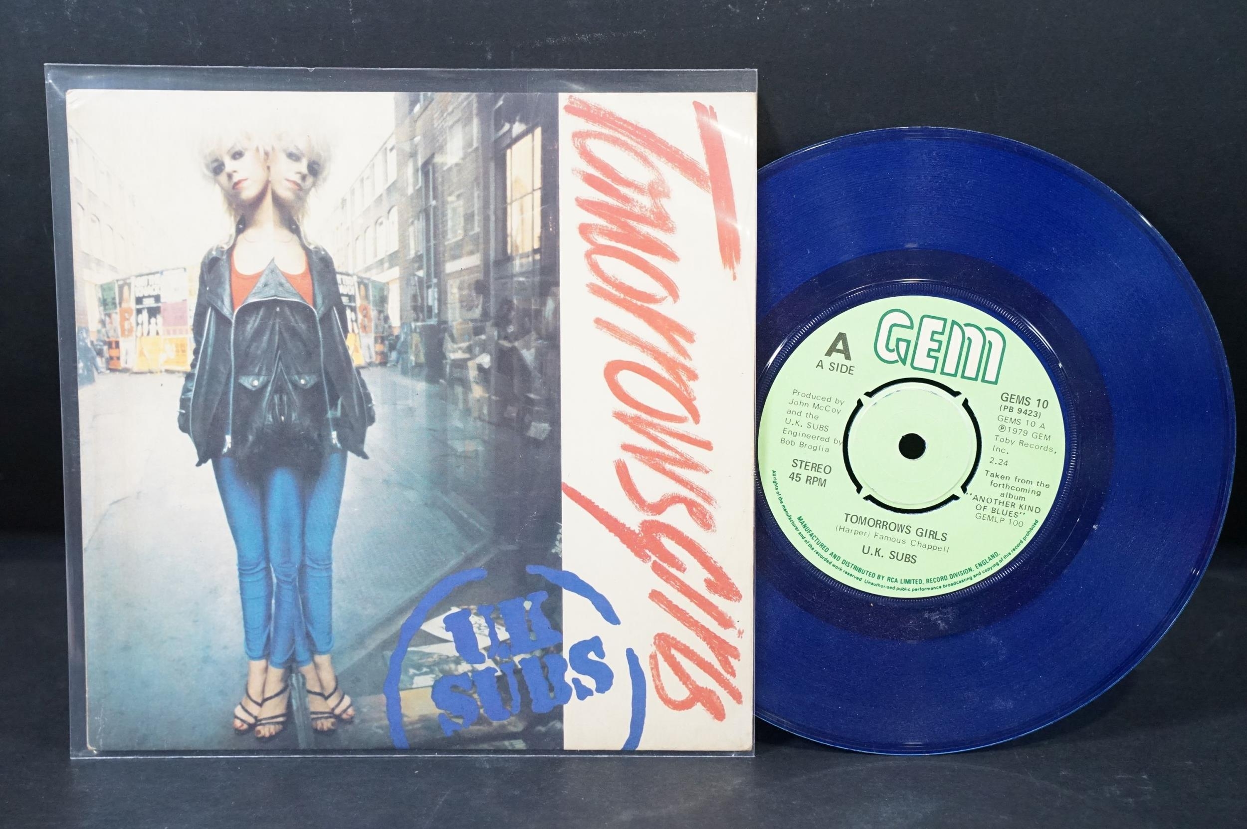 Vinyl - 7 U.K. Subs original UK 7” singles to include: C.I.D. (City Records – NIK 5, 1978) EX- / VG, Stranglehold (GEMS 5, red vinyl), Tomorrows Girls x 2 (GEMS 10, both blue vinyl), She's Not There (GEMS 14 green vinyl), Teenage (GEMS 30 pink vinyl), Warhead (GEMS 23 brown vinyl). Condition VG+ overall