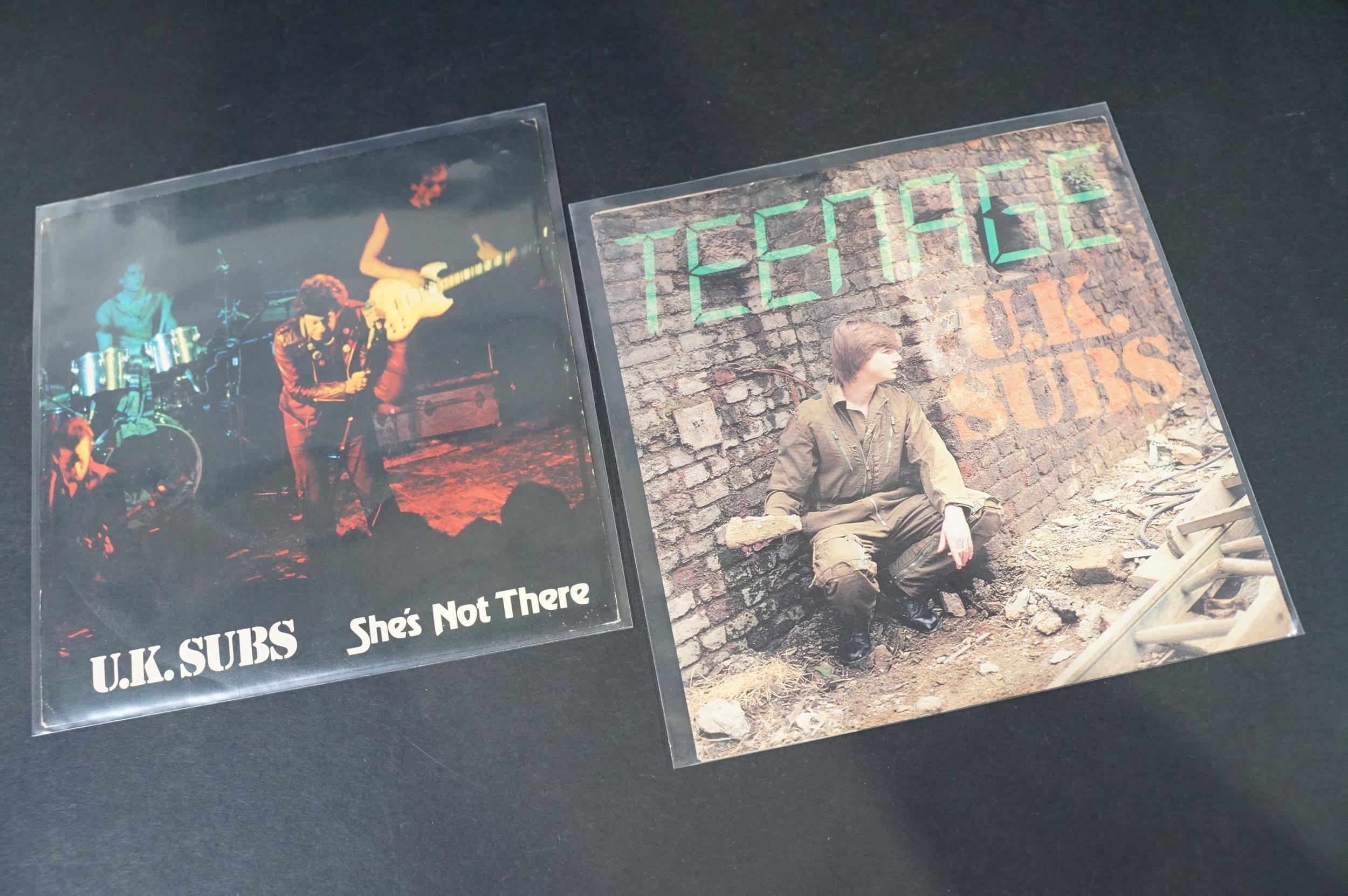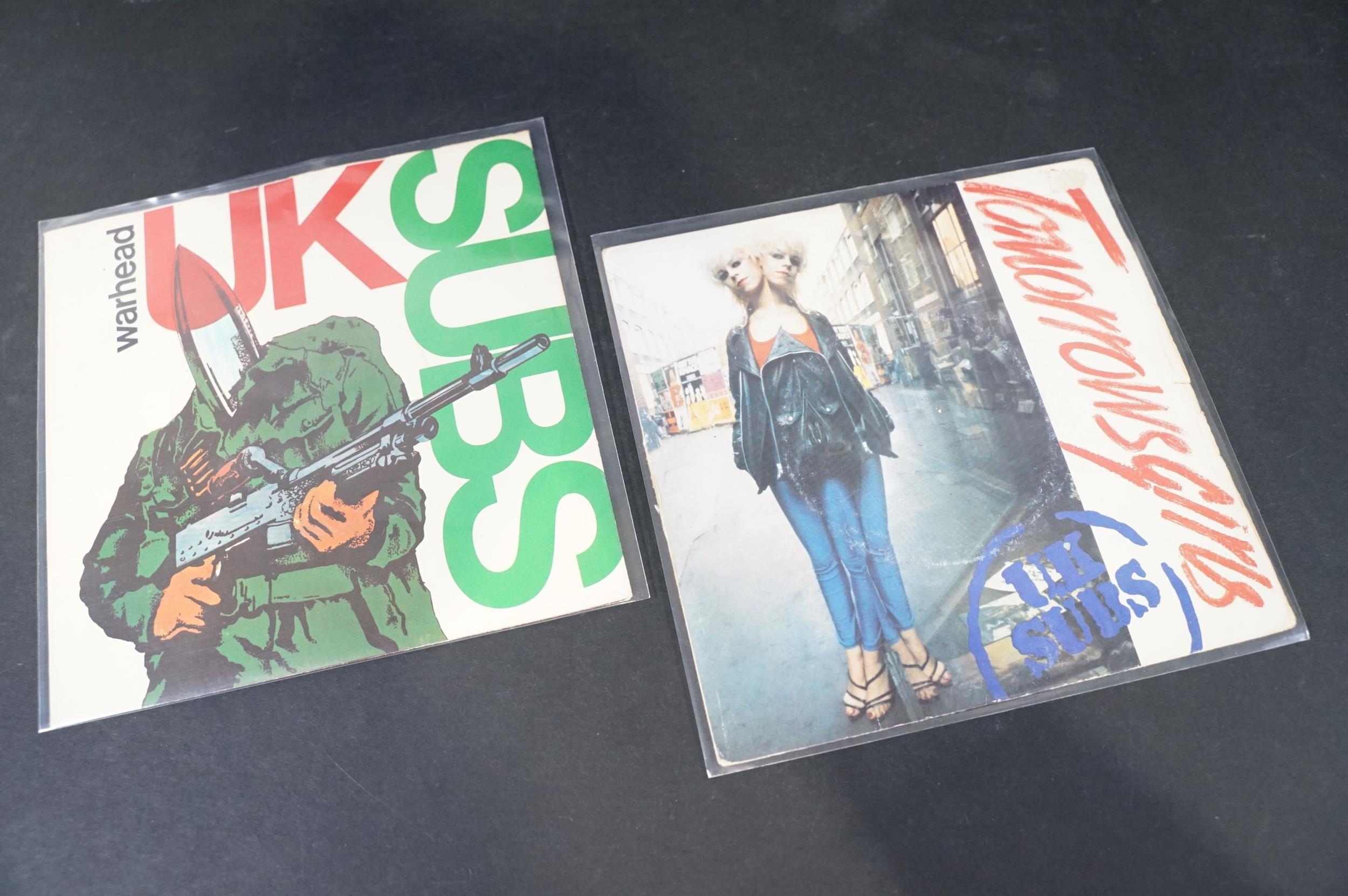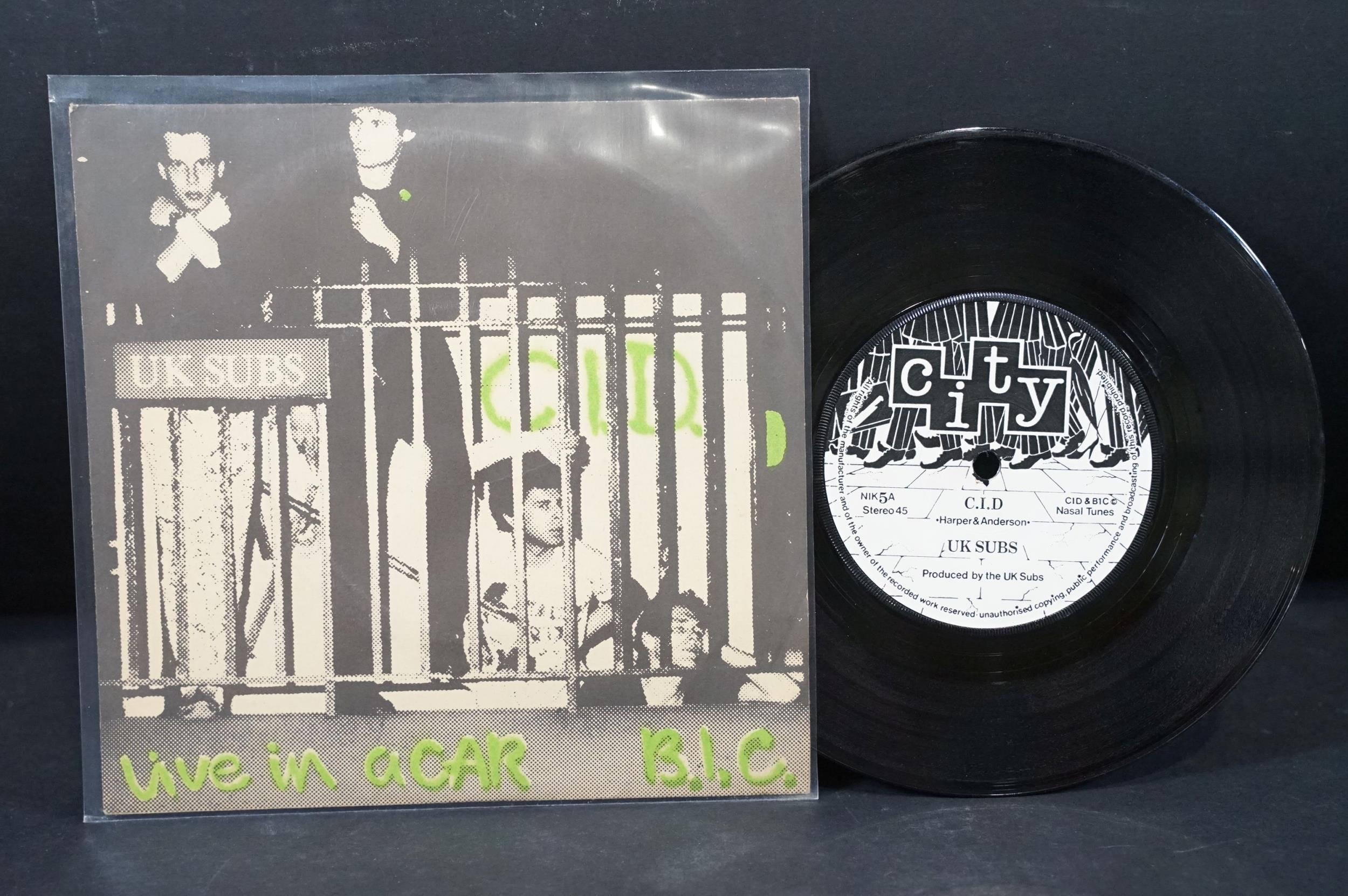 Vinyl - 7 U.K. Subs original UK 7” singles to include: C.I.D. (City Records – NIK 5, 1978) EX- / VG, Stranglehold (GEMS 5, red vinyl), Tomorrows Girls x 2 (GEMS 10, both blue vinyl), She's Not There (GEMS 14 green vinyl), Teenage (GEMS 30 pink vinyl), Warhead (GEMS 23 brown vinyl). Condition VG+ overall