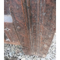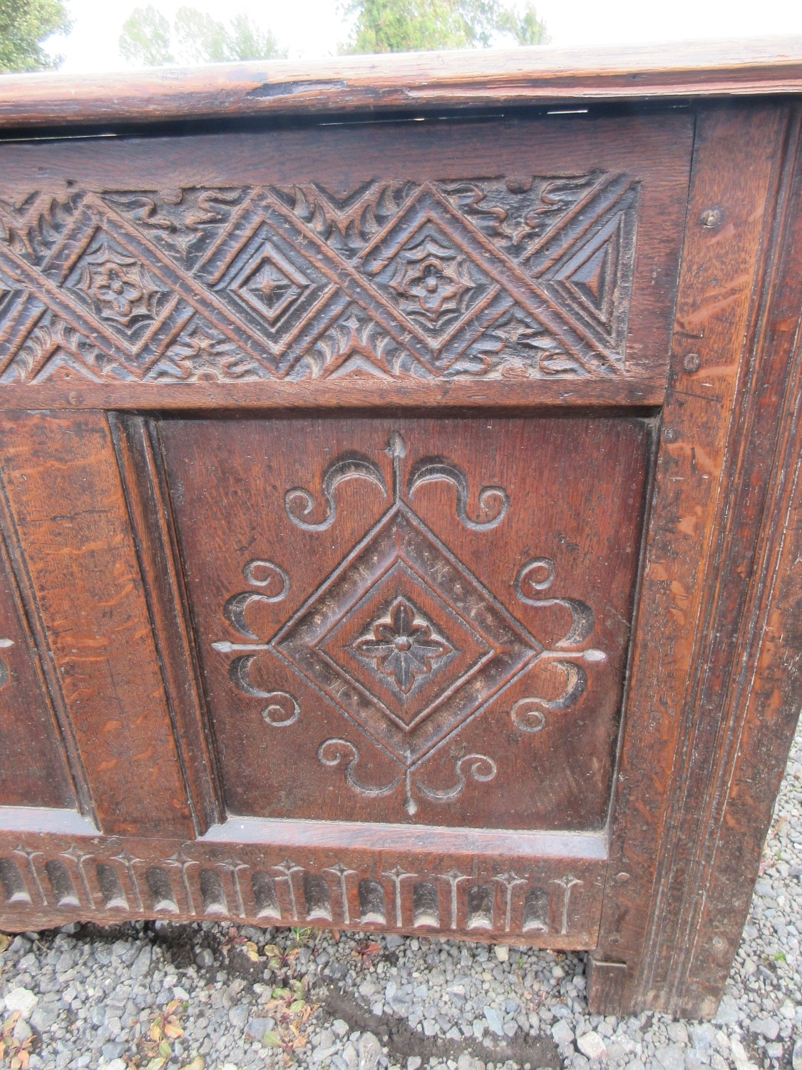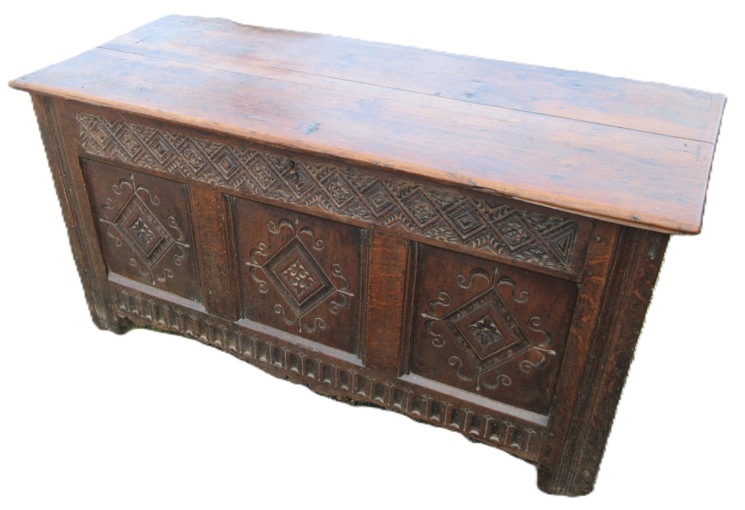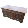 18th century oak coffer, planked top and three lozenge carv...