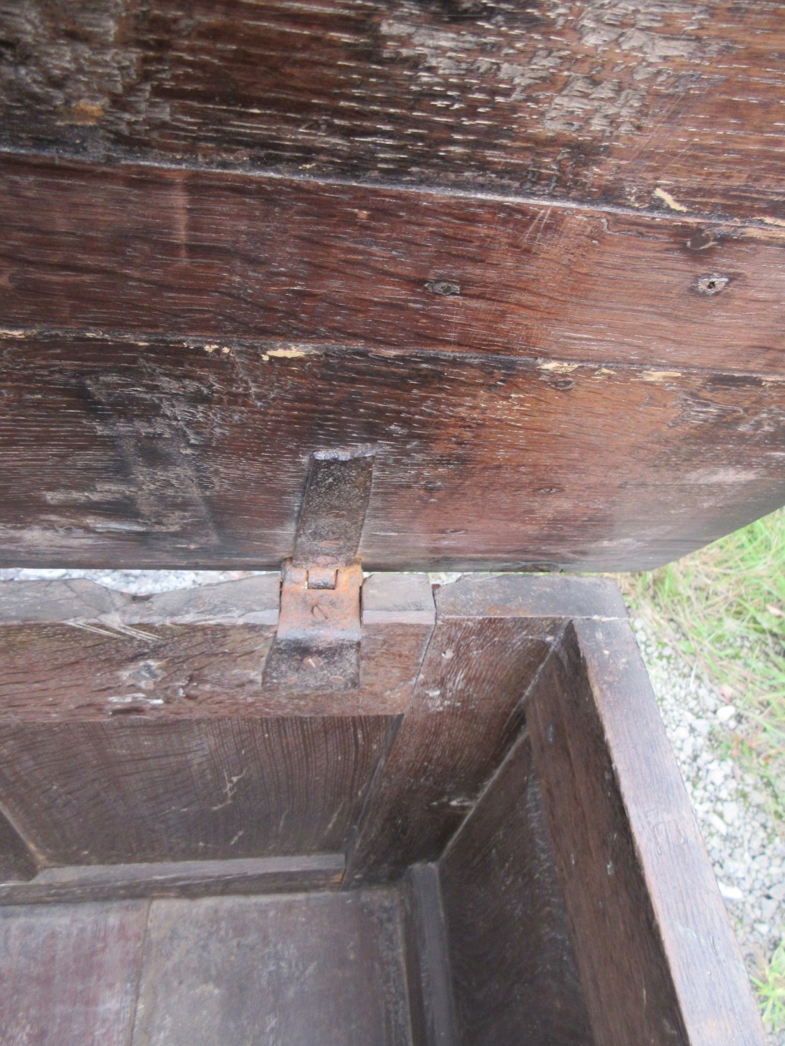 18th century oak coffer, planked top and three lozenge carved panel front, W137cm D57cm H66cm