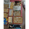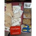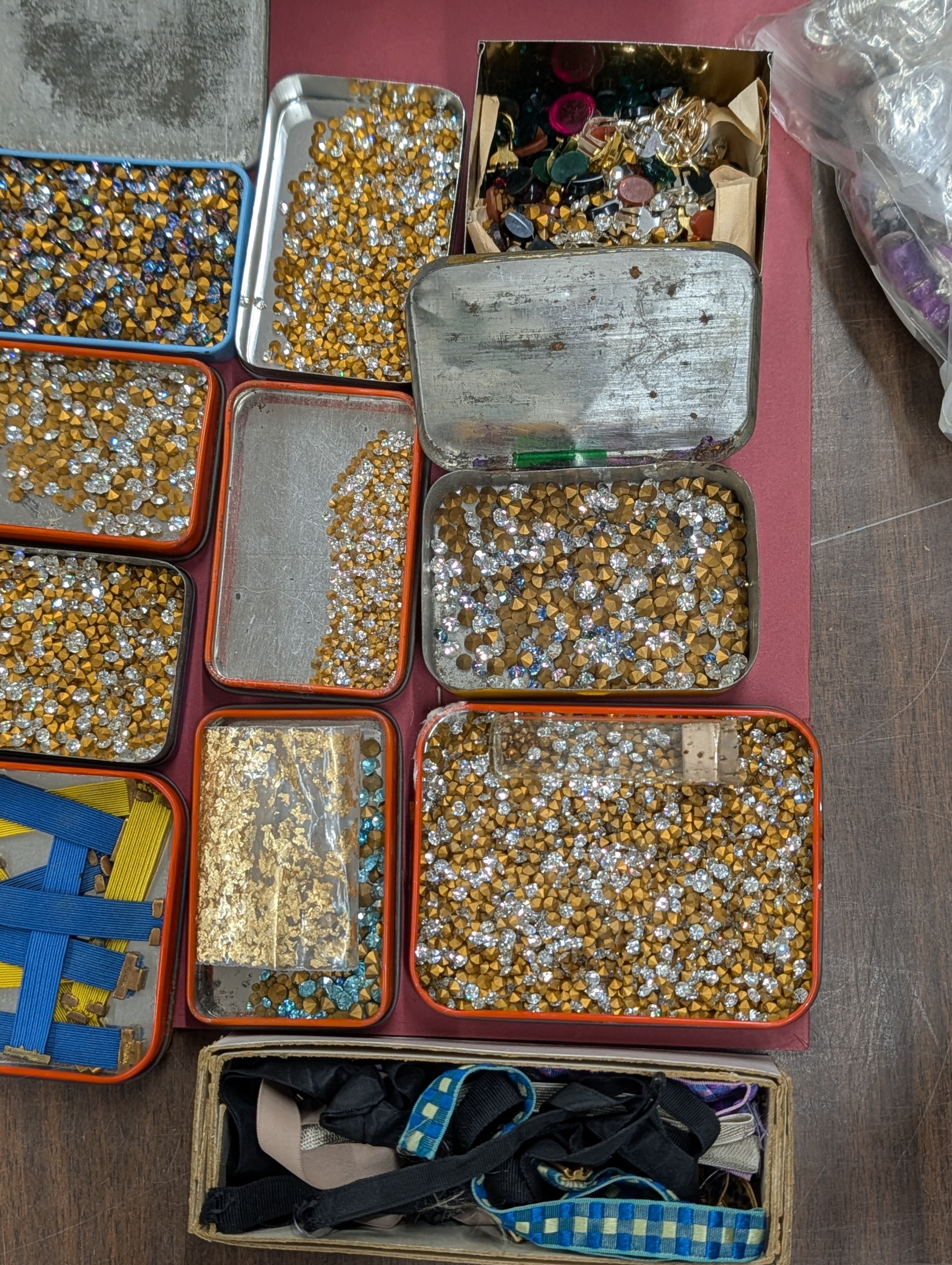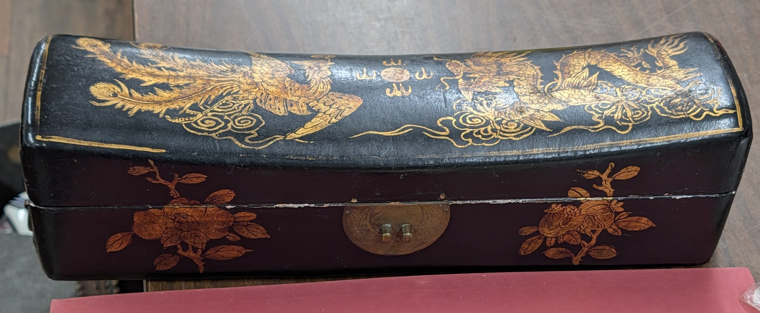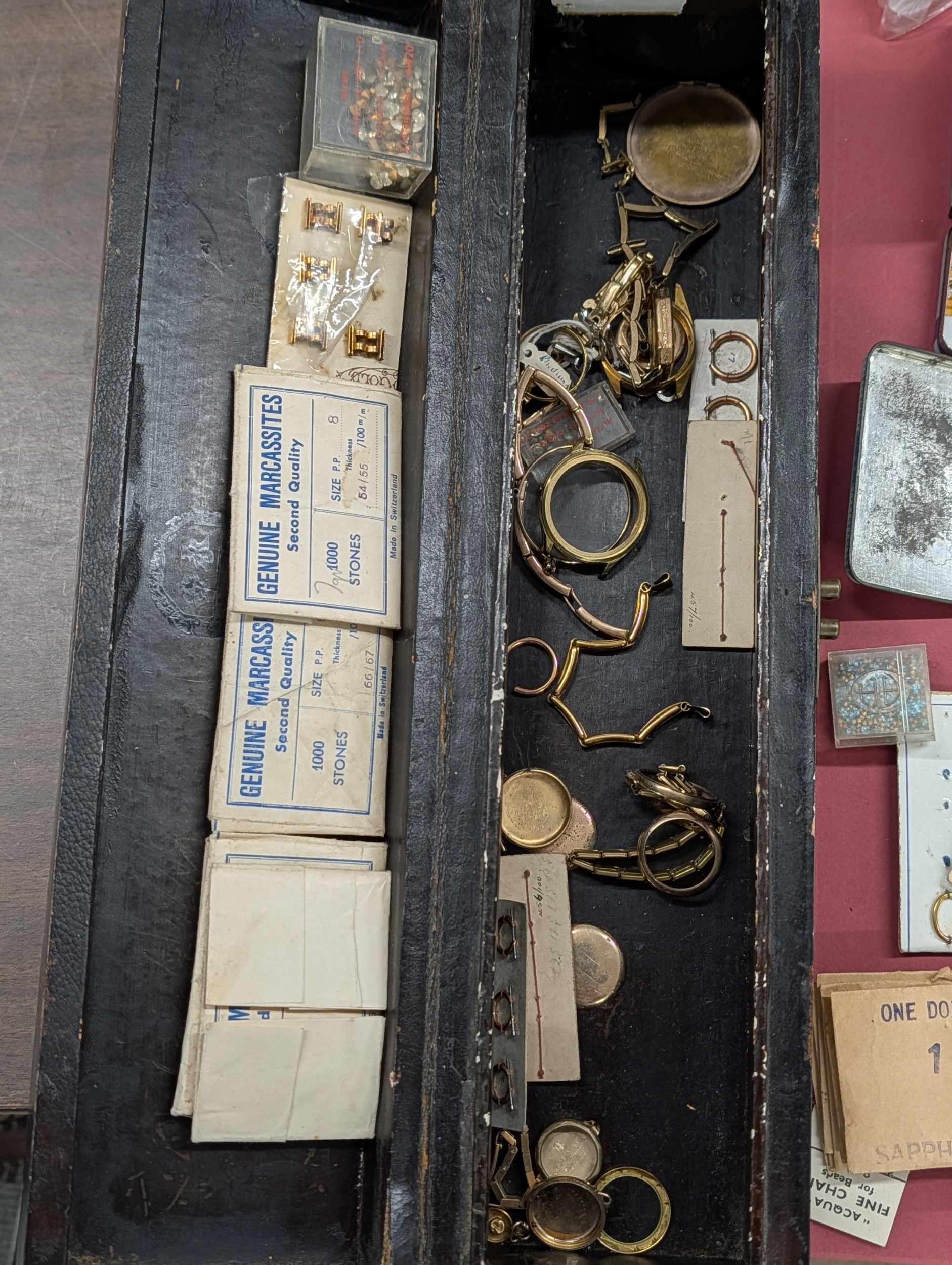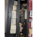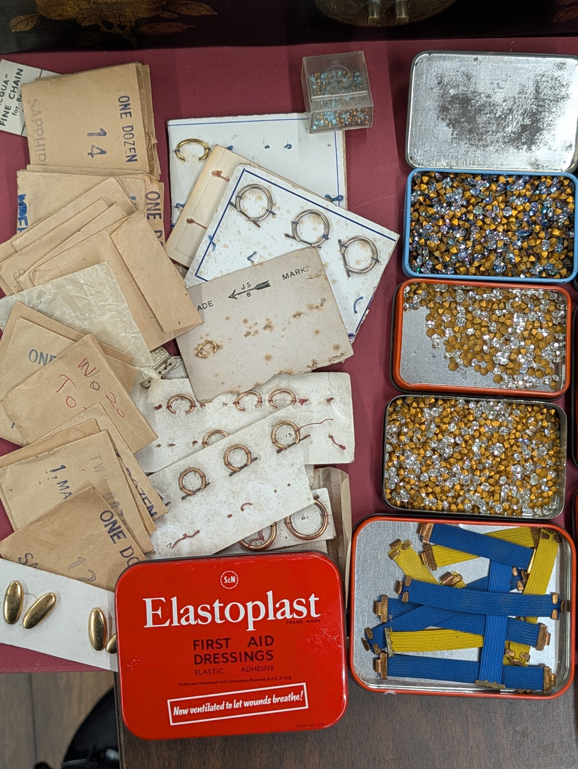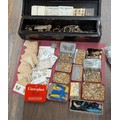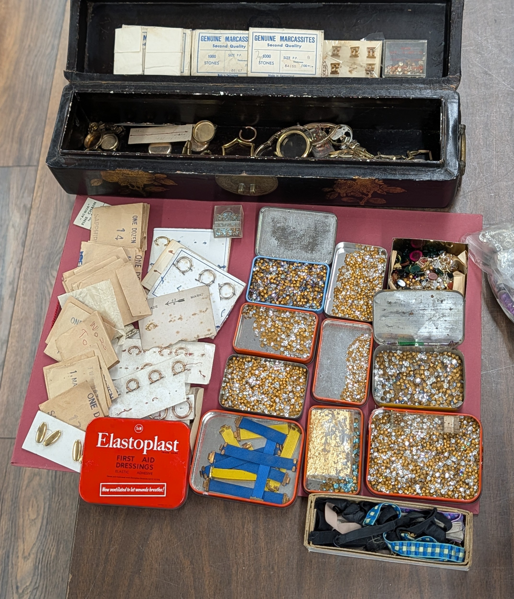 Assortment of Vintage Jeweller's and Watchmaker's Components in Chinoiserie Lacquer Pillar Style Box