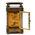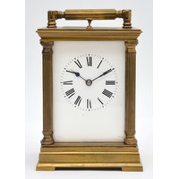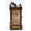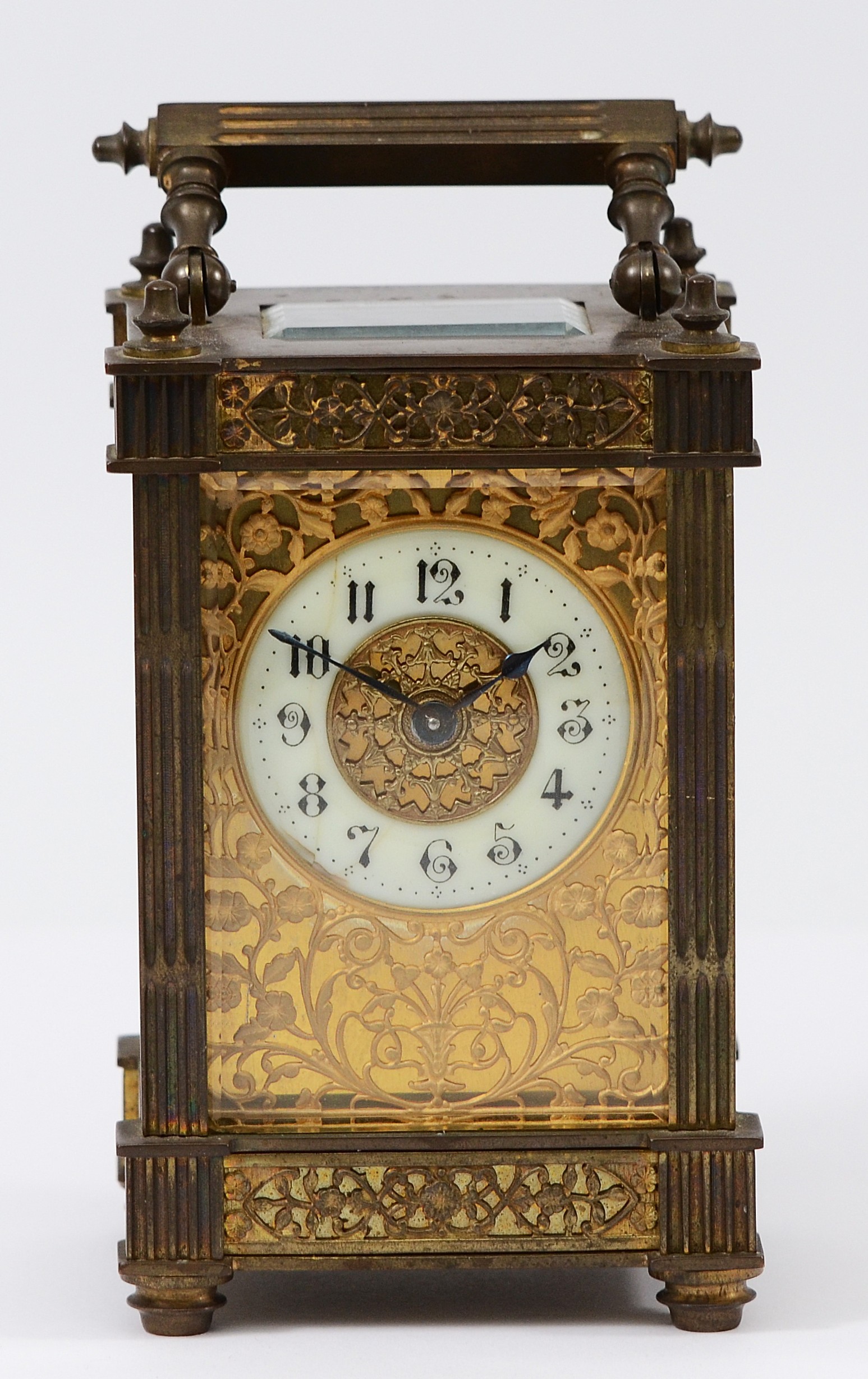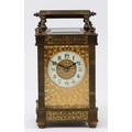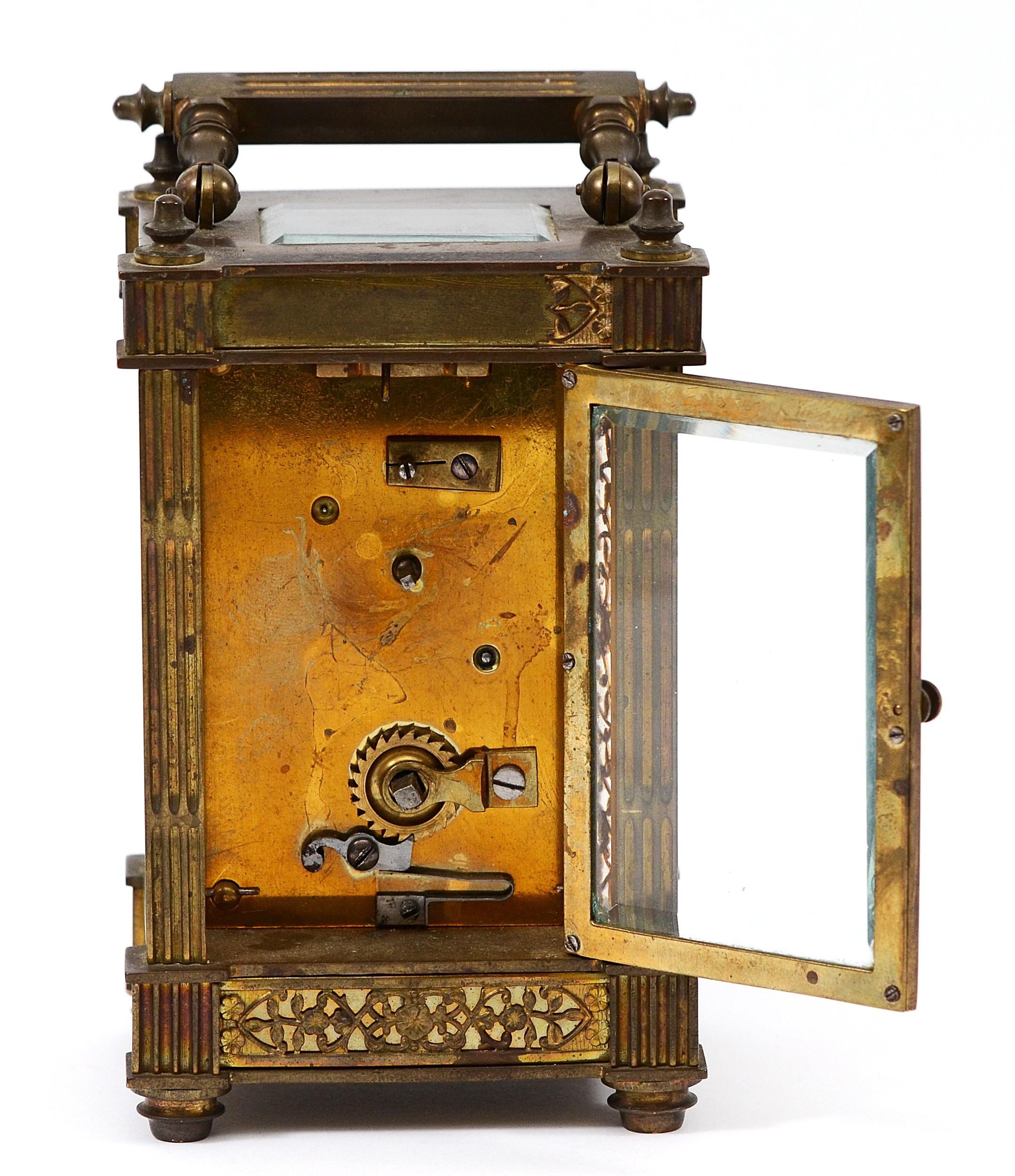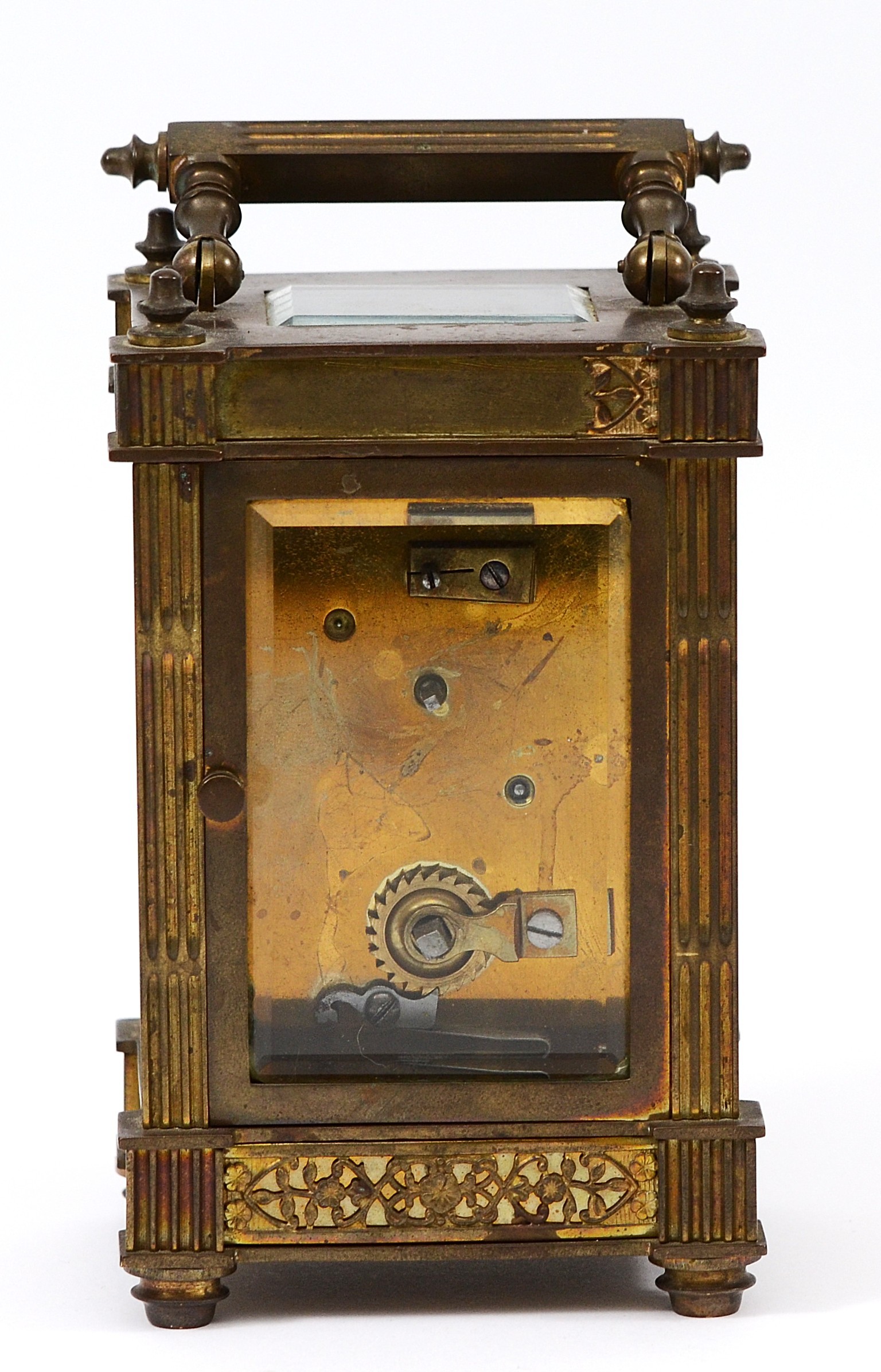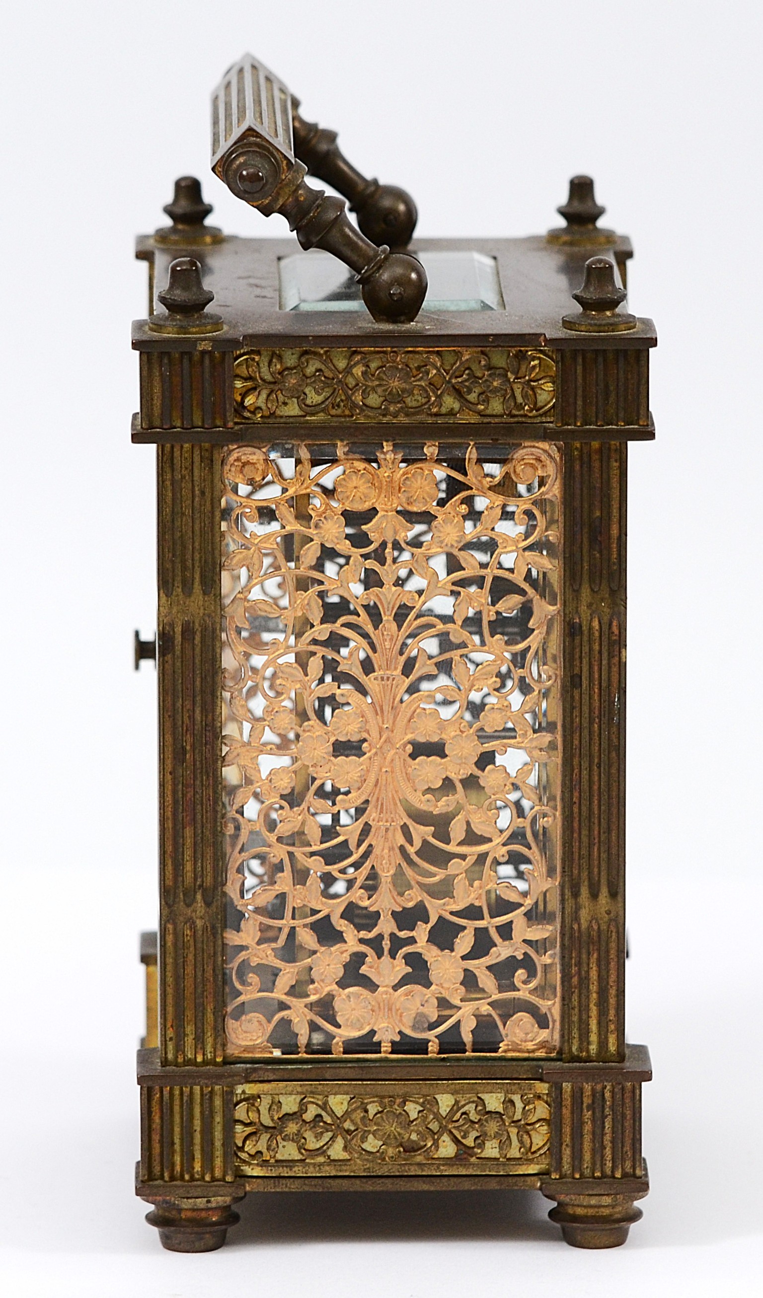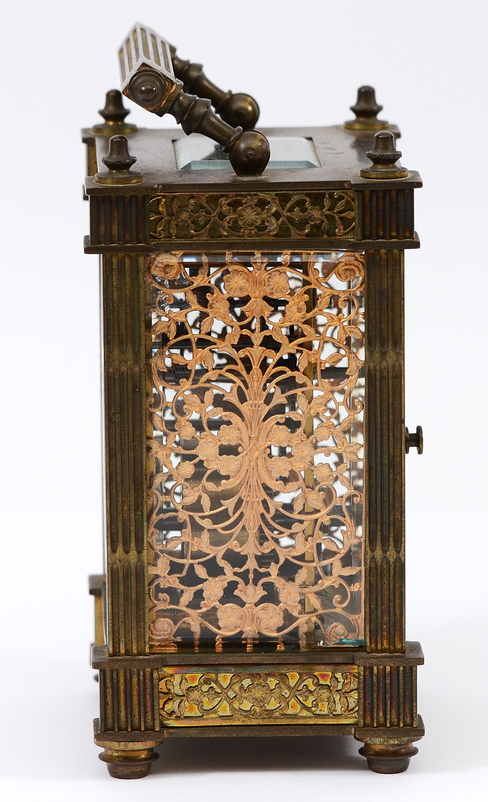 A late 19th century brass carriage timepiece, the off white chapter ring with Arabic numerals, pierced floral fretwork surround, similar side panels, the case with applied pierced fretwork and fluted columns, key, 13.5cm.
