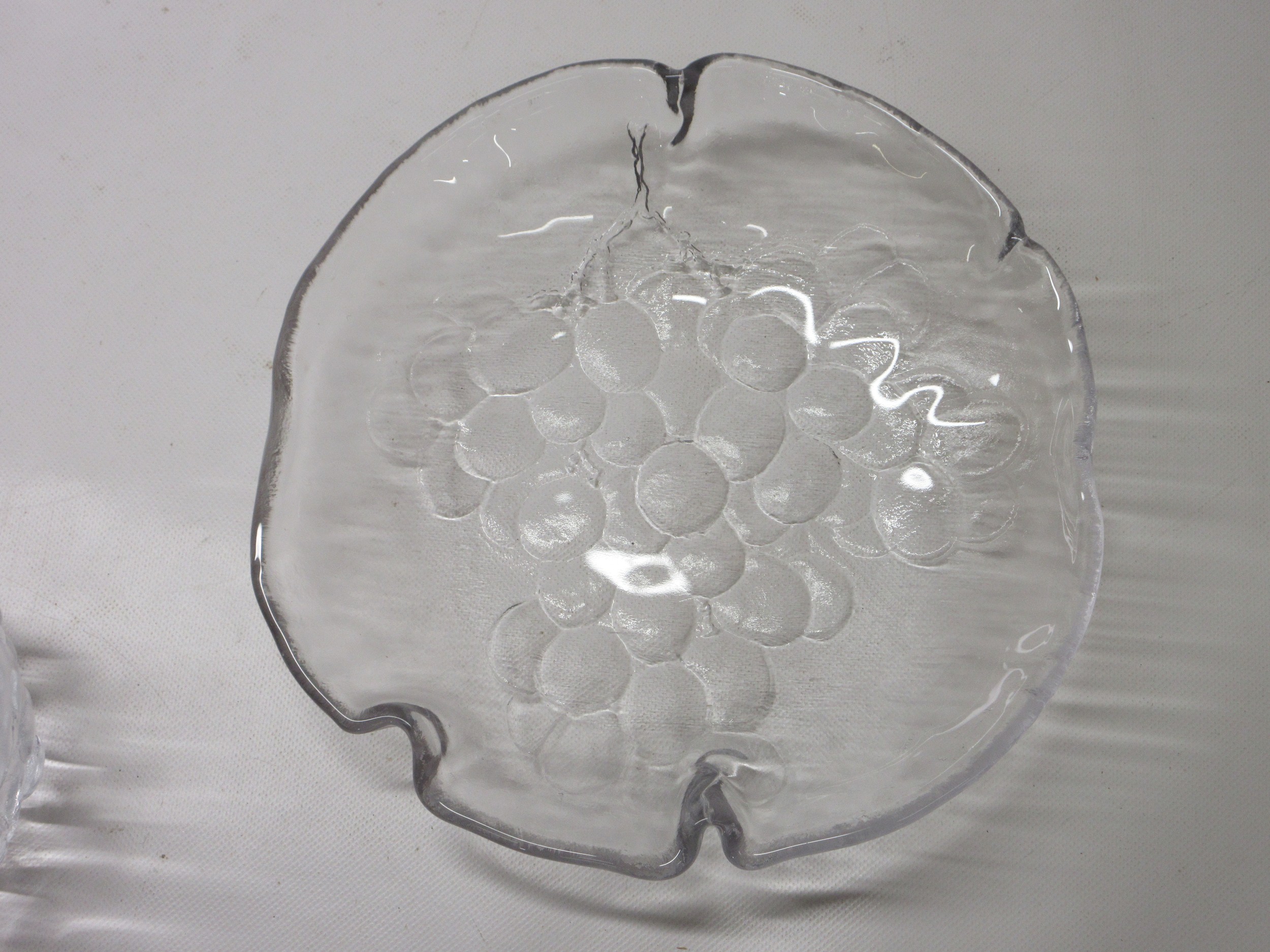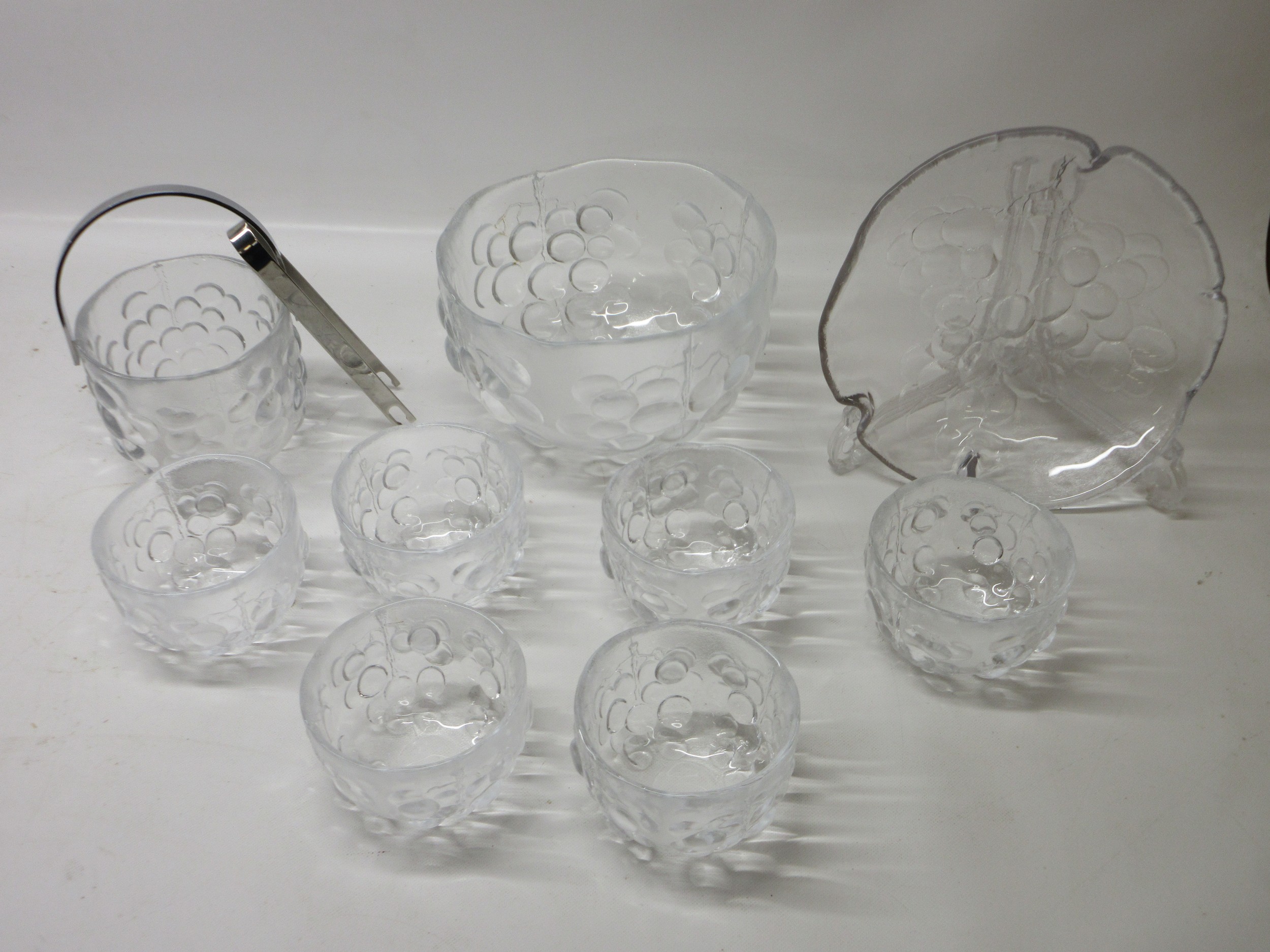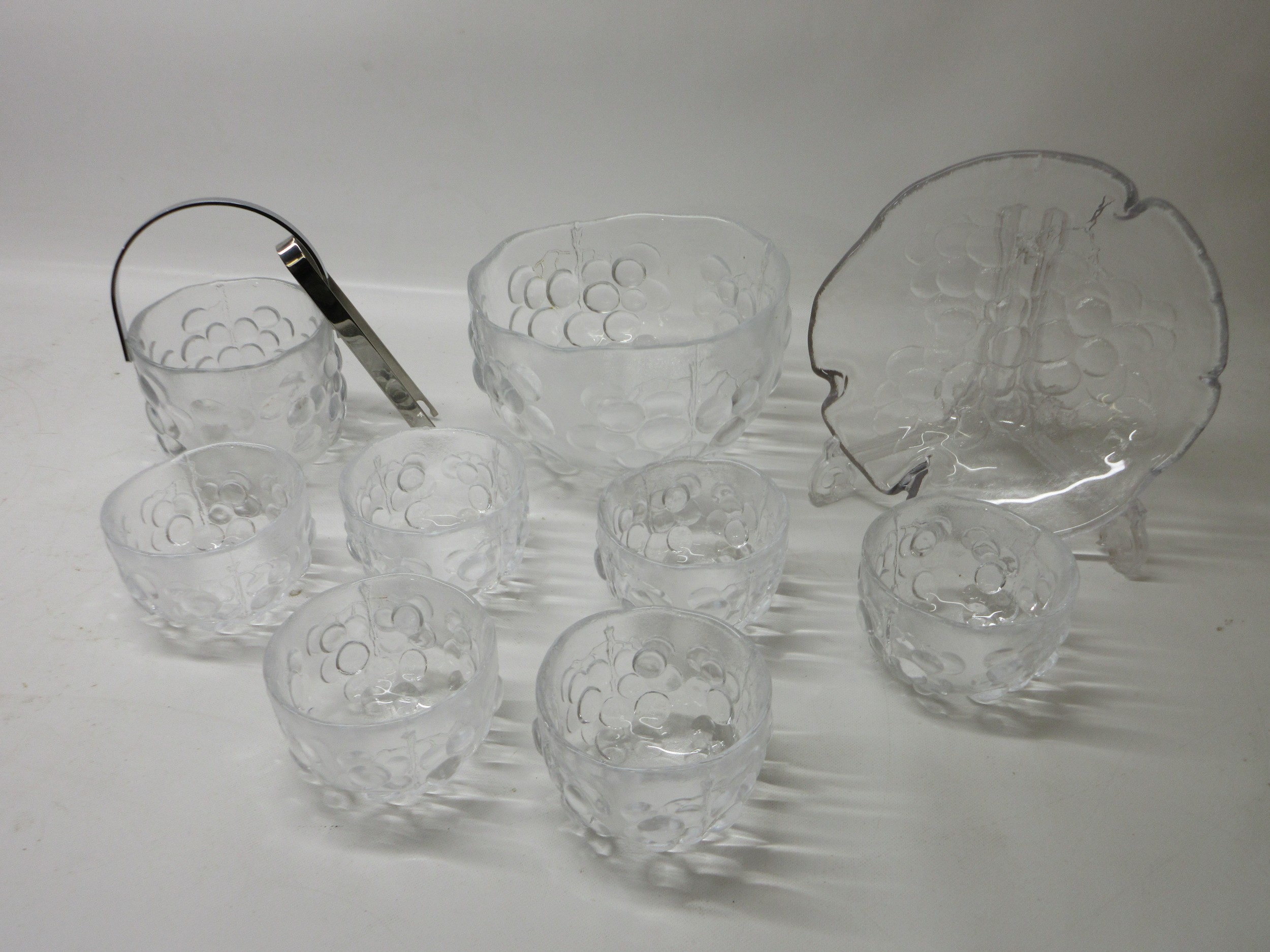 Kosta Boda Sweden, grape design glassware, six bowls, one matching fruit bowl, one ice bucket with tongs and one fruit platter Qty. 1 box