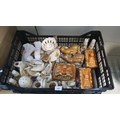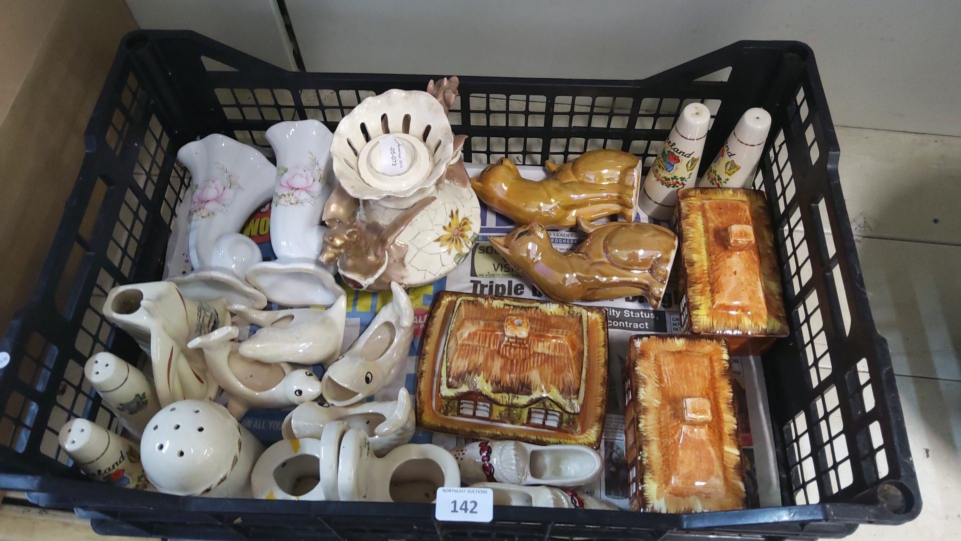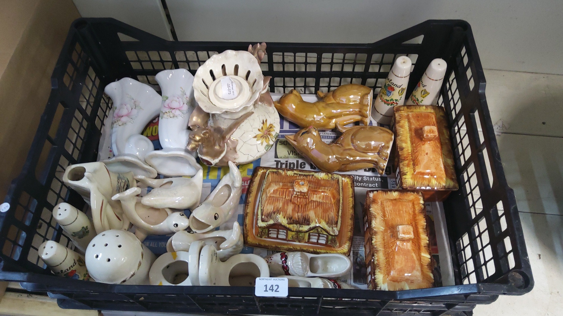 A mixed group of glazed ceramic table wares, including a floral-painted pair of vases, a figural centrepiece, animal-form dishes, cottage-motif lidded jars, and assorted cruets, shakers, and small serving pieces.