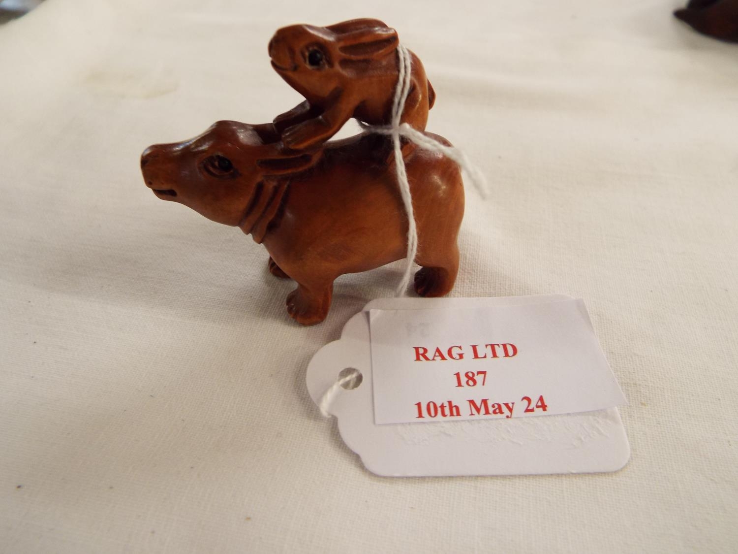 A hand carved boxwood netsuke of a hippo and hare signed to ...