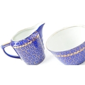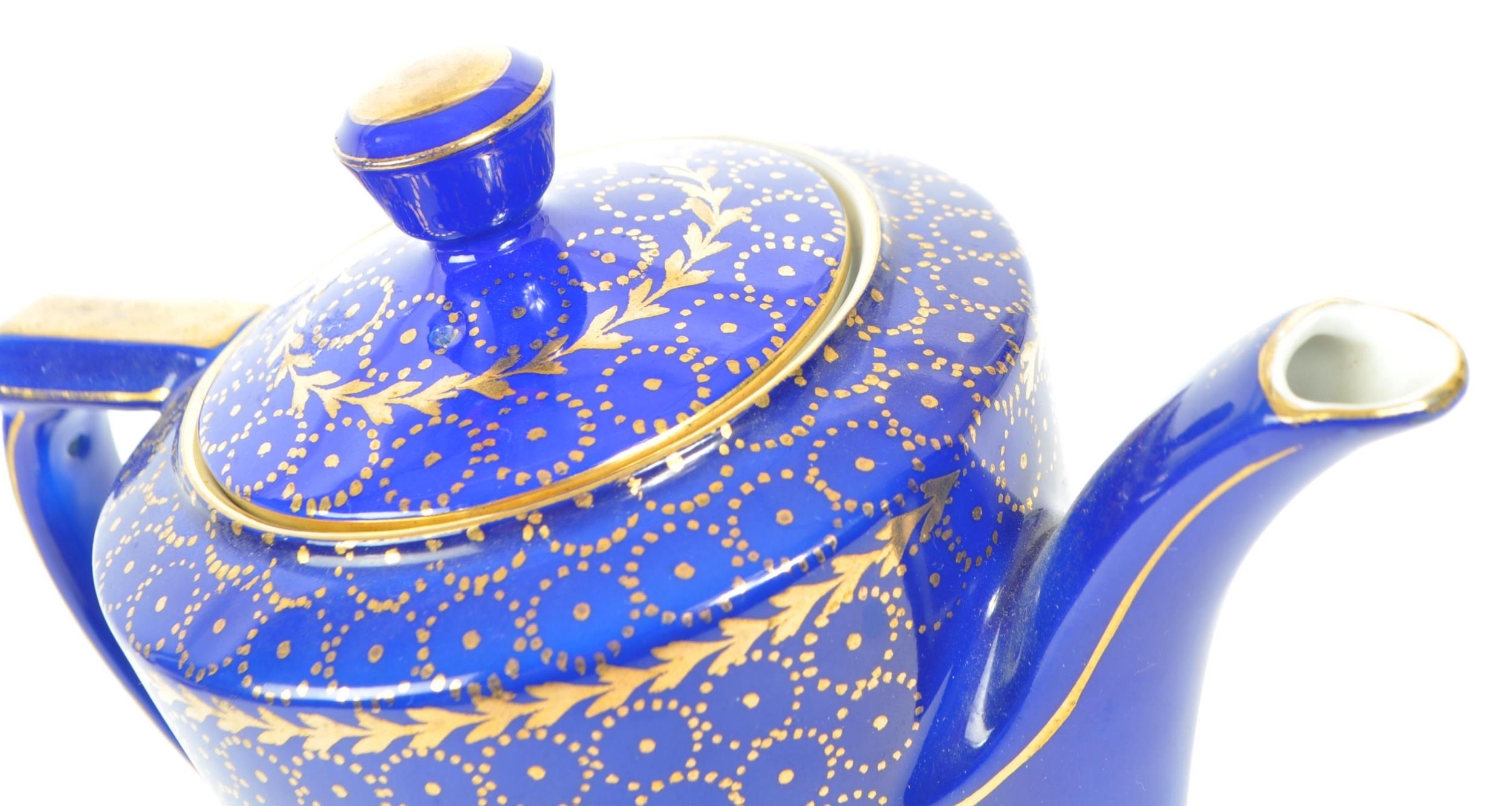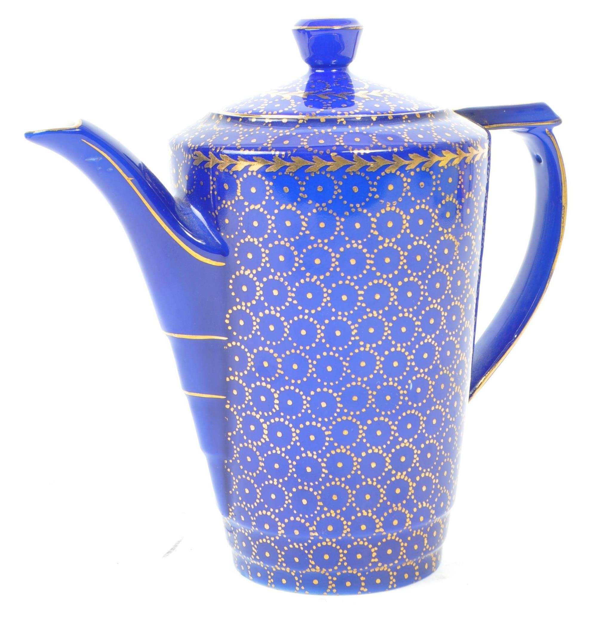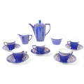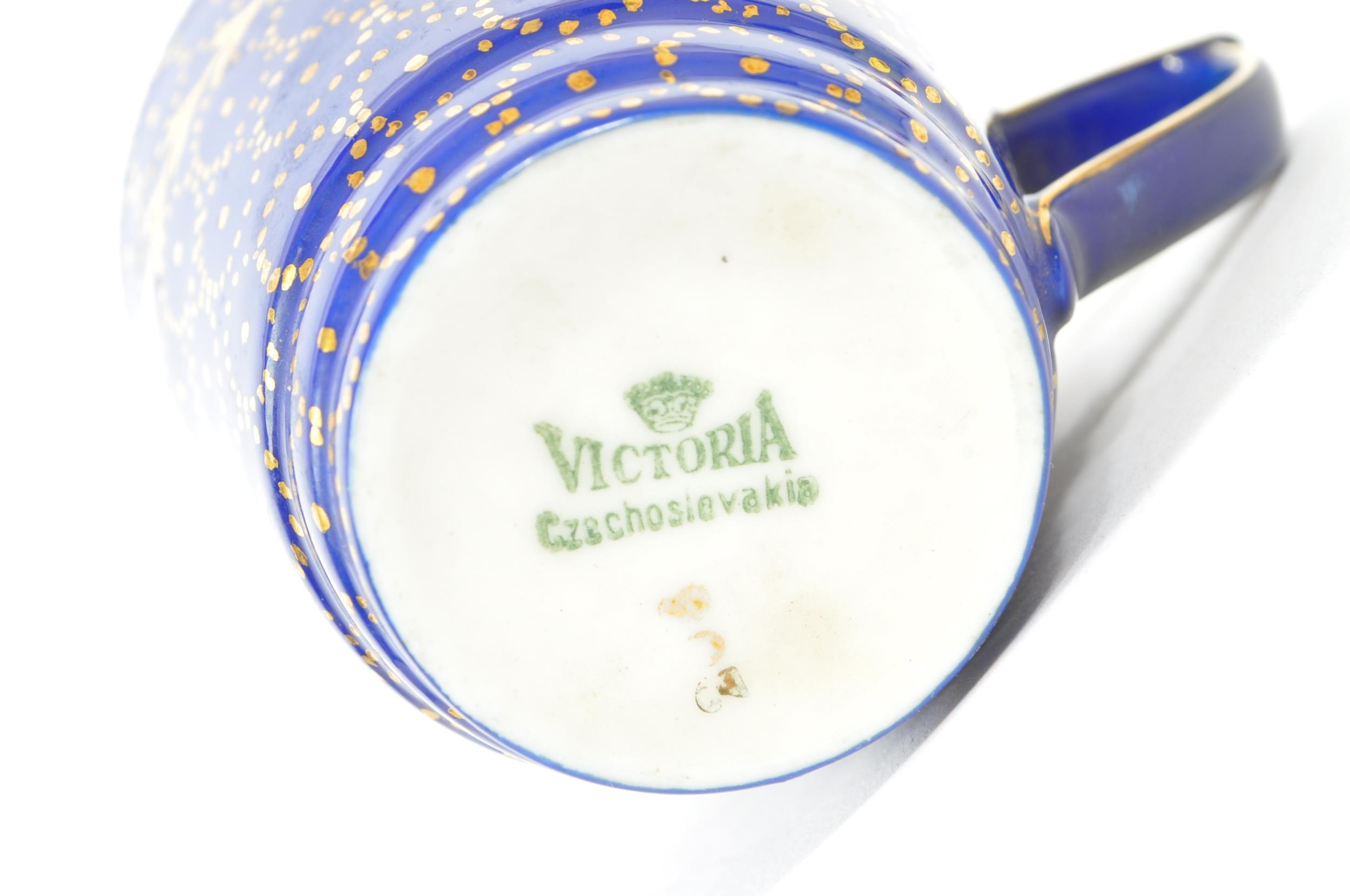 A 20th century Czechoslovakian porcelain 'Victoria' coffee service. To comprise of coffee pot, teacups, saucers, milk jug and sugar bowl. The service having cobalt ground with tessellating gilt patterning. Marked to base. Teapot measures 18cm (height).
