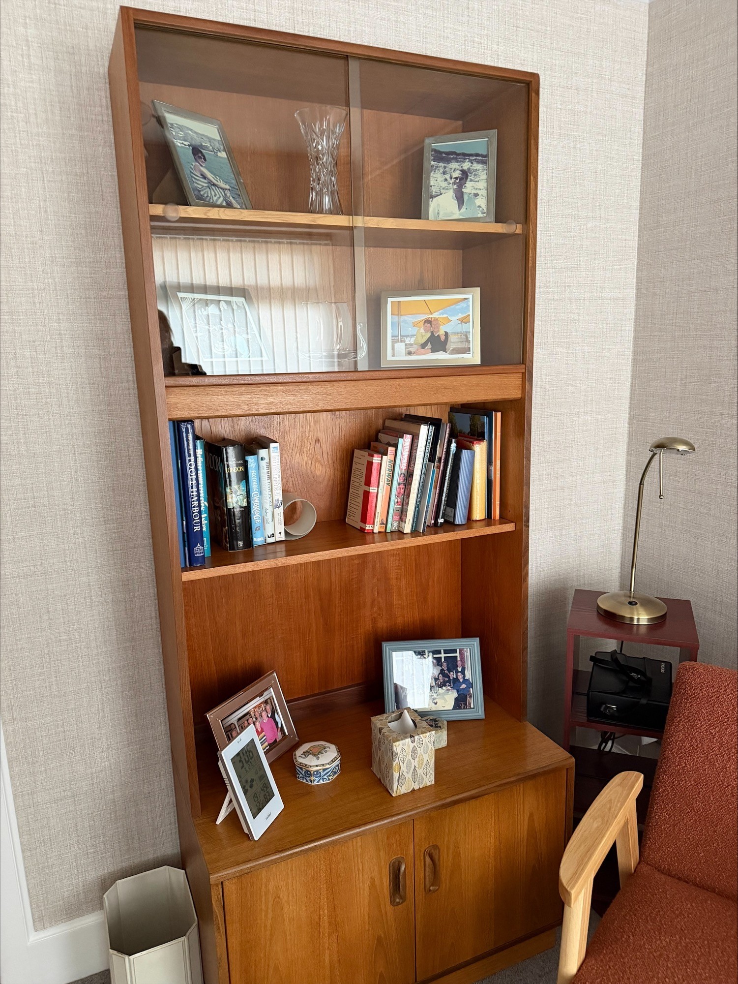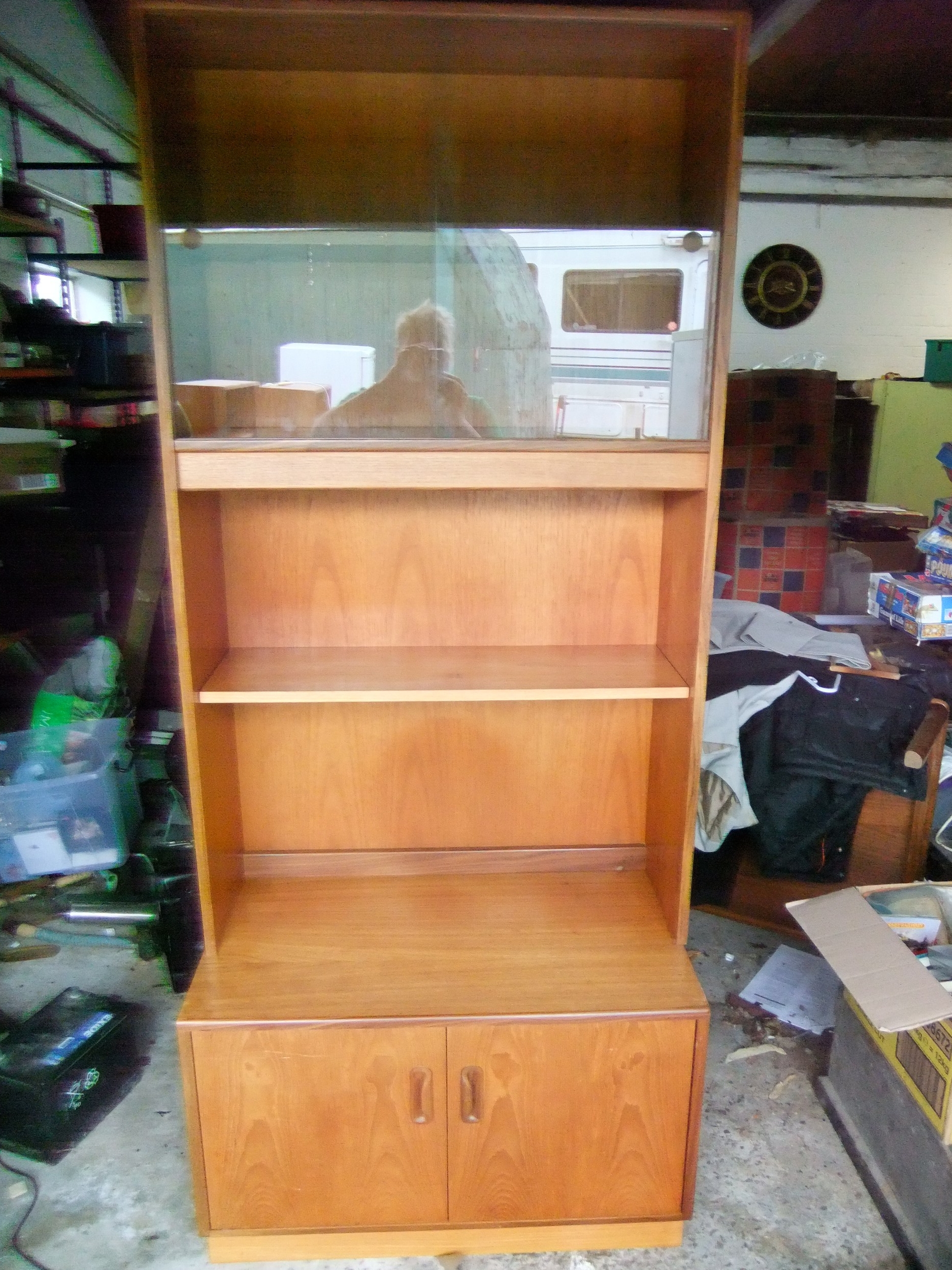 A large G-Plan (E Gomme) wall unit, cupboard to base with shelves over, glazed to top, in excellent order, with internal lighting. Unit breaks down into 2 for transport, assembled height roughly 6' 6" (at a guess!)