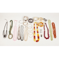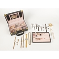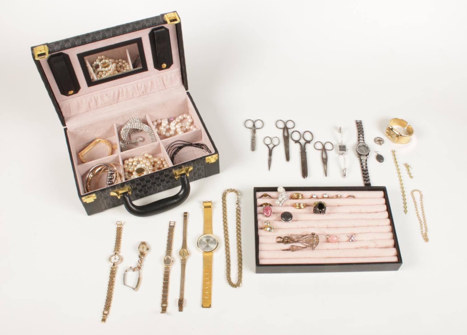 An assortment of costume jewellery presented in a small briefcase. Comprising of two gold plated ladies Rotary wrist watches, rings, brooches and bracelets etc.