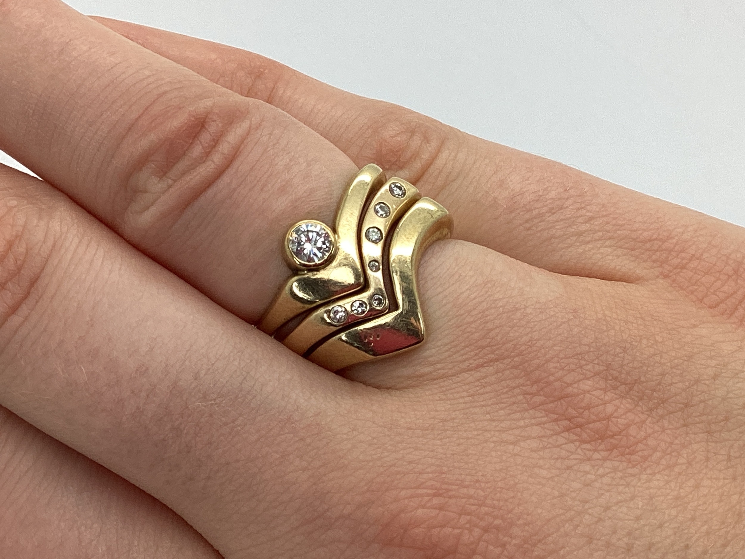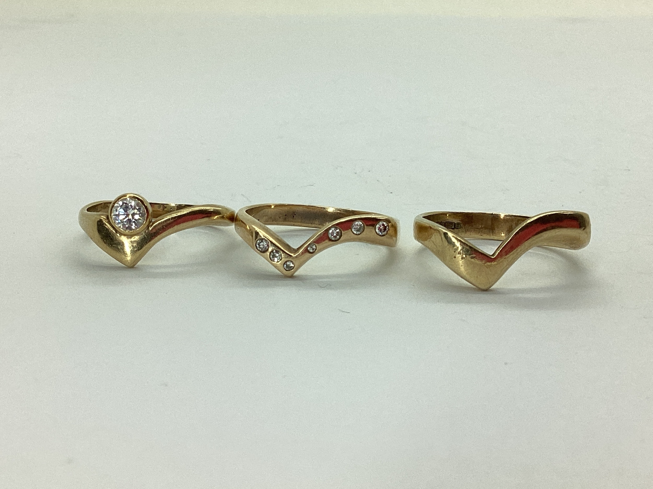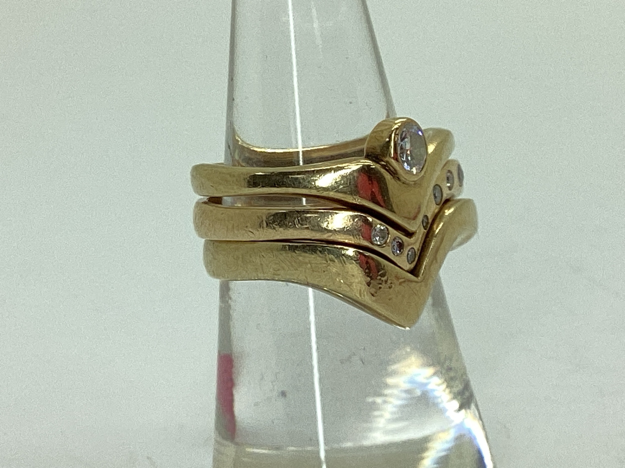 A Bespoke 9ct Gold Three Piece Wedding Band Set, of modern asymmetric wishbone design, consisting of a single stone rubover set diamond engagement ring (finger size N1/2), a diamond inset eternity ring (finger size O), and a plain wedding band (finger size N1/2). (3)