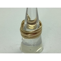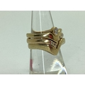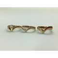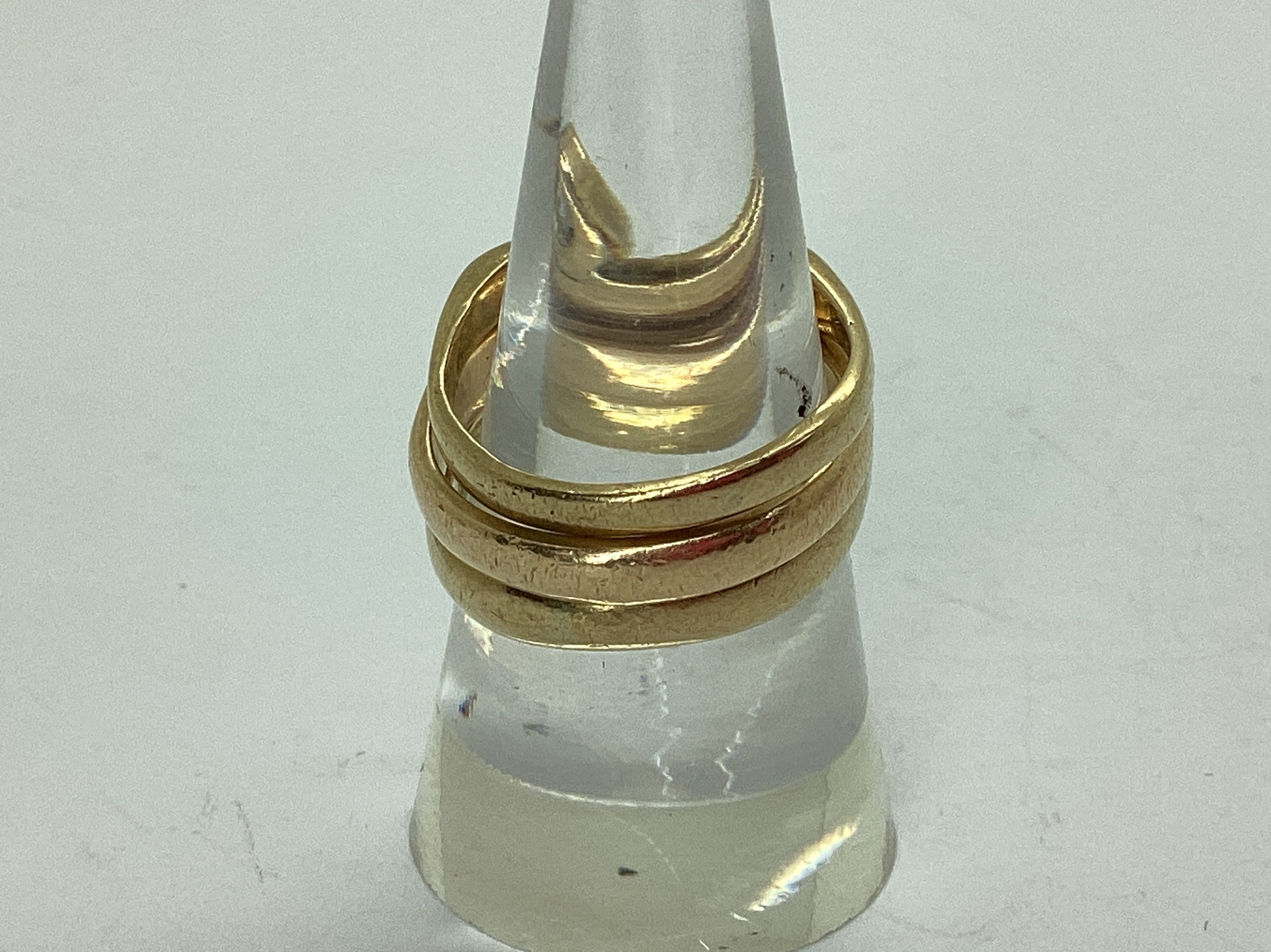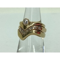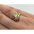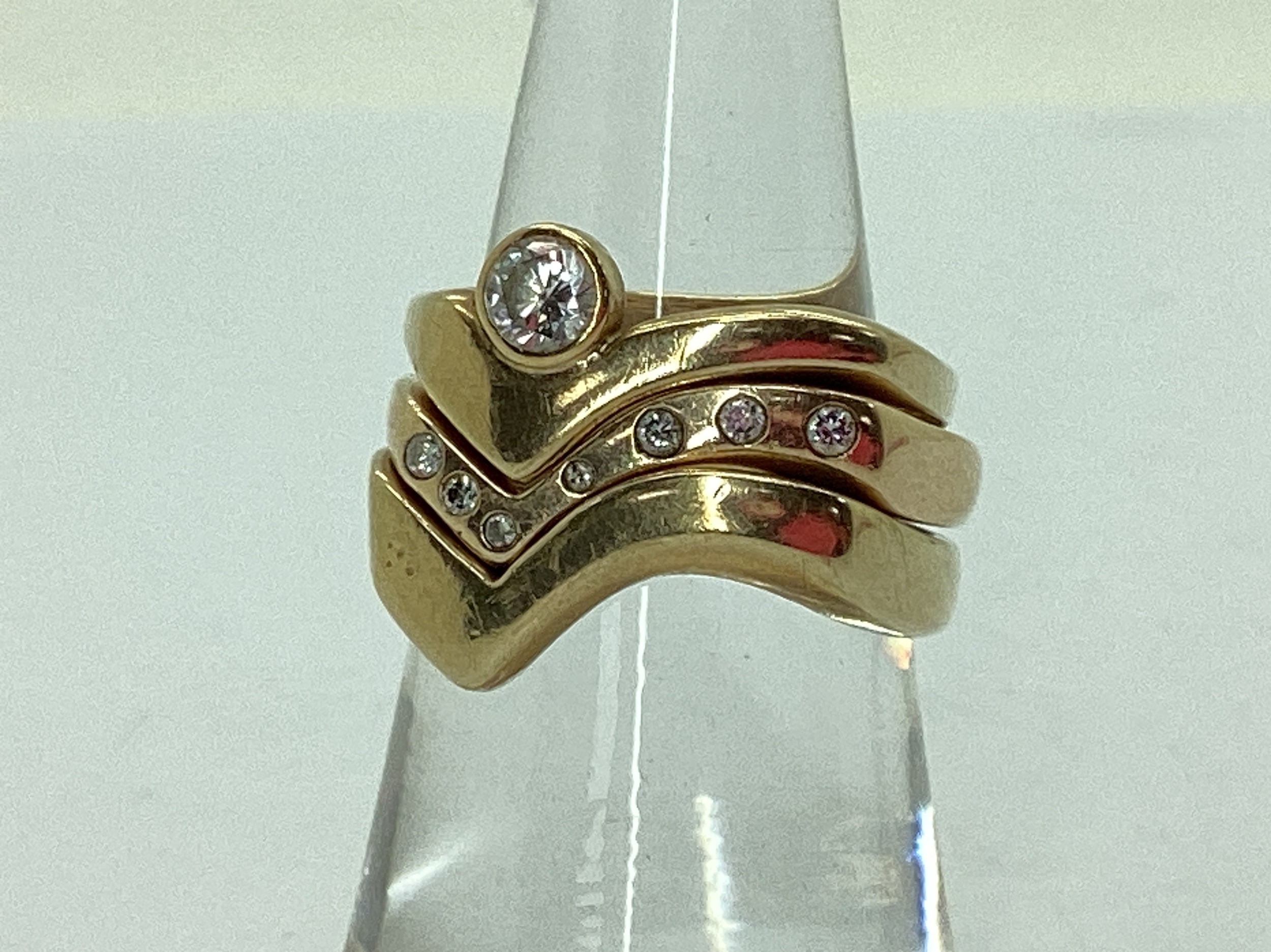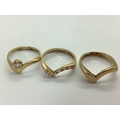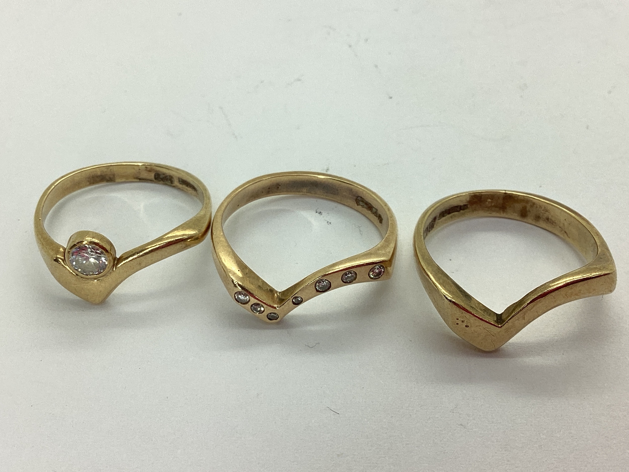 A Bespoke 9ct Gold Three Piece Wedding Band Set, of modern asymmetric wishbone design, consisting of a single stone rubover set diamond engagement ring (finger size N1/2), a diamond inset eternity ring (finger size O), and a plain wedding band (finger size N1/2). (3)