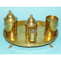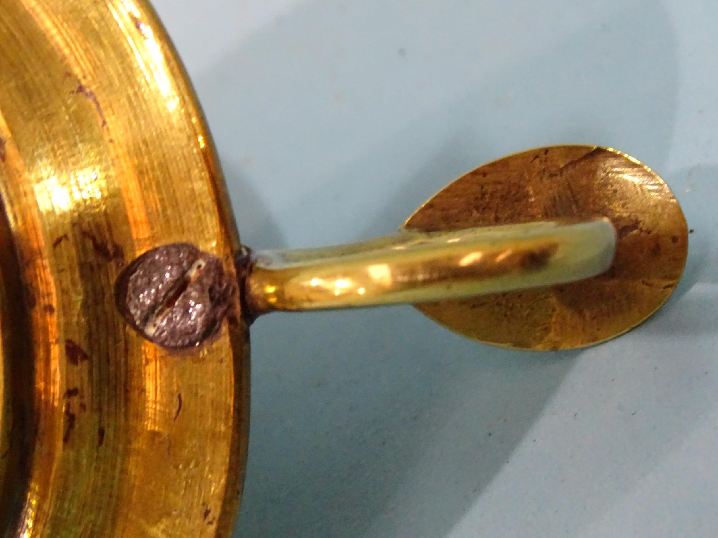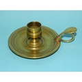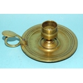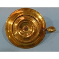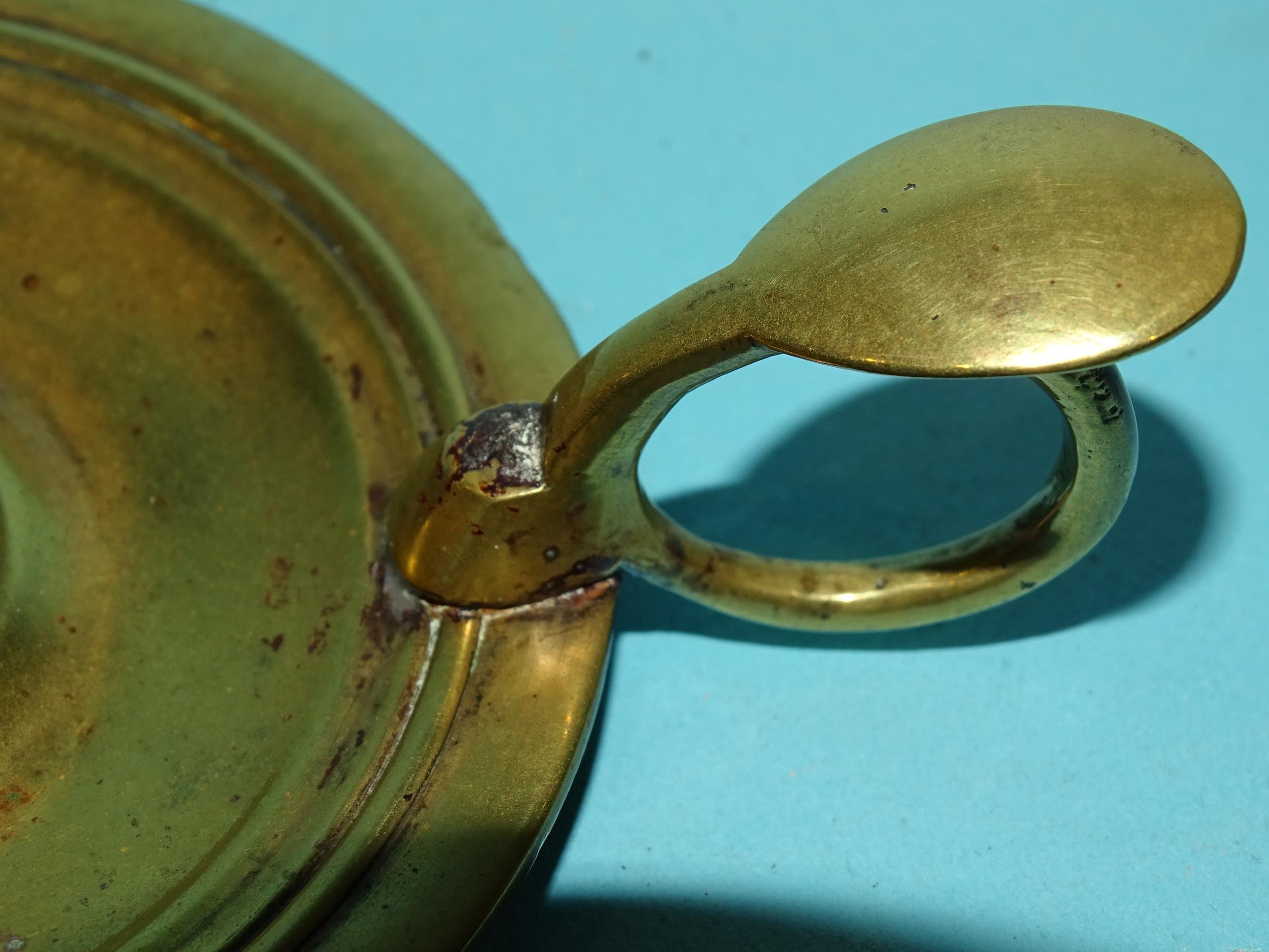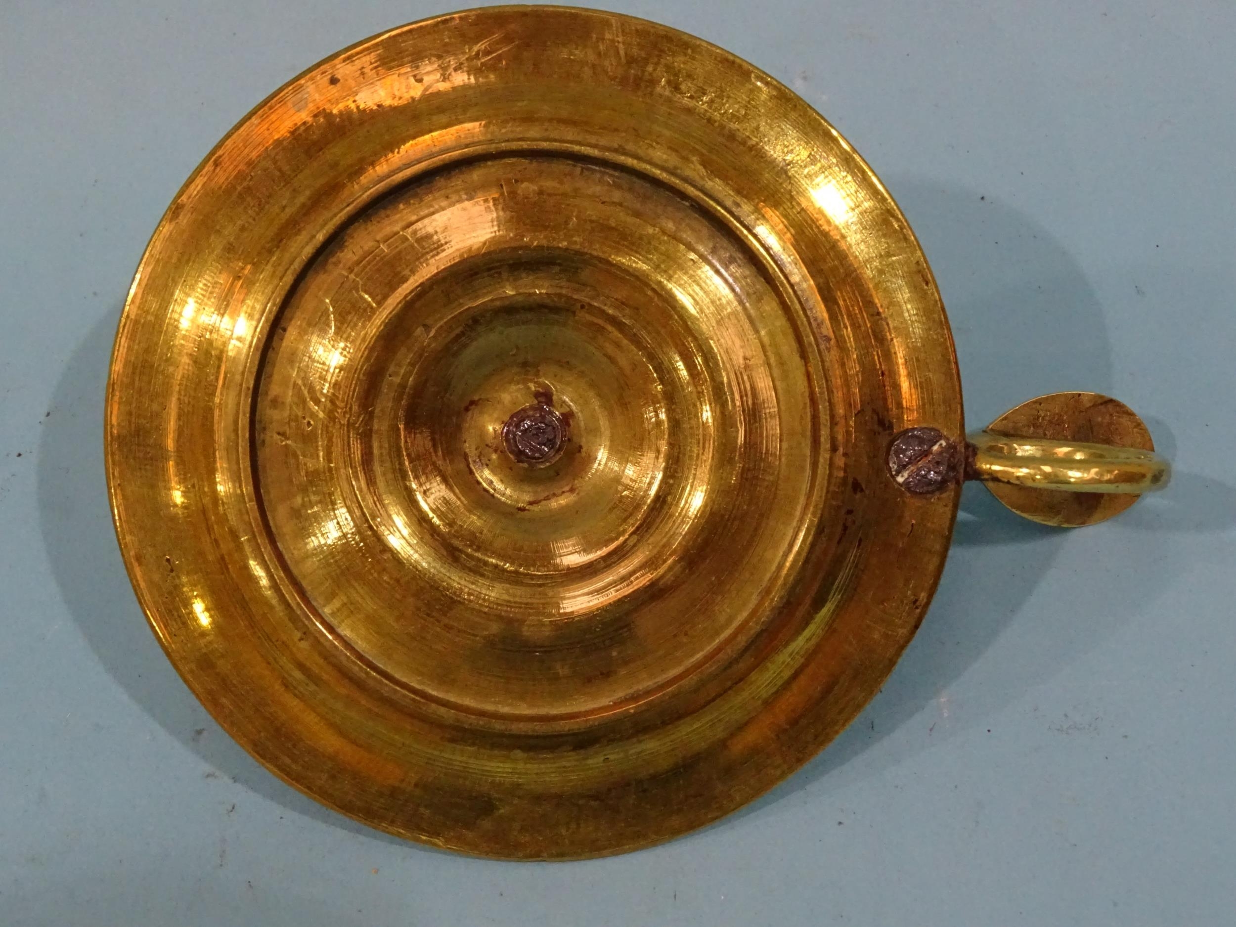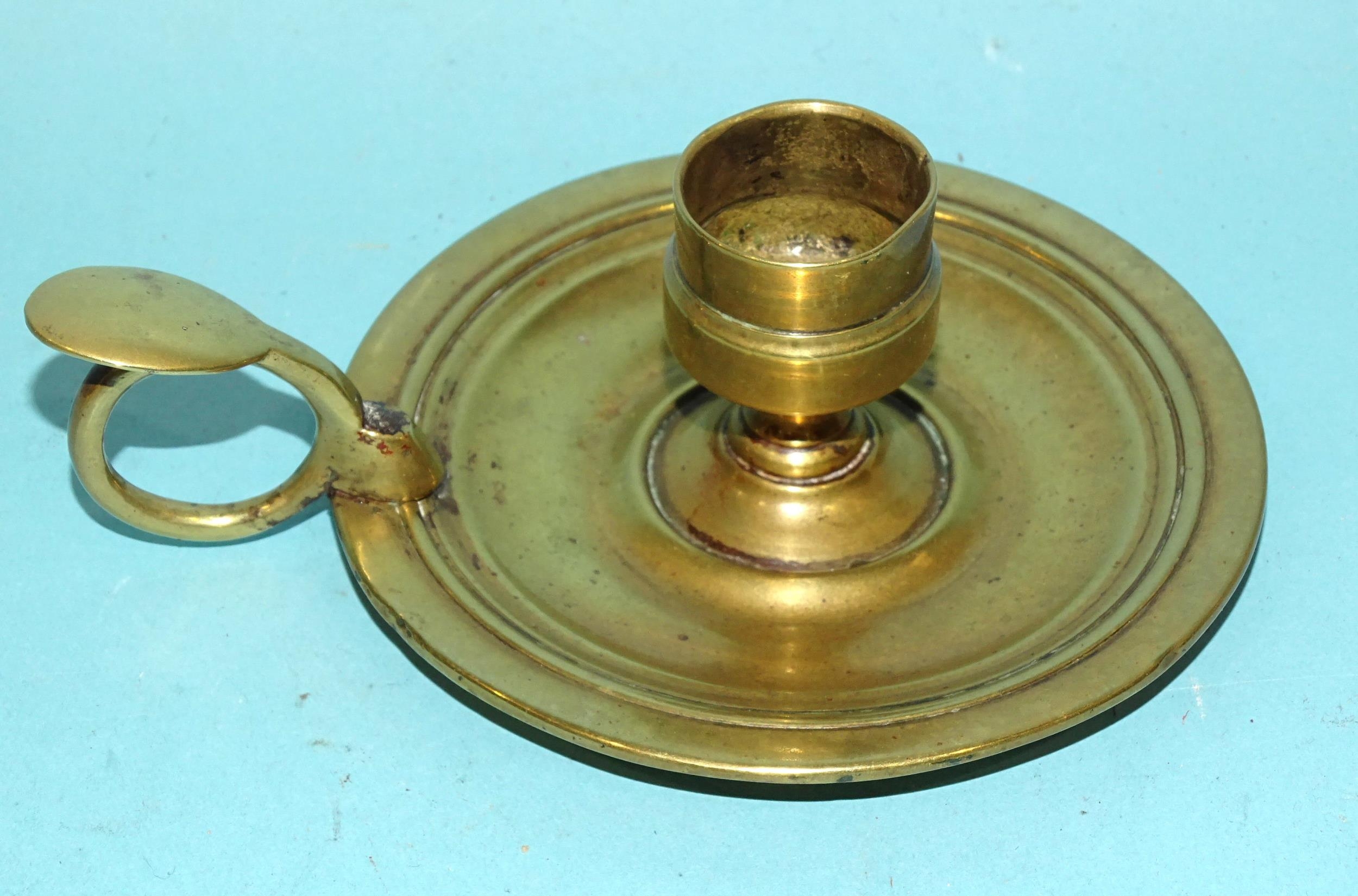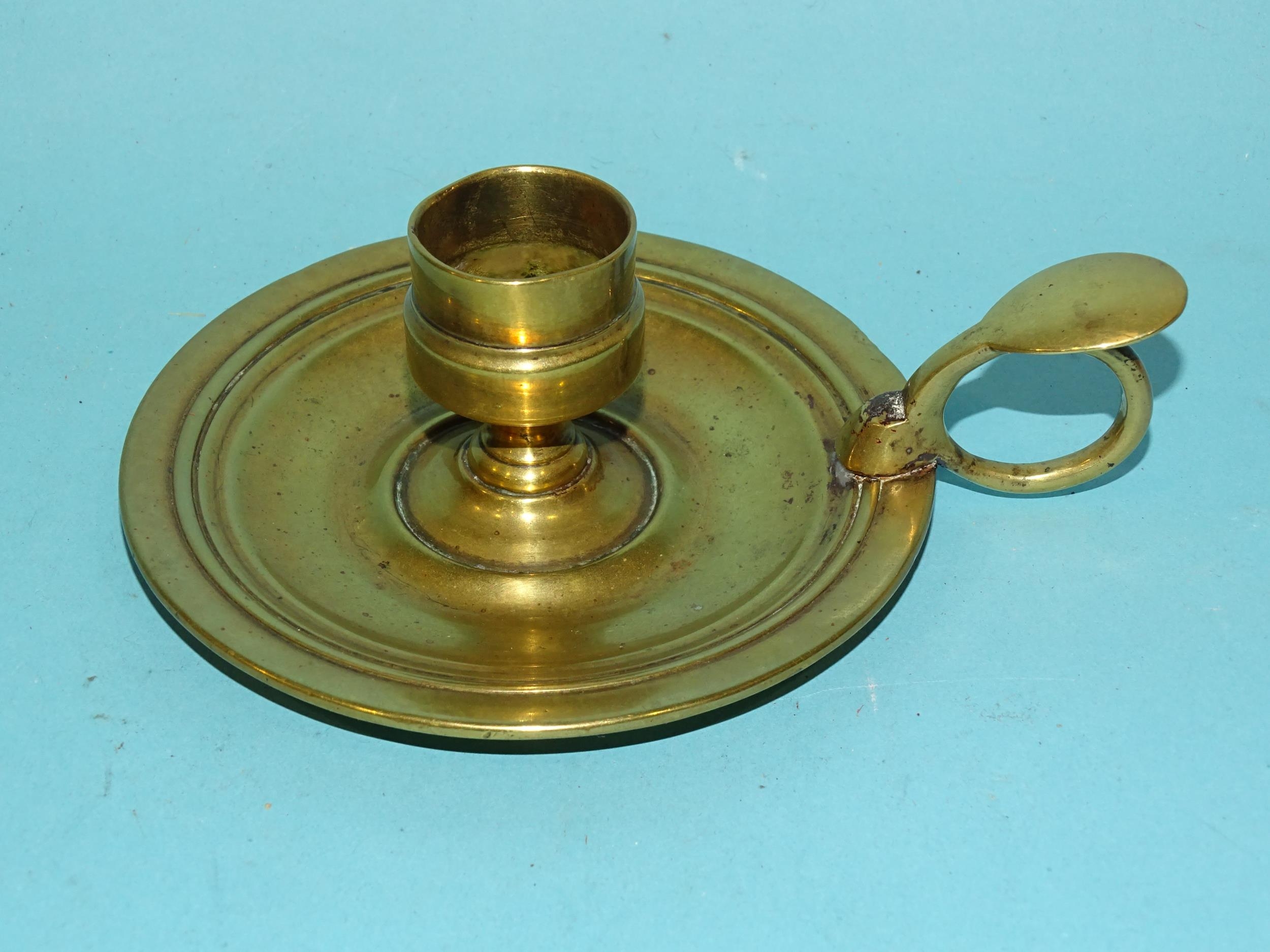 An 18th century brass chamberstick, the circular base with early screw-mounted sconce and finger loop with thumb tab, 10.5cm diameter excluding handle, 5cm high.