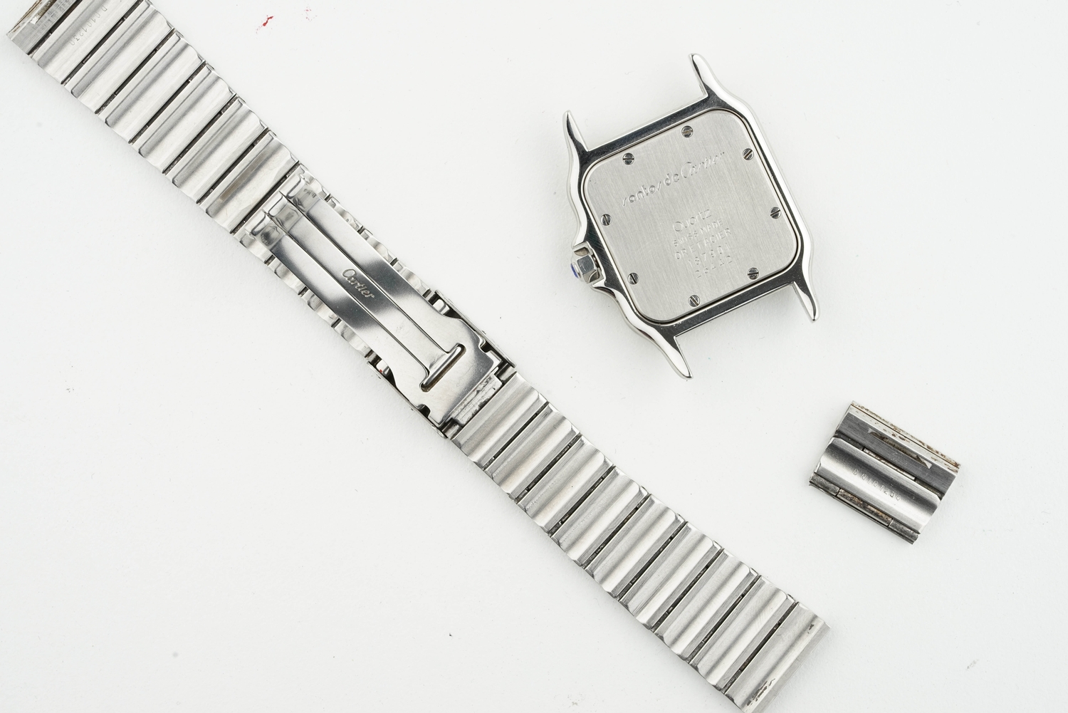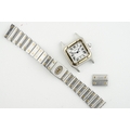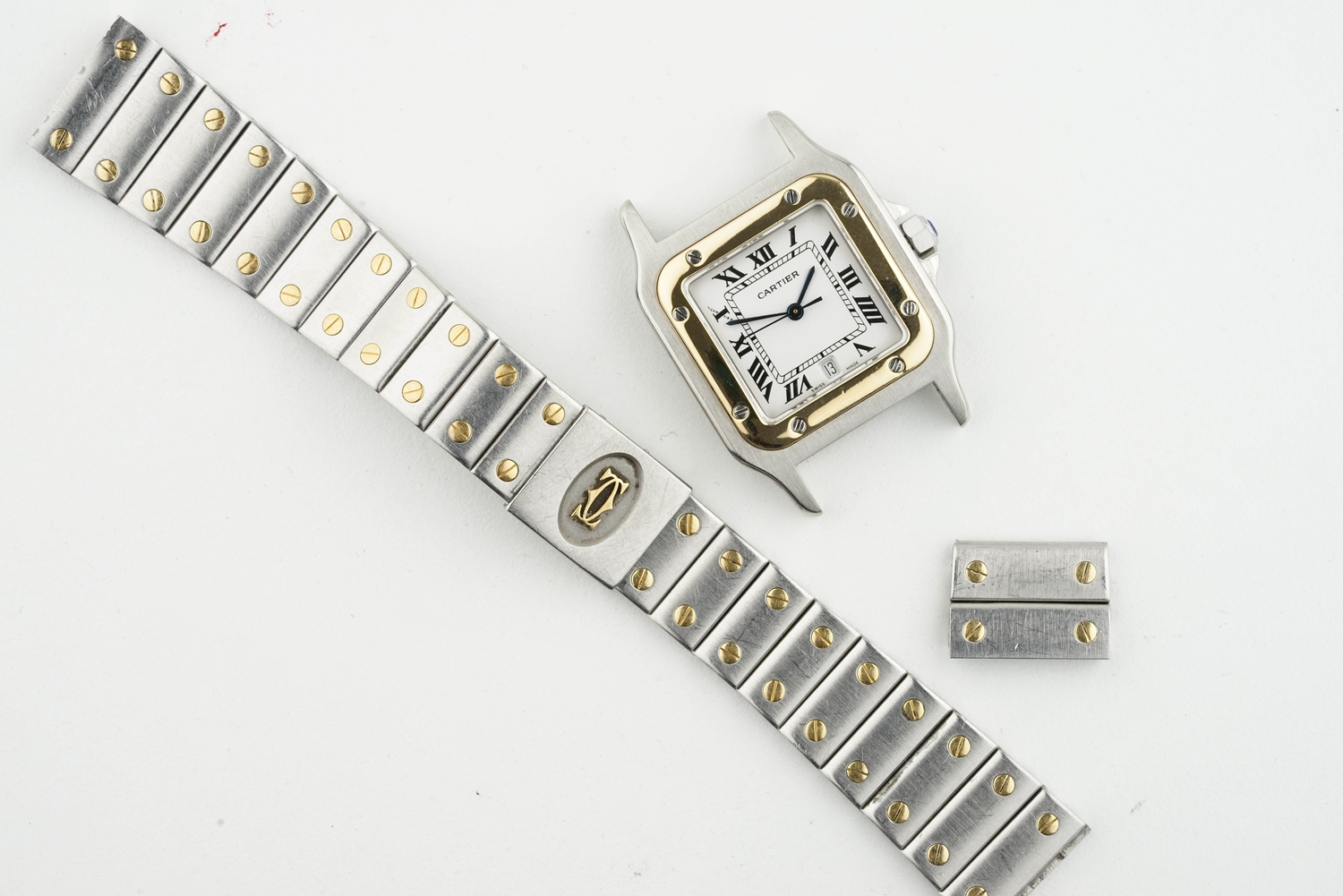 CARTIER SANTOS GALBEE STEEL & GOLD DATE REF. 187901 CIRCA 1980s, square off white dial with blue roman numeral hour markers and hands, 29mm stainless steel and gold case with a sapphire crown and a case back, inside is a quartz movement, on a leather strap, comes with its original bracelet which needs attention, currently running.