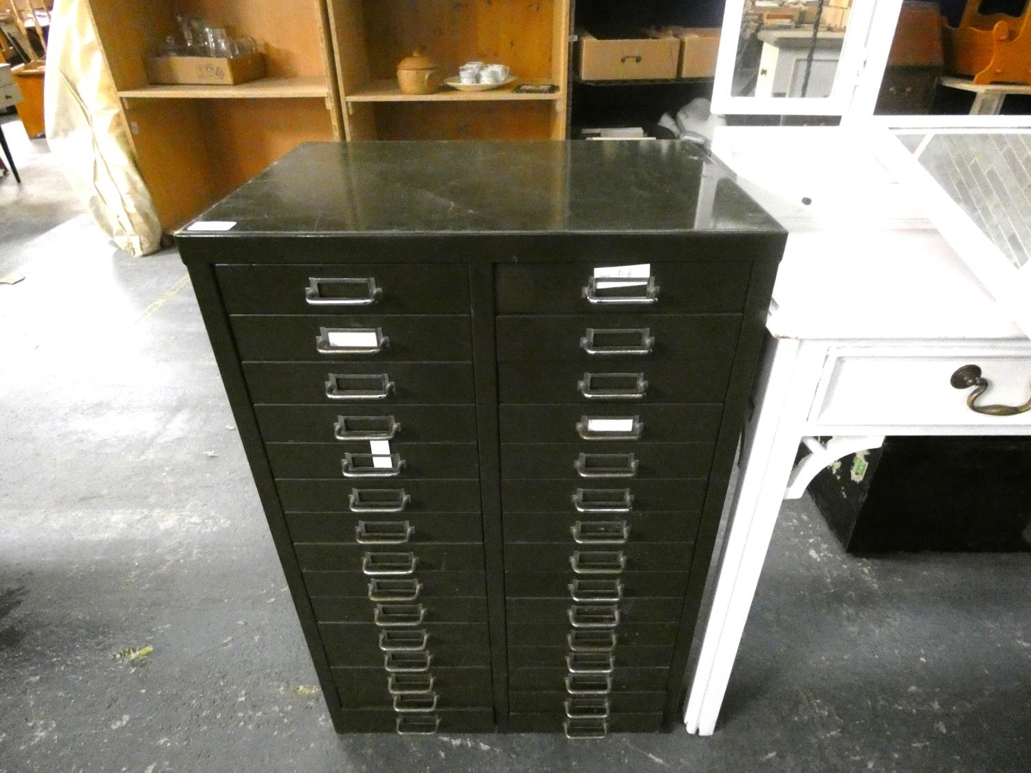 Double bank of filing drawers.