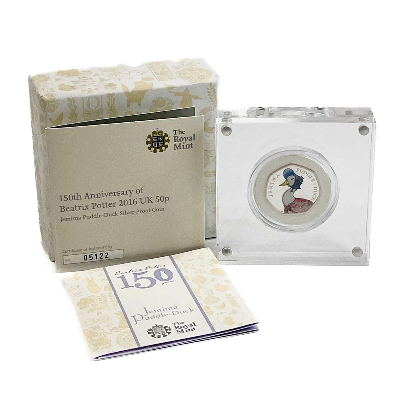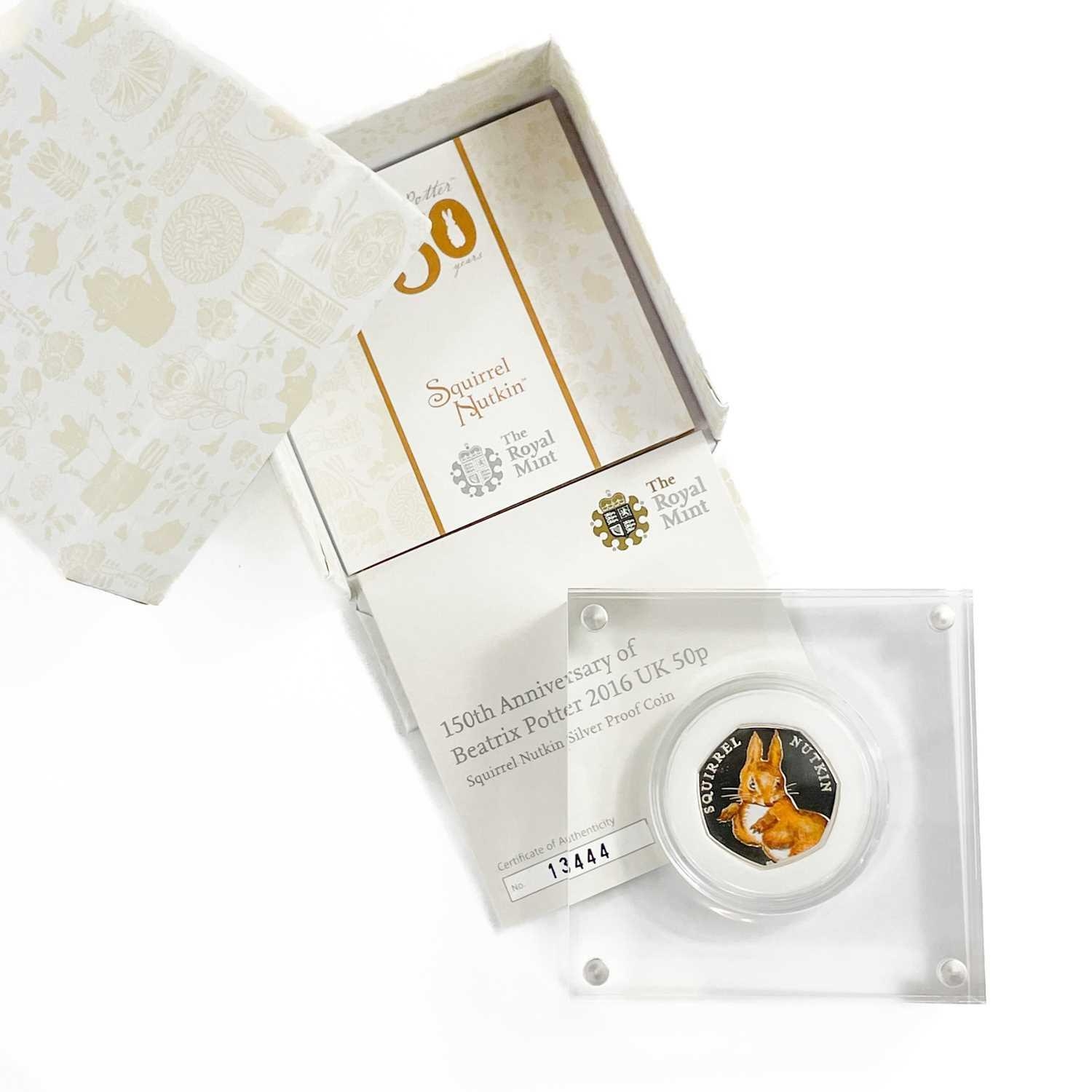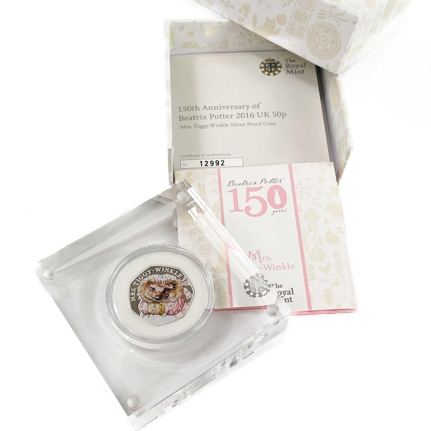 UK 50 pence 2016 Beatrix Potter Royal Mint silver proof coins (x5). Comprising: 1: A colourised Peter Rabbit limited edition 50p silver proof Royal Mint/Royal Mail coin cover. 2: A 150th anniversary silver proof encapsulated boxed Royal Mint pack. 3: 3x colourised Beatrix Potter 50p silver proof characters including Jemima Puddleduck, Mrs Tiggy-Winkle and Squirrel Nutkins all encapsulated in perspex display stand.