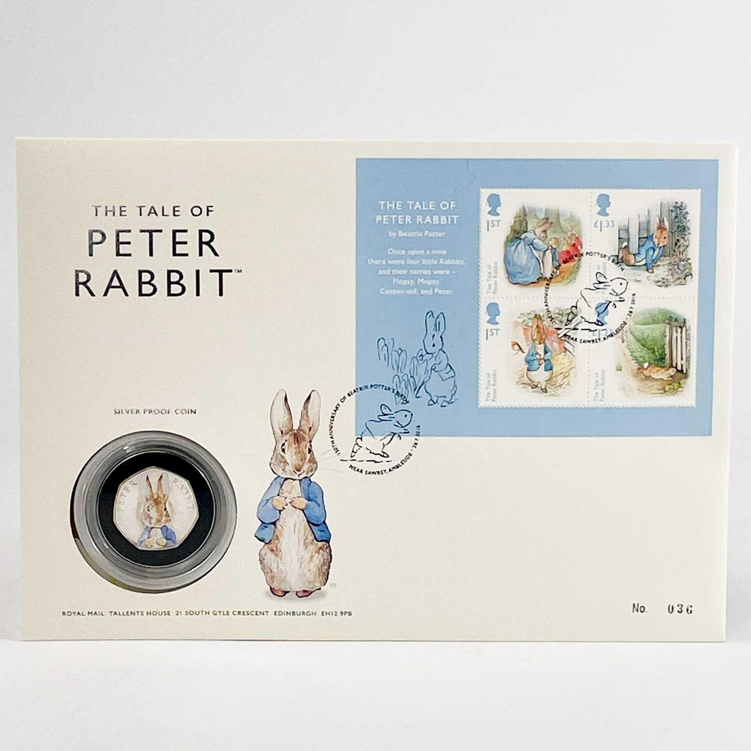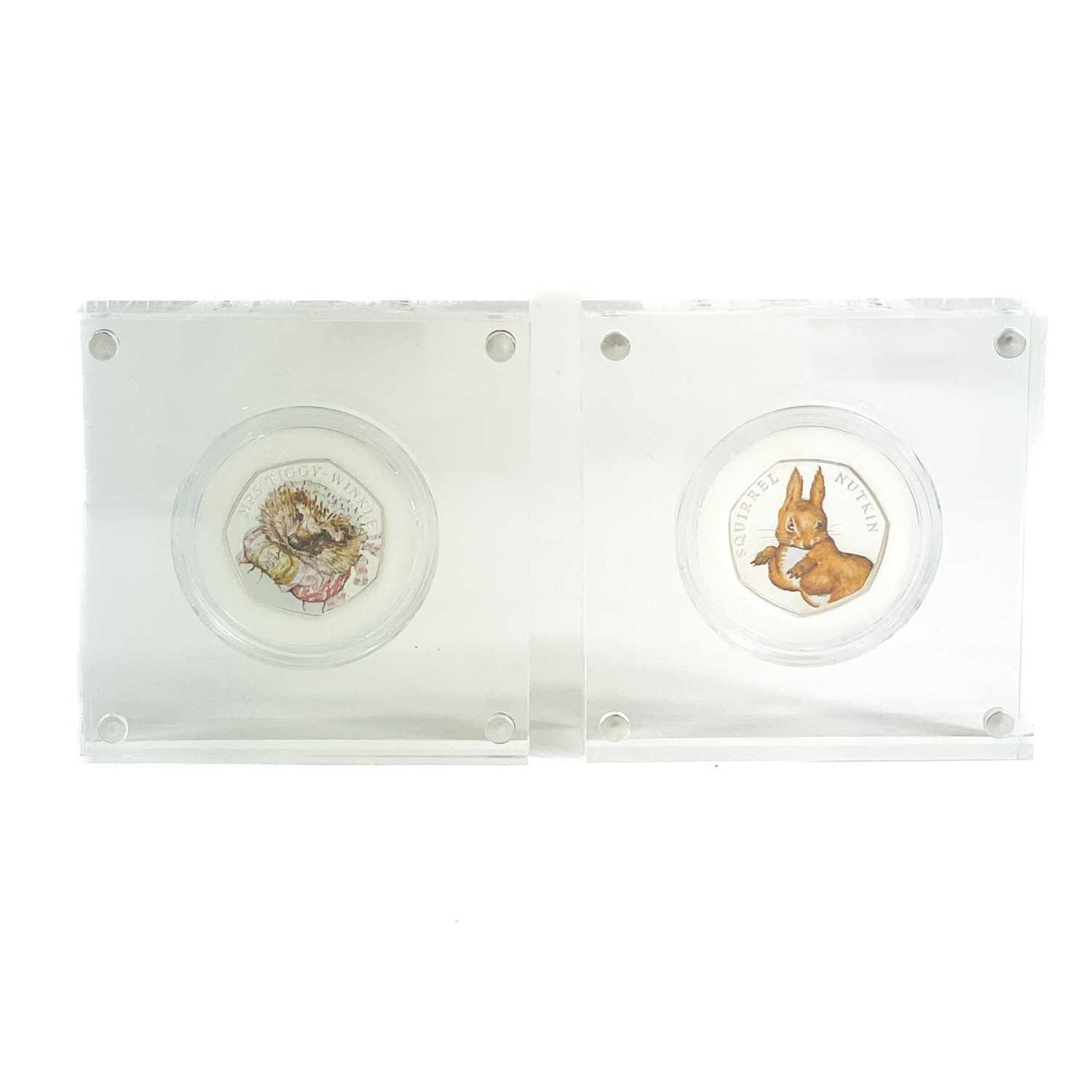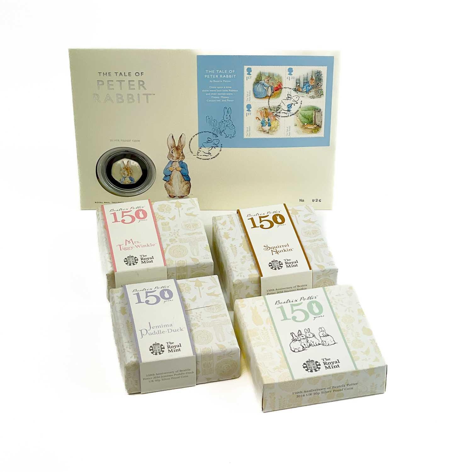 UK 50 pence 2016 Beatrix Potter Royal Mint silver proof coins (x5). Comprising: 1: A colourised Peter Rabbit limited edition 50p silver proof Royal Mint/Royal Mail coin cover. 2: A 150th anniversary silver proof encapsulated boxed Royal Mint pack. 3: 3x colourised Beatrix Potter 50p silver proof characters including Jemima Puddleduck, Mrs Tiggy-Winkle and Squirrel Nutkins all encapsulated in perspex display stand.