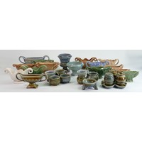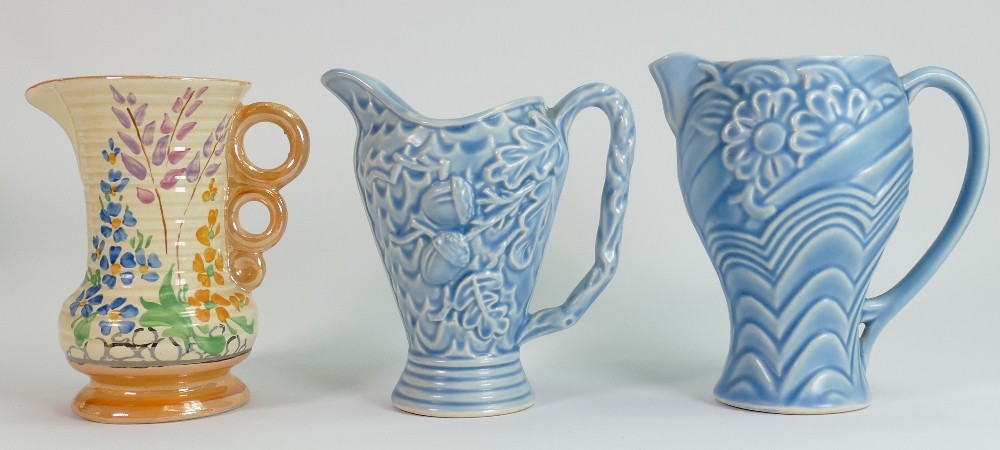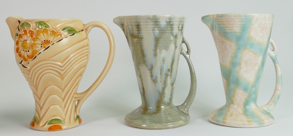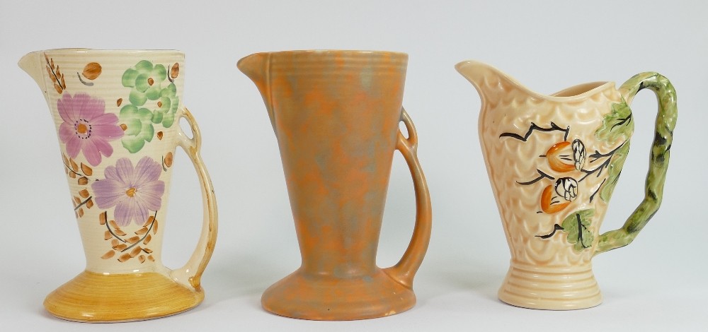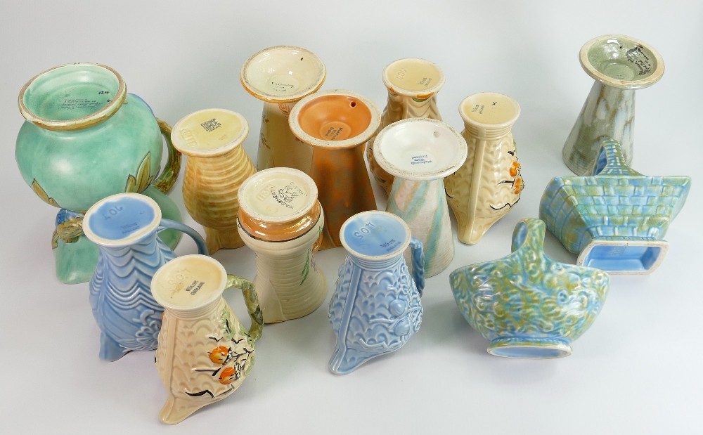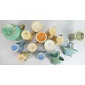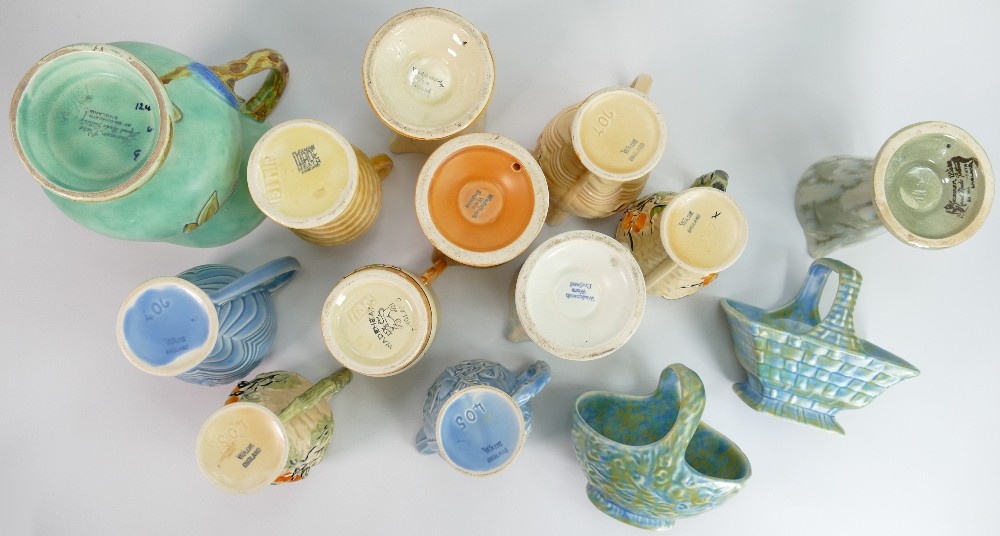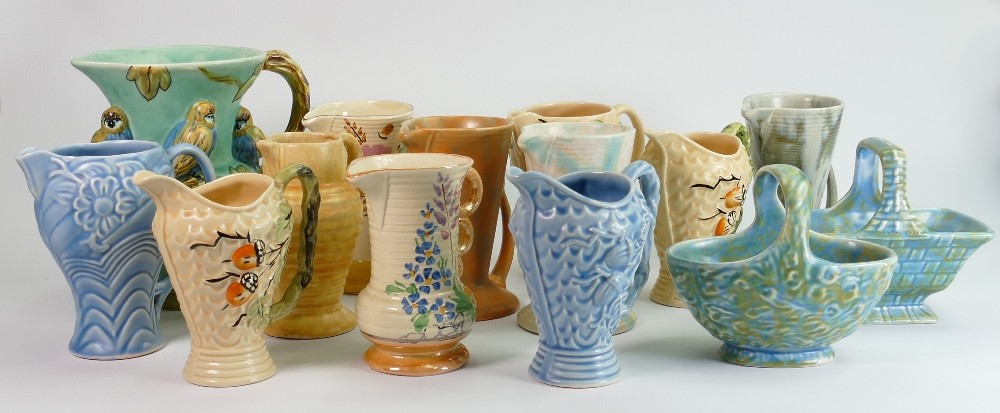 A collection of Wade Art Deco pottery: Including Budgerigar jug and several smaller jugs, baskets etc. (14)