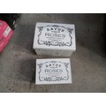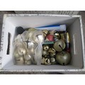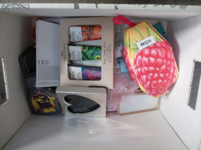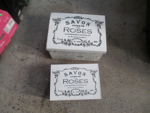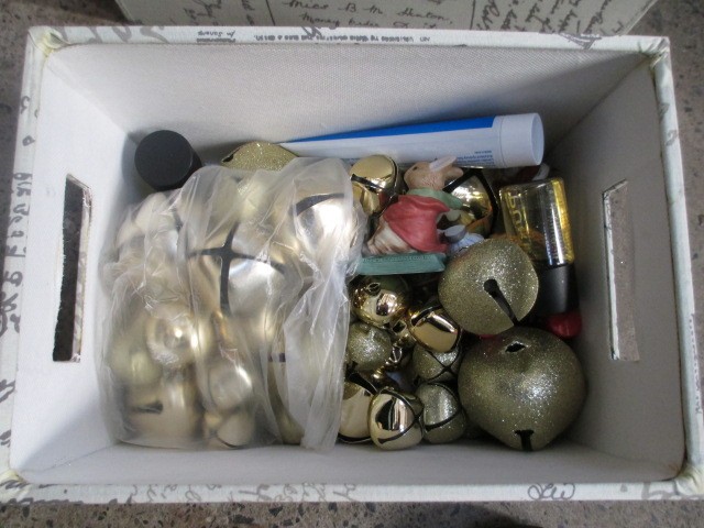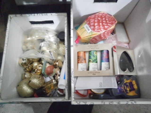 Two modern storage boxes containing cosmetics and Christmas decorations