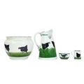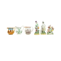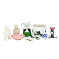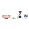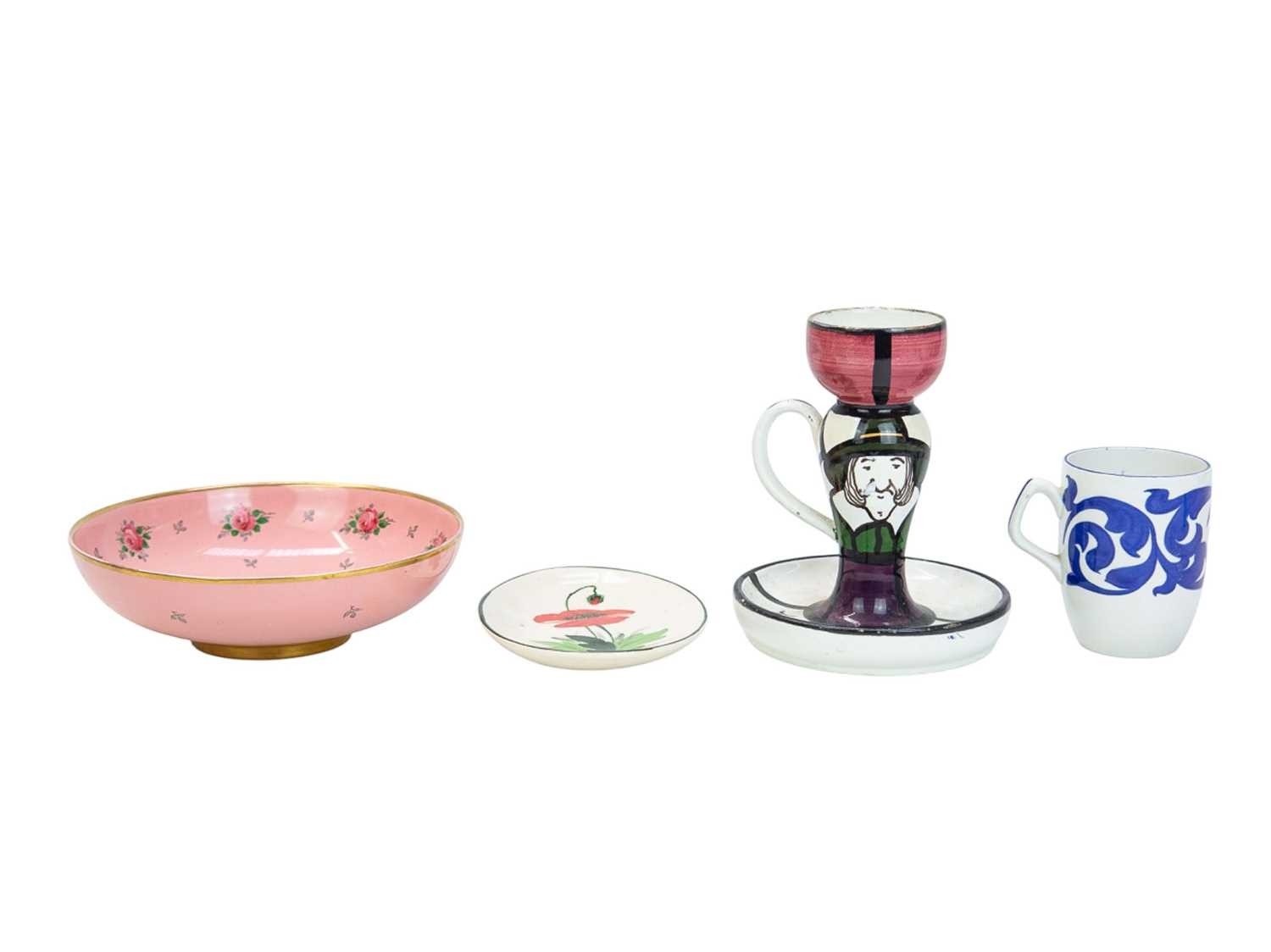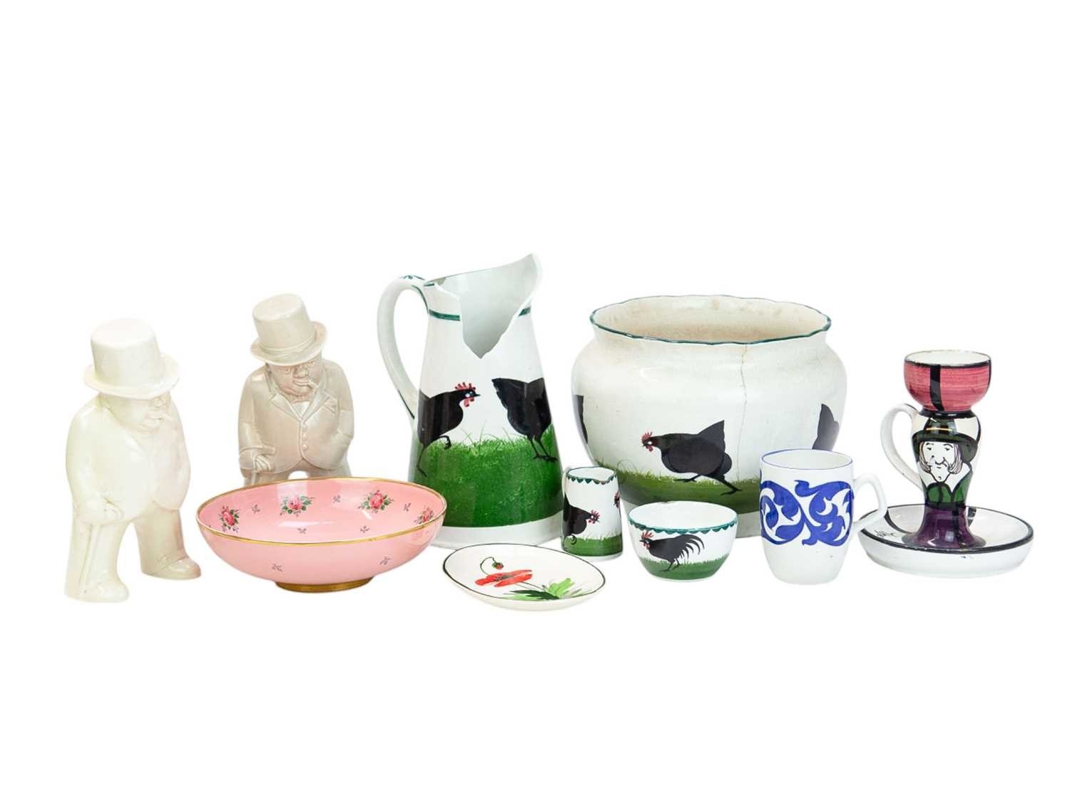 A collection of Bristol pottery. Includes two Churchill figures, a 'leaded lights' chamberstick with motto 'There is no wealth but life', a handpainted pink bowl decorated by Cecil Garland, a handpainted poppy dish and a Royal Cauldron 'Blue Scroll' mug and four pieces of Poutney's Bristol 'Cock & Hen' pottery (10).