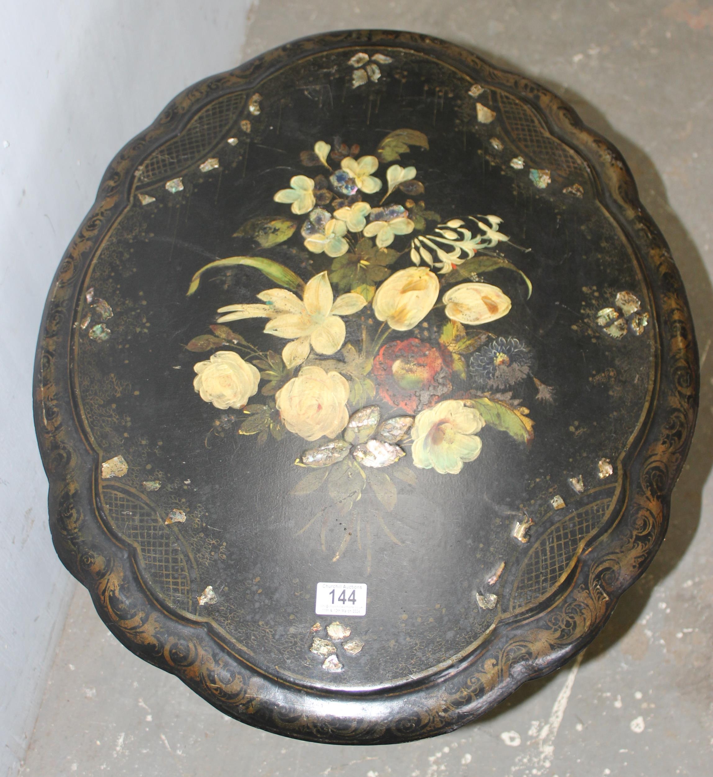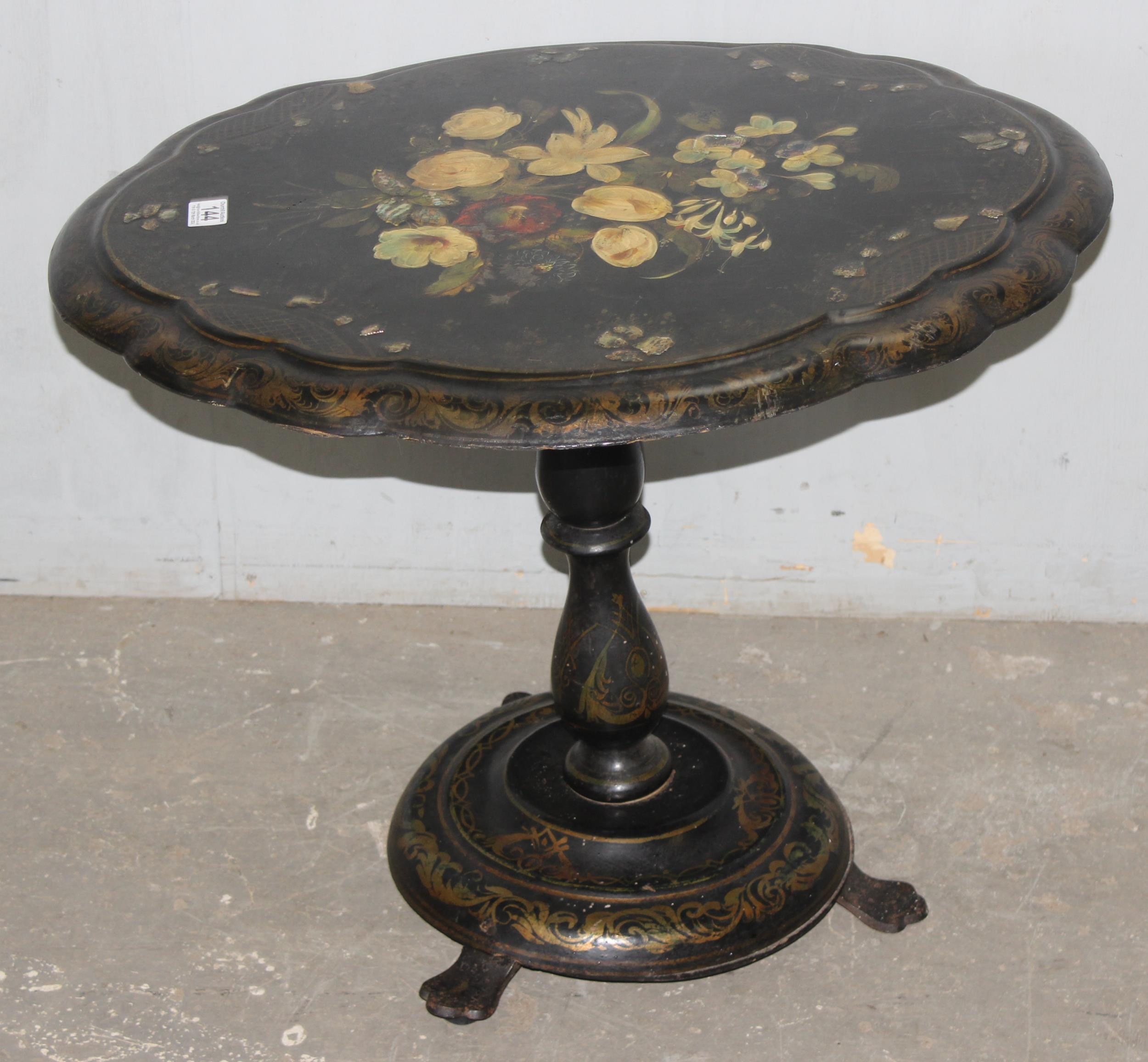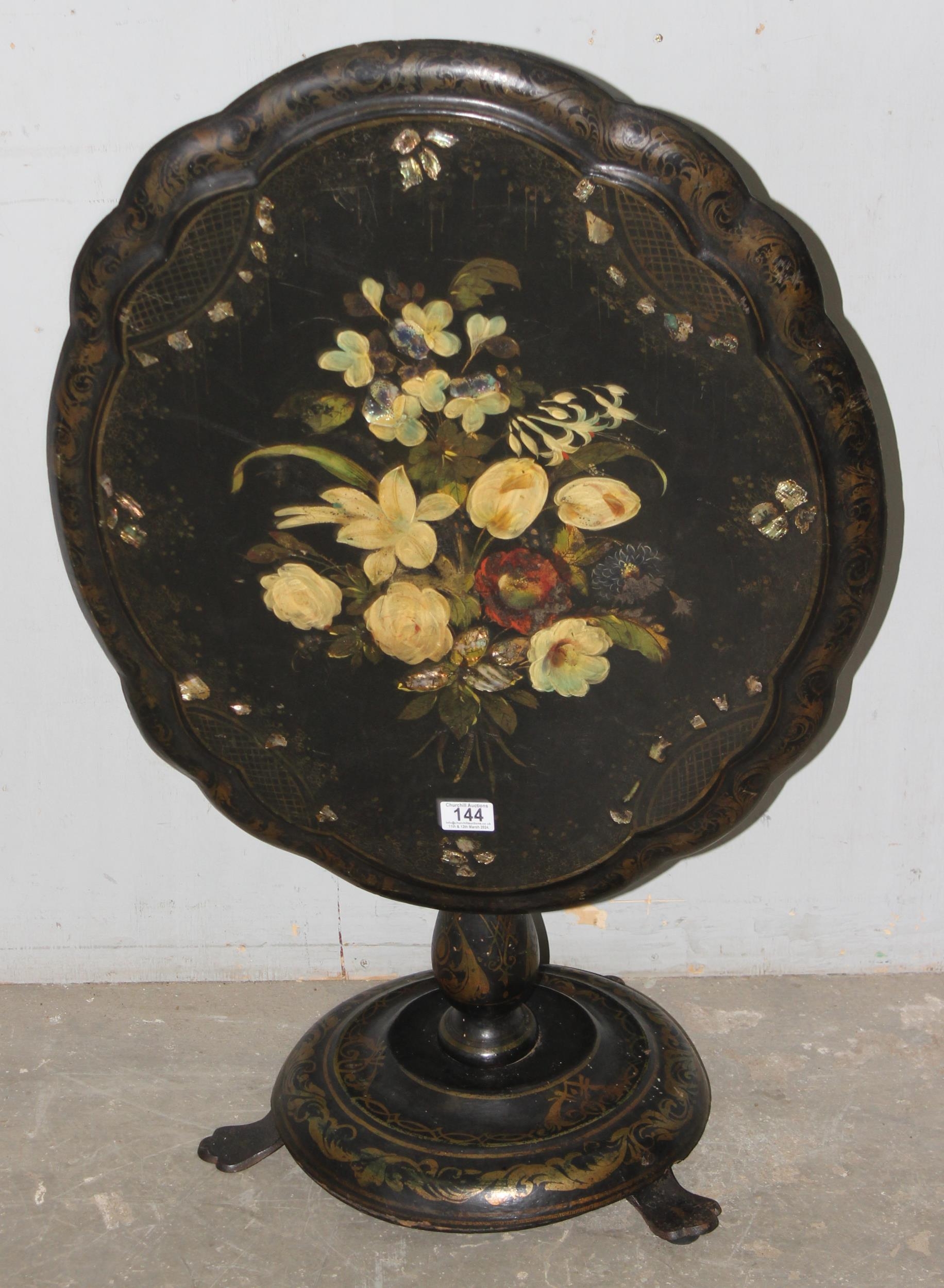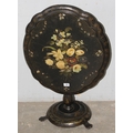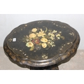 A Victorian til topped papier mache table with hand painted floral decoration, AF, approx 60cm wide x 70cm deep x 60cm tall